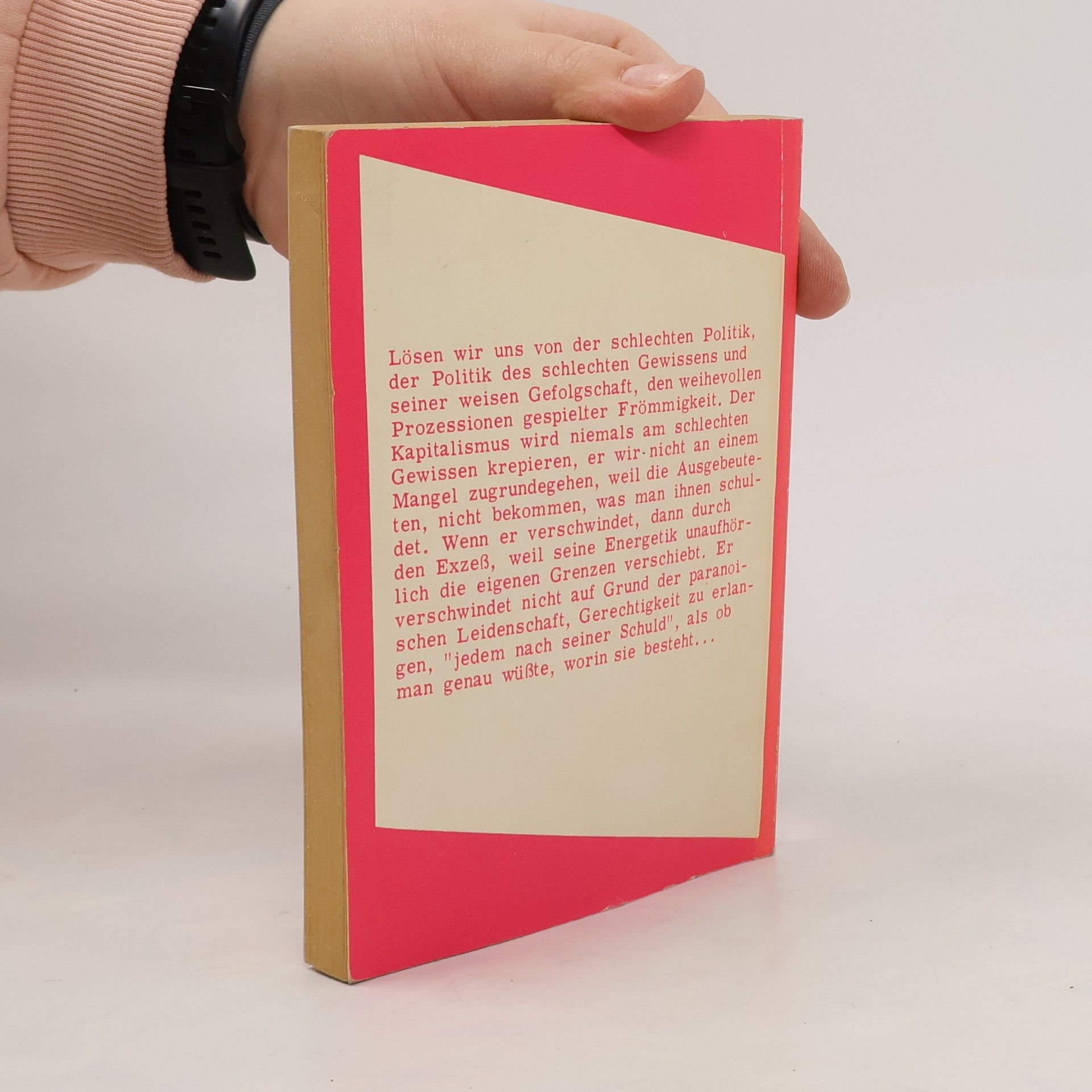 Lösen wir uns von der schlechten Politik, der Politik des schlechten Gewissens und seiner weisen Gefolgschaft, den weihevollen Prozessionen gespielter Frömmigkeit. Der Kapitalismus wird niemals am schlechten Gewissen krepieren, er wir nicht an einem Mangel zugrundegehen, weil die Ausgebeuteten, nicht bekommen, was man ihnen schuldet. Wenn er verschwindet, dann durch den Exzeß, weil seine Energetik unaufhörlich die eigenen Grenzen verschiebt. Er verschwindet nicht auf Grund der paranoischen Leidenschaft, Gerechtigkeit zu erlangen, »jedem nach seiner Schuld«, als ob man genau wüßte, worin sie besteht... »Er ist der große Steuermann des neuen Narrenschiffs. Meister im Denken ... der Lumpen-Intelligentsia. Theoretiker der Intensitäten, des Abdriftens, der Triebe und Dispositive. Barocke Worte für ein politisches Projekt, das sich vom Marxismus absondert und den Sozialismus mit seinem Gefolge von schlechtem Gewissen, Ressentiments und Moralismen auf den Müll wirft.« (Bernard-Henri Lévy) Die vorliegenden Aufsätze sind entnommen aus Des dispositifs pulsionnels (Paris, 1973), von Jean-François Lyotard, aus dem Französischen übersetzt von Lothar Kurzawa und Volker Schaefer. Inhalt: Bernard-Henry Lévy [ sic ], »Ein Barbar spricht vom Sozialismus. Ein Interview mit J.-F. Lyotard «; »Bemerkungen über die Wiederkehr und das Kapital«; »Adorno come diavolo«; »Über eine Figur des Diskurses«; »Energieteufel Kapitalismus«.