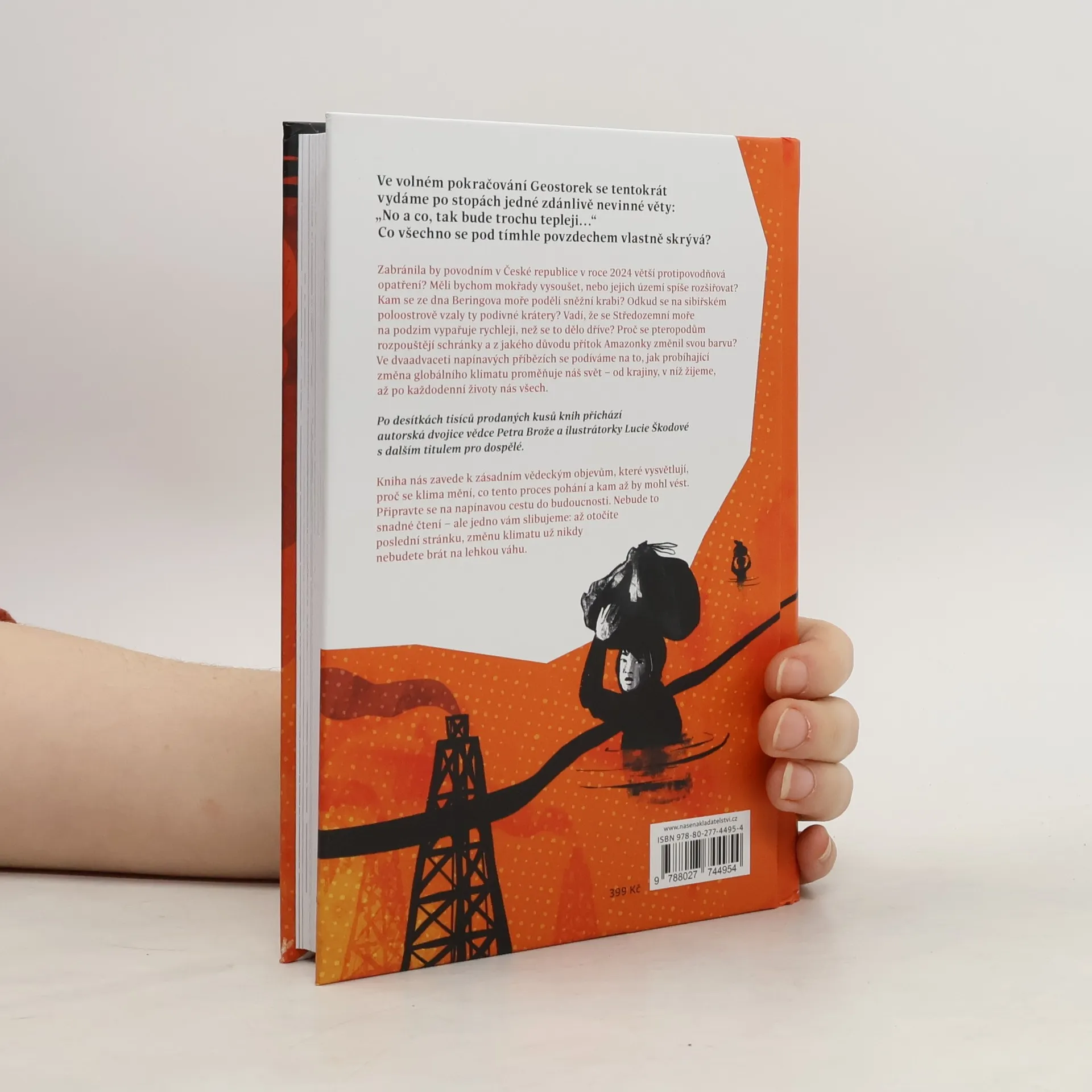 Ve volném pokračování Geostorek se tentokrát vydáme po stopách jedné zdánlivě nevinné věty: „No a co, tak bude trochu tepleji…“ Co všechno se ale pod tímhle povzdechem skrývá?Zabránily by povodním v České republice v roce 2024 větší protipovodňová opatření? Měli bychom mokřady vysoušet, nebo jejich území spíše rozšiřovat? Kam se ze dna Beringova moře poděli sněžní krabi? Odkud se na sibiřském poloostrově vzaly ty podivné krátery? Vadí, že se Středozemní moře na podzim vypařuje rychleji, než se to dělo dříve? Proč se pteropodům rozpouštějí schránky a z jakého důvodu přítok Amazonky změnil svou barvu?Ve dvaadvaceti napínavých příbězích se podíváme na to, jak probíhající změna globálního klimatu proměňuje náš svět – od krajiny, v níž žijeme, až po každodenní životy nás všech.Po desítkách tisíců prodaných kusů svých knih přichází autorská dvojice vědce Petra Brože a ilustrátorky Lucie Škodové s dalším titulem pro dospělé.Kniha nás zavede k zásadním vědeckým objevům, které vysvětlují, proč se klima mění, co tento proces pohání a kam až by mohl vést. Připravte se na napínavou cestu do budoucnosti. Nebude to snadné čtení – ale jedno vám slibujeme: až otočíte poslední stránku, změnu klimatu už nikdy nebudete brát na lehkou váhu.