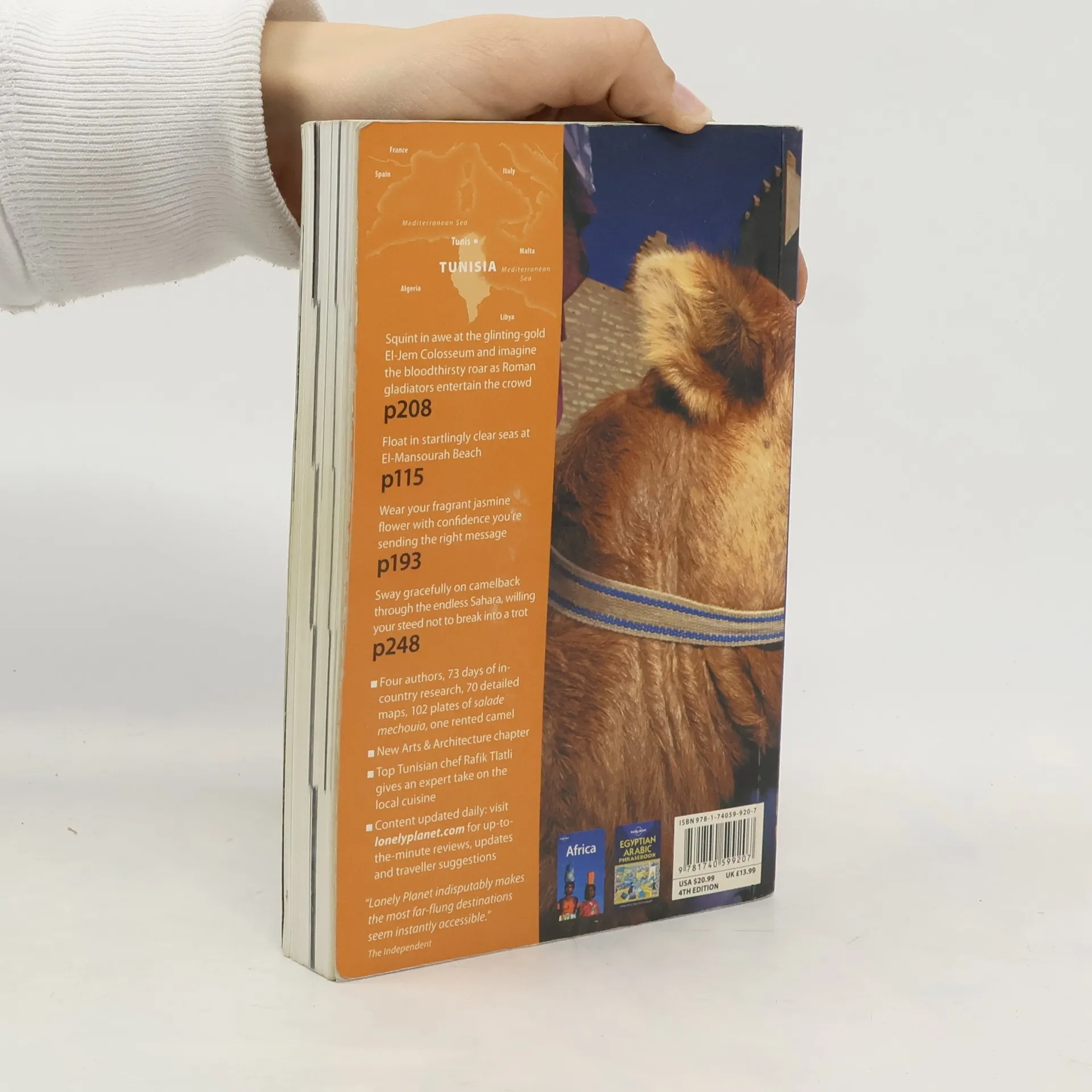 Discover TunisiaSquint in awe at the glinting-gold El-Jem Colosseum and imagine the bloodthirsty roar as Roman gladiators entertain the crowd.Float in startlingly clear seas at El-Mansourah Beach.Wear your fragrant jasmine flower with confidence you're sending the right message.Sway gracefully on camelback through the endless Sahara, willing your steed not to break into a trot.In This GuideFour authors, 73 days of in-country research, 70 detailed maps, 102 plates of salade mechouia, one rented camel.New Arts & Architecture chapter.Top Tunisian chef Rafik Tlatli gives an expert take on the local cuisine.Content updated visit lonelyplanet.com for up-to-the-minute reviews, updates and traveler suggestions.