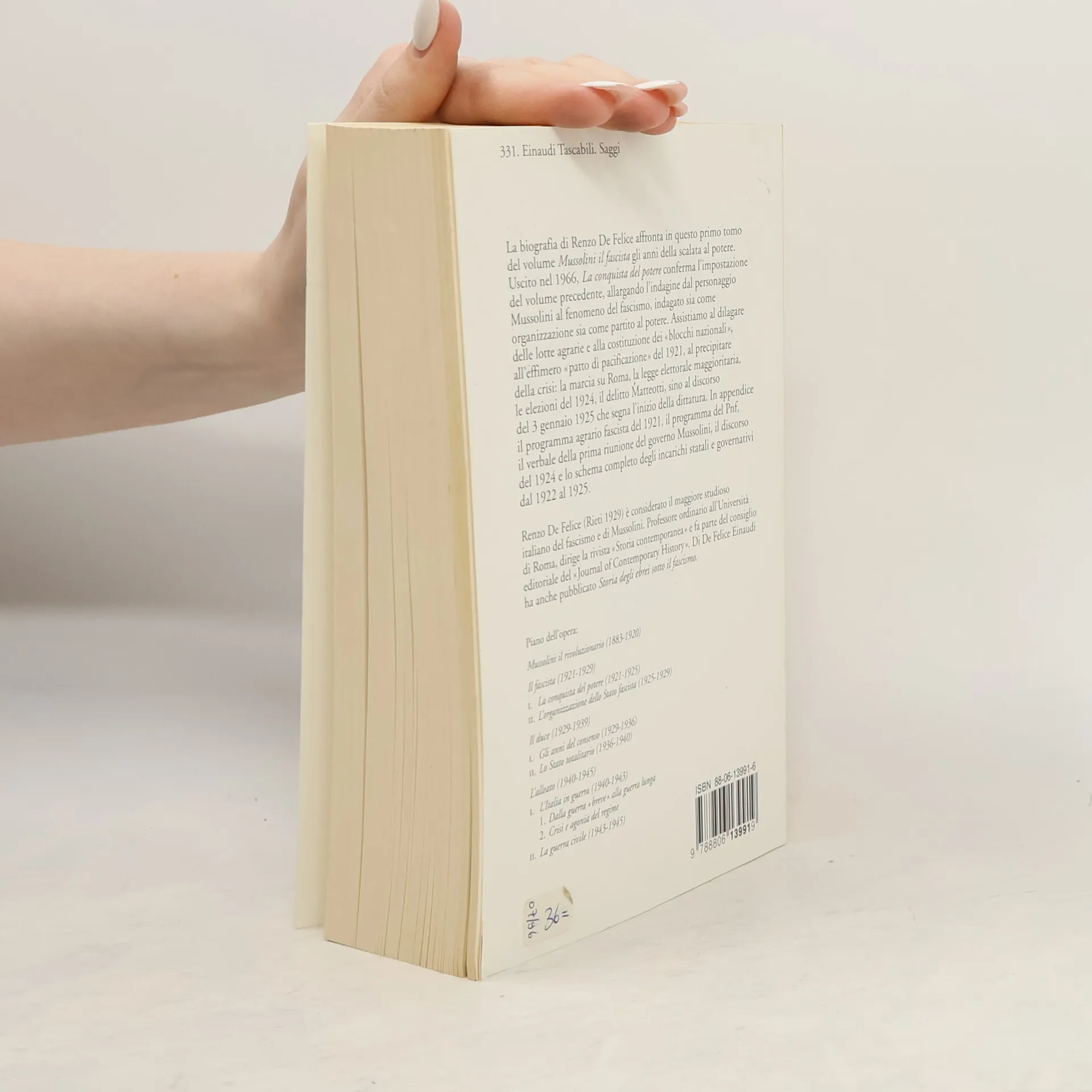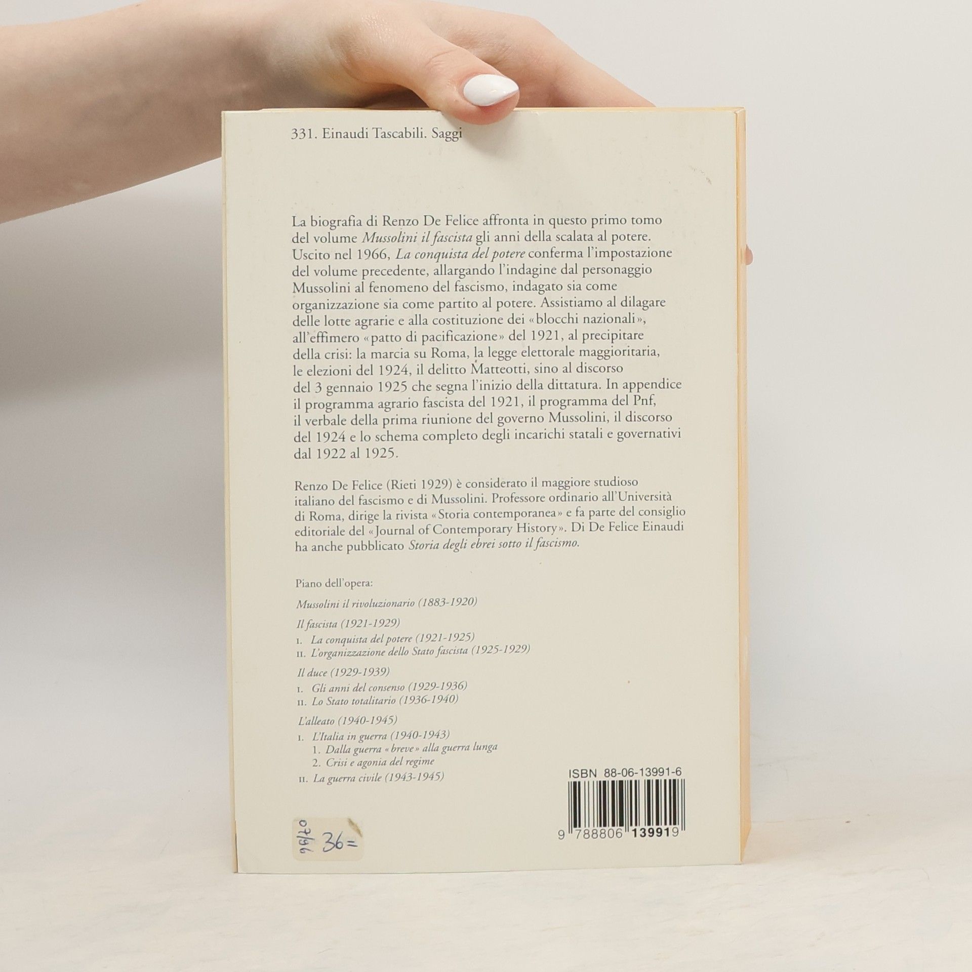 Dal fascismo agrario al delitto Matteotti: gli anni della scalata al potere. Uscito nel 1966, questo primo tomo del volume Mussolini il fascista conferma l’impostazione del volume precedente, allargando l’indagine dal personaggio Mussolini al fenomeno del fascismo, indagato sia come organizzazione sia come partito al potere. Assistiamo al dilagare delle lotte agrarie e alla costituzione dei «blocchi nazionali», all’effimero «patto di pacificazione» del 1921, al precipitare della crisi: la marcia su Roma, la legge elettorale maggioritaria, le elezioni del 1924, il delitto Matteotti, sino al discorso del 3 gennaio 1925 che segna l’inizio della dittatura. In appendice il programma agrario fascista del 1921, il programma del Pnf, il verbale della prima riunione del governo Mussolini, il discorso del 1924 e lo schema completo degli incarichi statali e governativi dal 1922 al 1925.