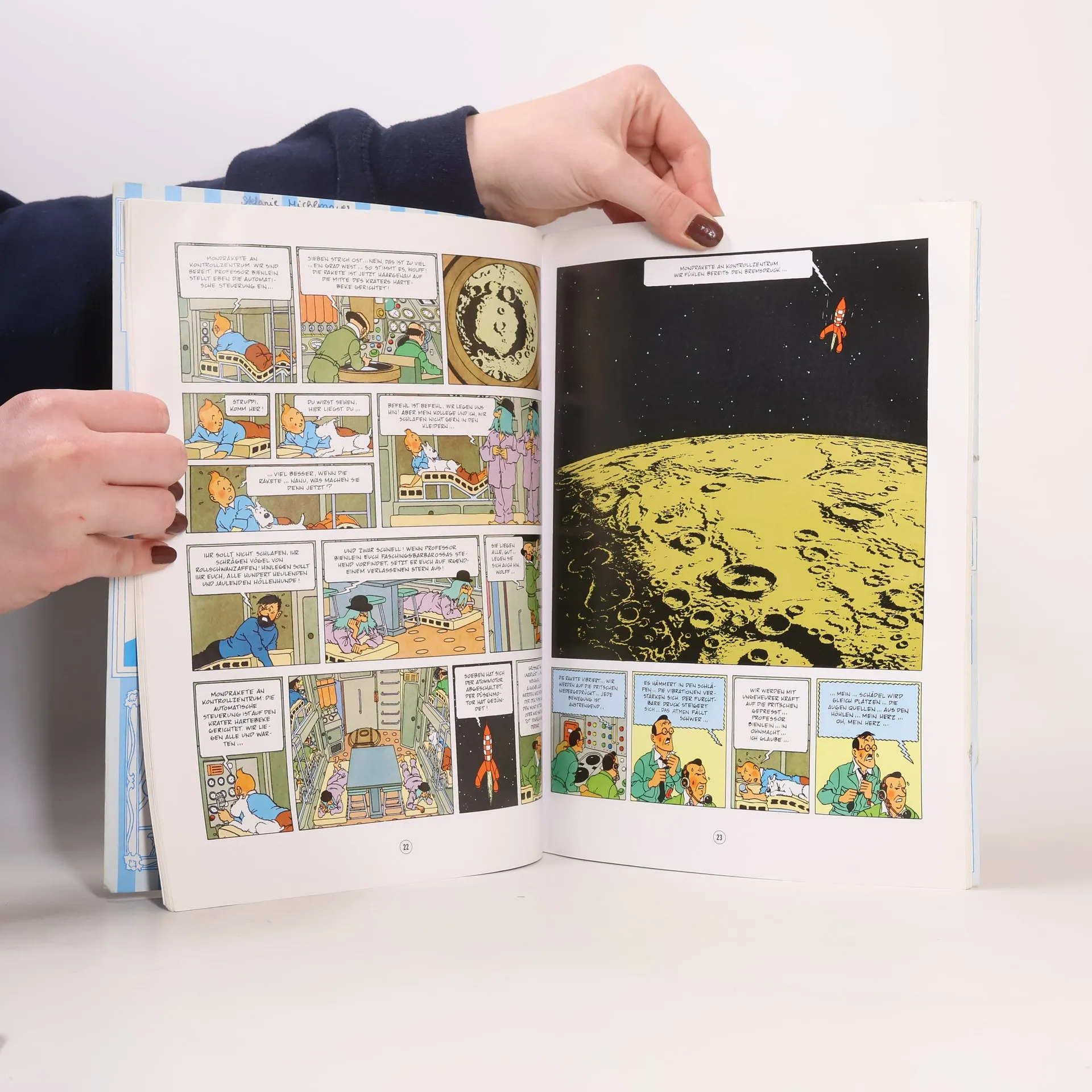 Tolle Abenteuer für Leseanfänger Das Experiment ist geglückt! Vom Kernforschungszentrum Sbrodj in Syldavien aus fliegen Professor Bienlein, Tim, Haddock und der Ingenieur Wolff als erste Menschen mit einer Rakete zum Mond. Doch es gibt noch zwei weitere, unfreiwillige Reiseteilnehmer: Aus lauter Trotteligkeit sind die Detektive Schulze und Schultze beim Start mit an Bord geblieben. Und für sechs Astronauten werden die Sauerstoffvorräte wohl kaum bis zur Rückkehr reichen... Dieser Band enthält den zweiten Teil eines Doppelabenteuers, das in „Reiseziel Mond“ beginnt. Ein Comic-Klassiker für Kinder und Erwachsene Die Comichefte von Tim und Struppi sind klassische Abenteuergeschichten , die für Kinder ab 8 Jahren geeignet sind. Sie sind spannend, fantasievoll und deshalb auch für Erstleser zum Lesen lernen genau das Richtige. Auf der ganzen Welt lesen Kinder die Abenteuer von Tim und Struppi, eine der bekanntesten Comic-Serien überhaupt. Seit über 90 Jahren begeistern Tim und seine Freunde Leser aller Altersklassen, die gespannt verfolgen, wie Tim, Struppi, Kapitän Haddock, Professor Bienlein oder Schultze und Schulze fiesen Typen das Handwerk legen. Wie flucht Käpt'n Haddock immer so gern? Mast- und Schotbruch! Auf ins Abenteuer!