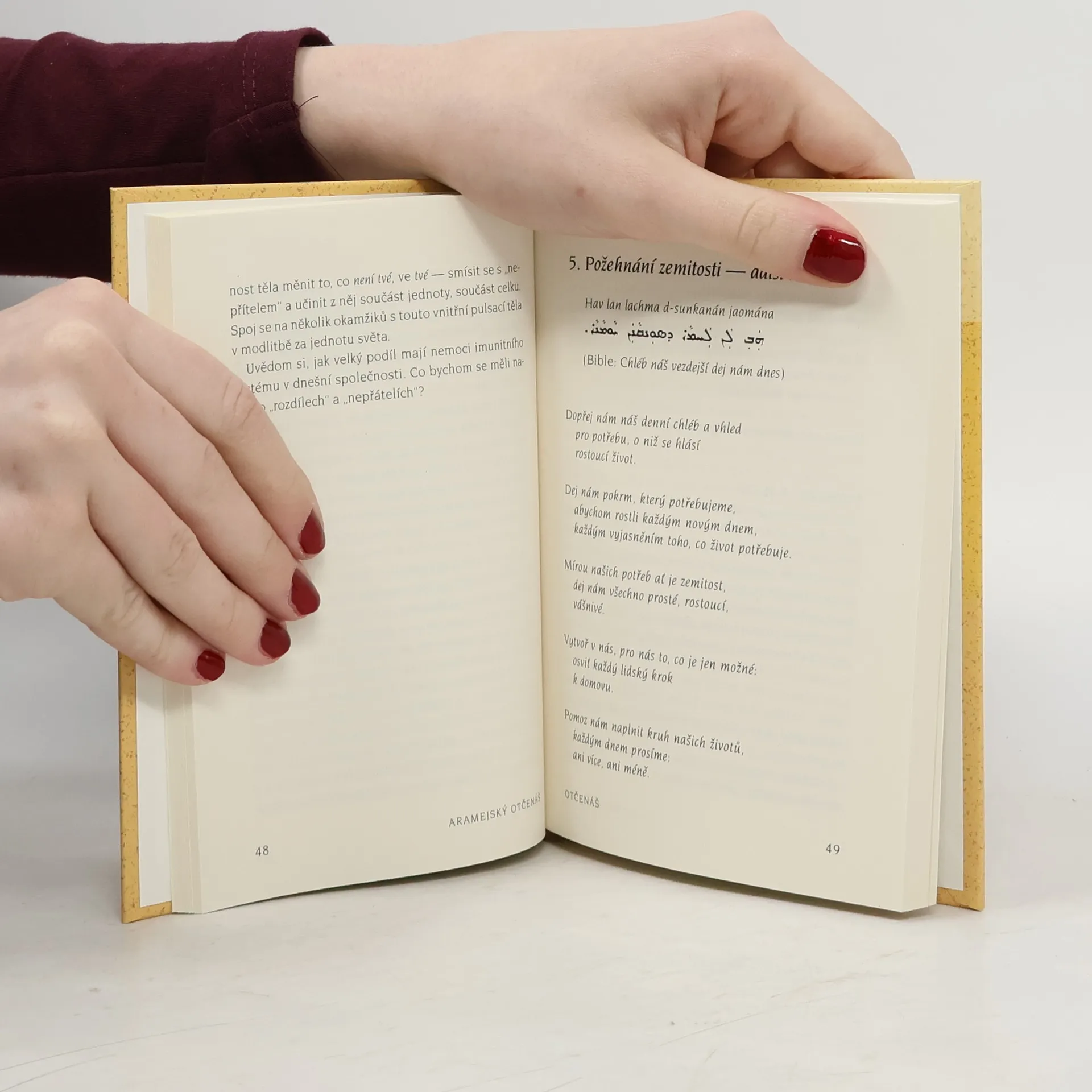 Duchovní tradice Blízkého východu poukazují na to, že na každou větu svatých učení je třeba nahlížet alespoň ze tří hledisek: intelektuálního, metaforického a universálního (nebo mystického). Z prvního zvažujeme vnější, doslovný význam, z druhého zkoumáme, jakým způsobem se nám příběh může stát podobenstvím pro náš život nebo život společnosti. Z třetího dospíváme k prožití pravdy, na niž zkoumaná věta Písma míří. Tady musíme jít až za slovní pochopení a obsáhnout i bezeslovnou zkušenost, na kterou živá slova mystiků ukazují. Pro mystika z Blízkého východu, jako byl Ježíš, se tato hlediska navzájem nevylučují. Je proto dobré mít na paměti všechny možné významy posvátných slov modliteb a nechat je na sebe působit. Podle Fabre d’Oliveta spočívá tragédie moderních překladů bible přes řečtinu, jazyk zcela odlišný od hebrejštiny a aramejštiny Ježíšova původního jazyka, v důsledném okleštění mnoha významových rovin jednotlivých výroků pouze na materiální a zcela konkrétní pojmy. Na rozdíl od řečtiny nemá aramejština žádnou ostrou dělící čáru mezi prostředkem a účelem, mezi vnitřní kvalitou a vnějším jednáním. Svévolné hranice mezi „rozumem“, „tělem“ a „duchem“ zde vůbec nejsou přítomny. Nepřirozené vzájemné odloučení Boha, přírody a člověka, neznámé lidem, kteří žili svázáni se zemí, se vplížilo i do našeho jazyka. Ve srovnání s řečtinou a našimi moderními jazyky skýtá aramejština plynoucí a celostní vizi kosmu. Překlad Otčenáše, Blahoslavení a tří dalších Ježíšových výroků z evangelií z aramejštiny, původního Ježíšova jazyka, pořídil Neil Douglas-Klotz. Originální aramejský text, komentáře a modlitby těla. Předmluva Matthew Fox.