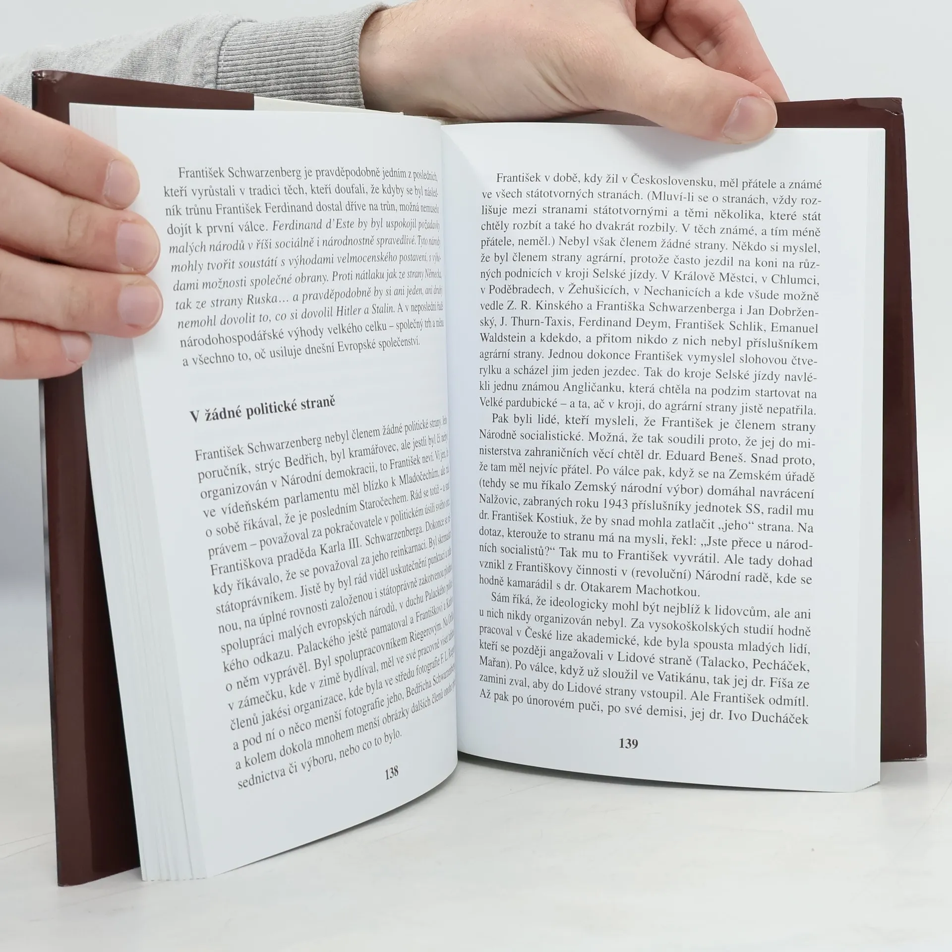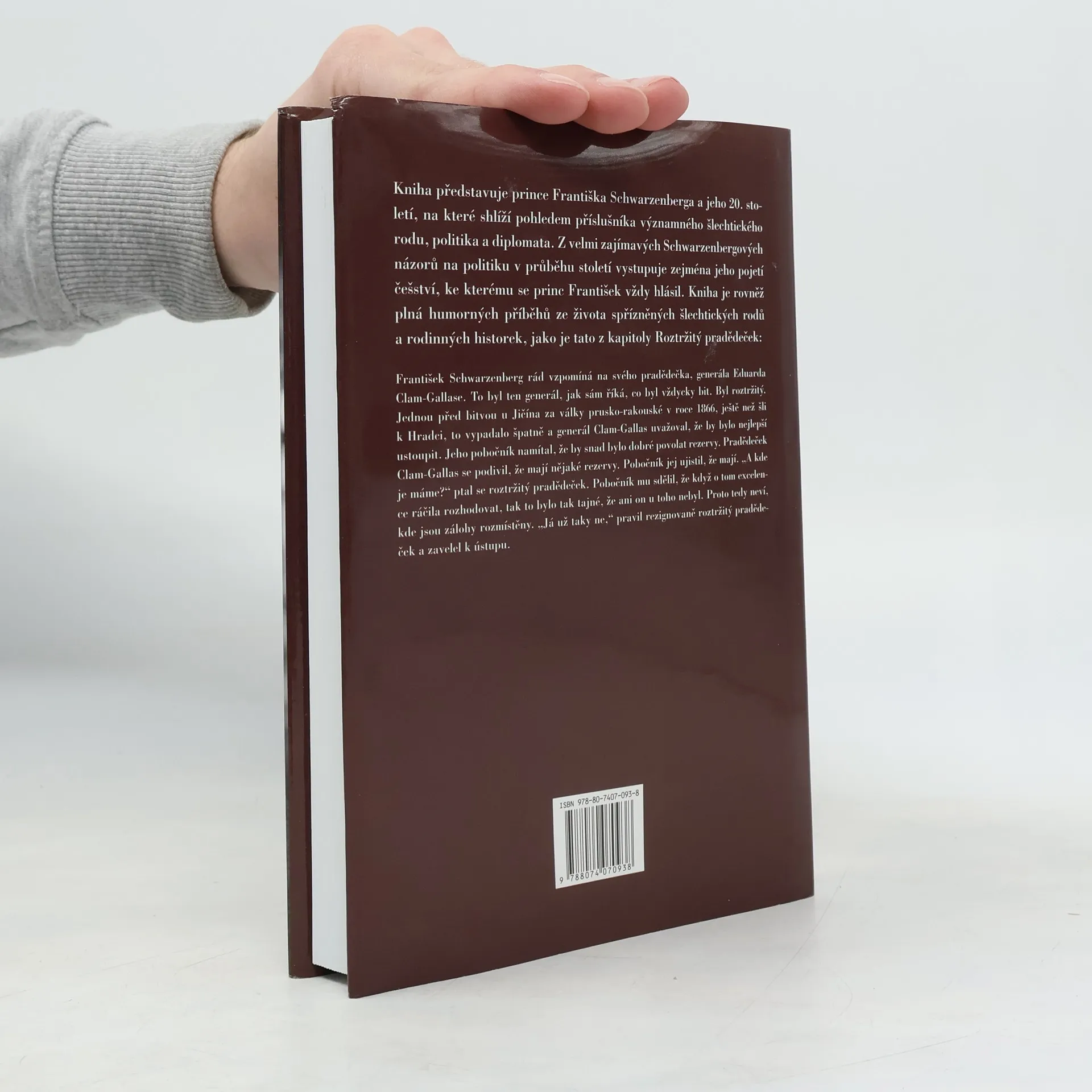Kniha představuje prince Františka Schwarzenberga a jeho 20. století, na které shlíží pohledem příslušníka významného šlechtického rodu, politika a diplomata. Z velmi zajímavých Schwarzenbergových názorů na politiku v průběhu století vystupuje zejména jeho pojetí češství, ke kterému se princ František vždy hlásil. Kniha je rovněž plná humorných příběhů ze života spřízněných šlechtických rodů a rodinných historek, jako je tato z kapitoly Roztržitý pradědeček: František Schwarzenberg rád vzpomíná na svého pradědečka, generála Eduarda Clam-Gallase. To byl ten generál, jak sám říká, co byl vždycky bit. Byl roztržitý. Jednou před bitvou u Jičína za války prusko-rakouské v roce 1866, ještě než šli k Hradci, to vypadalo špatně a generál Clam-Gallas uvažoval, že by bylo nejlepší ustoupit. Jeho pobočník namítal, že by snad bylo dobré povolat rezervy. Pradědeček Clam-Gallas se podivil, že mají nějaké rezervy. Pobočník jej ujistil, že mají. „A kde je máme?“ ptal se roztržitý pradědeček. Pobočník mu sdělil, že když o tom excelence ráčila rozhodovat, tak to bylo tak tajné, že ani on u toho nebyl. Proto tedy neví, kde jsou zálohy rozmístěny. „Já už taky ne,“ pravil rezignovaně roztržitý pradědeček a zavelel k ústupu.