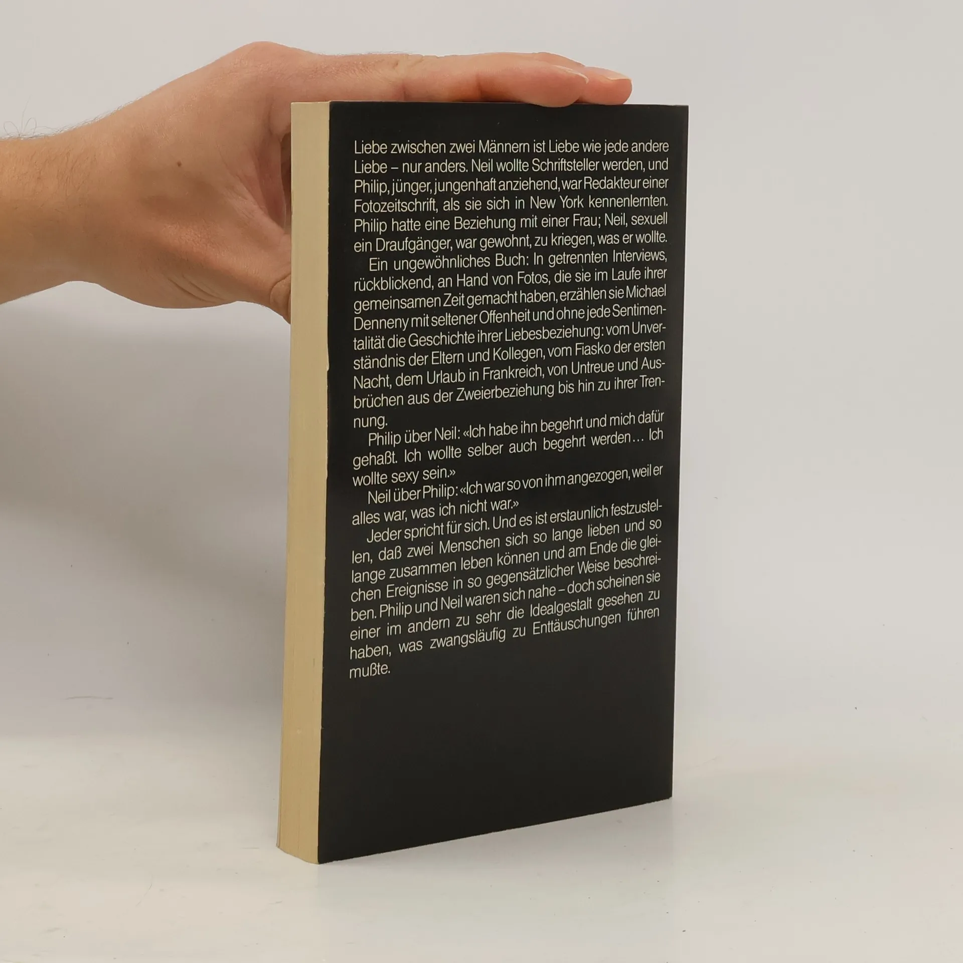Liebe zwischen zwei Männern ist Liebe wie jeder andere Liebe--nur anders. Neil wollte Schriftsteller werden, und Philip, jünger, jungenhaft anziehend, war Redakteur einer Fotozeitschrift, als sie sich in New York kennenlernten. Philip hatte eine Beziehung mit einer Frau; Neil, sexuell ein Draufgänger, war gewohnt, zu kriegen, was er wollte. Ein ungewöhnliches Buch: in getrennten Interviews, rückblickend, an Hand von Fotos, die sie im Laufe ihrer gemeinsamen Zeit gemacht haben, erzählen sie Michael Denneny mit seltener Offenheit und ohne jede Sentimentalität die Geschichte ihrer Liebesbeziehung: vom Unverständnis der Eltern und Kollegen, vom Fiasko der ersten Nacht, dem Urlaub in Frankreich, von Untreue und Ausbrüchen aus der Zweierbeziehung bis hin zu ihrer Trennung. Philip über Neil: "Ich habe ihn begehrt und mich dafür gehasst. Ich wollte selber auch begehrt werden. Ich wollte sexy sein." Neil über Philip: "Ich war so von ihm angezogen, weil er alles war, was ich nicht war." Jeder spricht für sich. Und es ist erstaunlich festzustellen, daß zwei Menschen sich so lange lieben und so lange zusammen leben können und am Ende die gleichen Ereignisse in so gegensätzlicher Weise beschreiben. Philip und Neil waren sich nahe--doch scheinen sie einer im andern zu sehr die Idealgestalt gesehen zu haben, was zwangsläufig zu Enttäuschungen führen musste.--Back cover