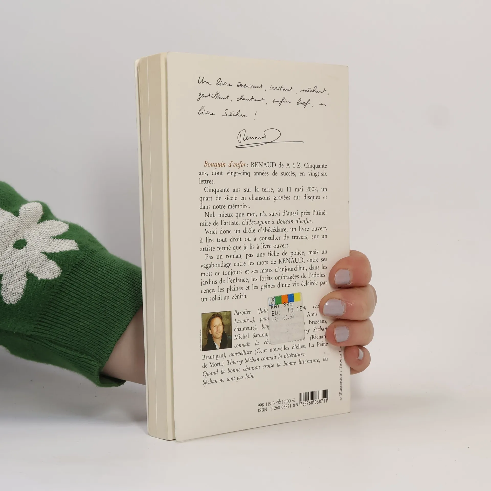 "Bouquin d'enfer" : RENAUD de A à Z. Cinquante ans, dont vingt-cinq années de succès, en vingt-six lettres. Cinquante ans sur la Terre, au 11 mai 2002, un quart de siècle en chansons gravées sur disques et dans notre mémoire. Nul, mieux que moi, n'a suivi d'aussi près l'itinéraire de l'artiste, d'"Hexagone" à "Boucan d'enfer."Voici donc un drôle d'abécédaire, à lire tout droit ou à consulter de travers, sur un artiste fermé que je lis à livre ouvert. Pas un roman, pas une fiche de police, mais un vagabondage entre les mots de RENAUD, entre ses mots de toujours et ses maux d'aujourd'hui, dans les jardins de l'enfance, les forêts ombragées de l'adolescence, les plaines et les peines d'une vie éclairée par un soleil au zénith.