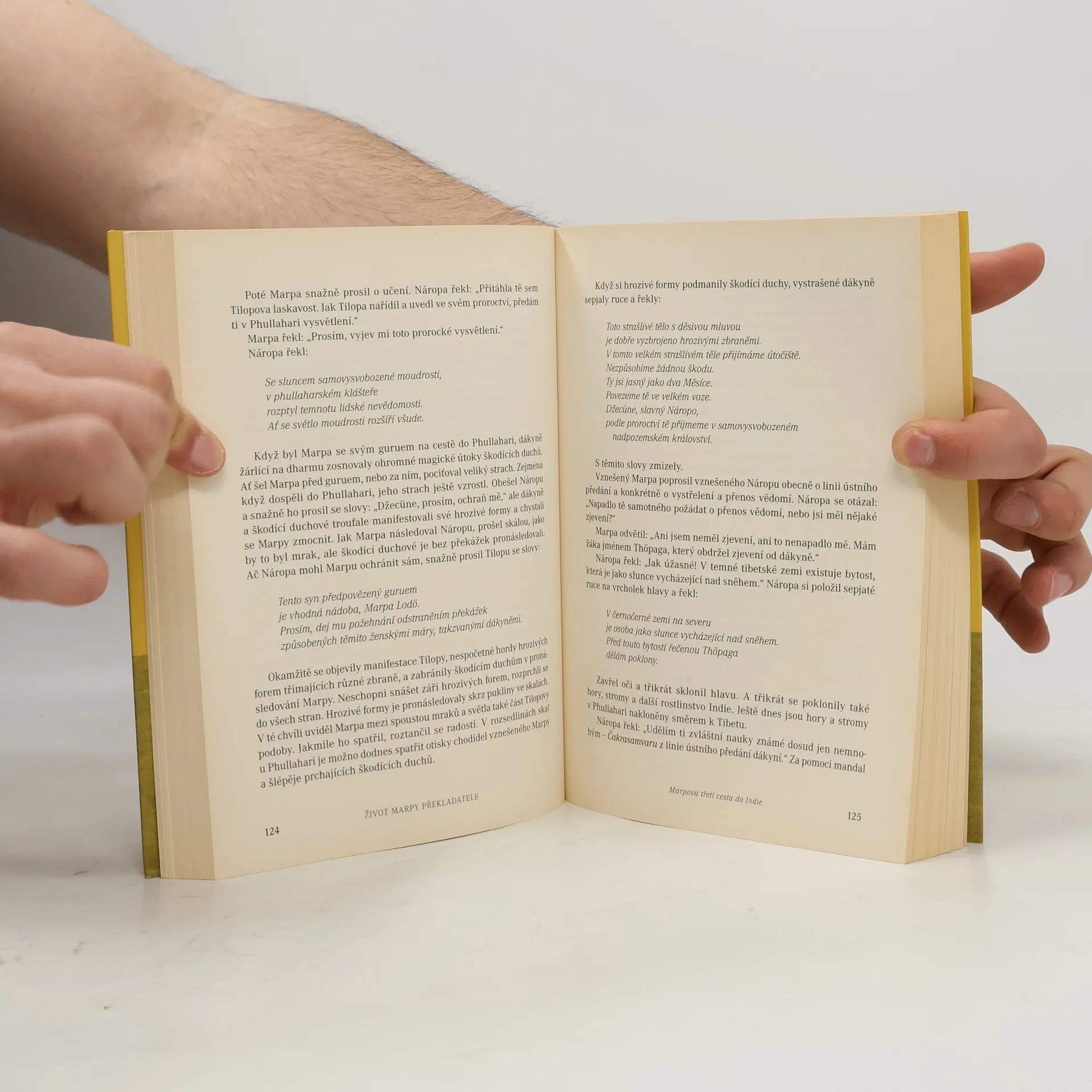 Marpa Překladatel, farmář, učenec a učitel z jedenáctého století, je jedním z nejznámějších meditačních mistrů v historii tibetského buddhismu. Na Západě je Marpa nejlépe znám díky svému učiteli, indickému jogínovi Náropovi, a díky svému nejbližšímu žáku Milarepovi. Tento jasný a dojemný překlad textu, který provedl autor děl Život Milarepy a Sto tisíc písní Milarepy, dokumentuje fascinující život Marpy, jenž byl narozdíl od jiných tibetských mistrů laikem, obratným obchodníkem, který vedl své žáky v dharmě a přitom se staral o rodinu. V mládí byl Marpa inspirován, aby se vydal do Indie studovat buddhistická učení, neboť v Tibetu byl tou dobou buddhismus na ústupu kvůli nemilosrdnému útlaku na popud tehdejšího krále Langdarmy. Autor vykreslil živý obraz tří Marpových cest do Indie: nejisté horské útesy, pusté pláně hemžící se bandity, chamtiví celníci a výběrčí daní. Marpa zakusil mnohé útrapy, ale to nebylo nic ve srovnání se zkouškami, jež následovaly u jeho gurua Náropy a dalších učitelů. Přesto se Marpovi podařilo zvládnout tantrická učení, přeložit je a přinést do Tibetu a založit linii praxe Kagjüpů, která pokračuje až dodnes.