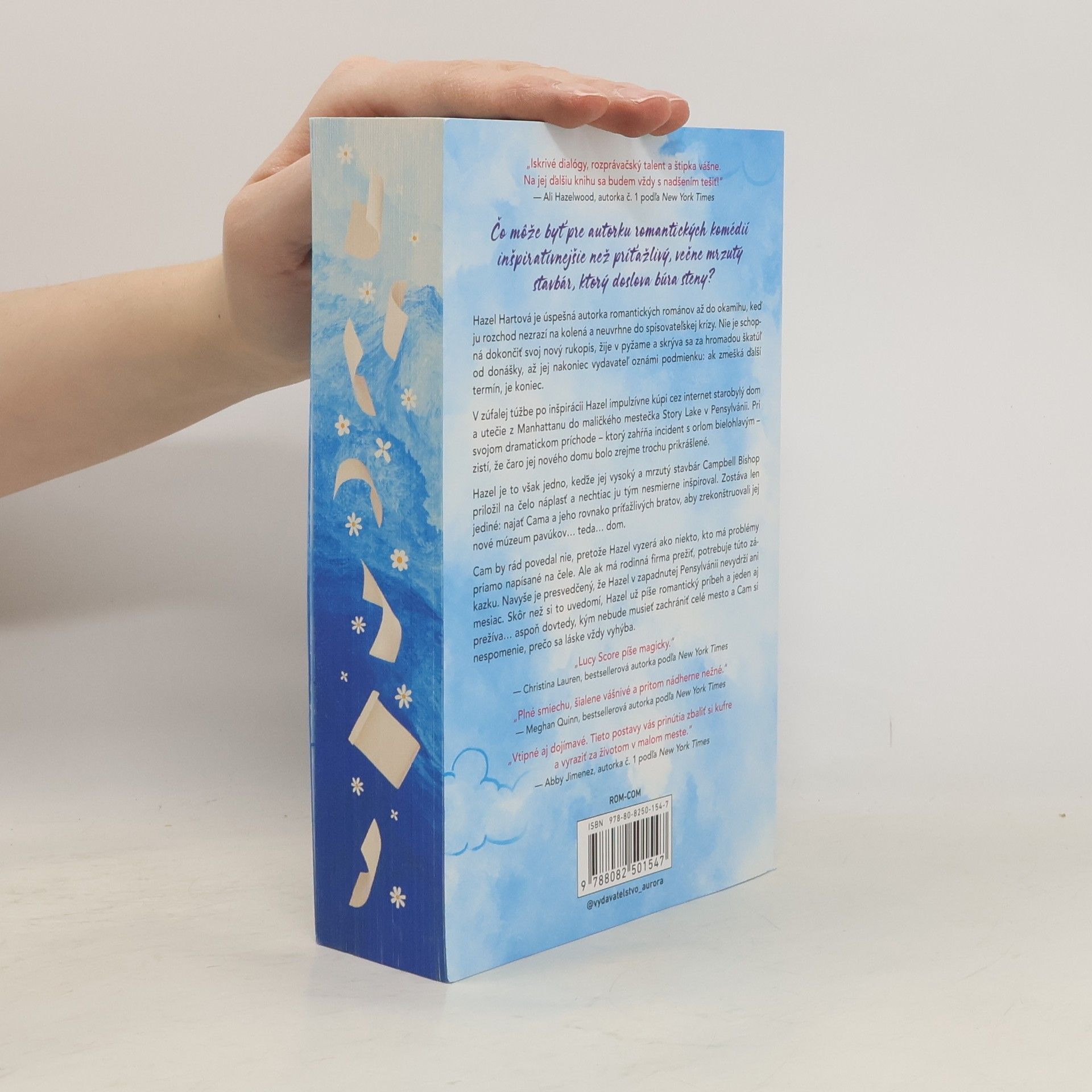 Čo môže byť pre autorku romantických komédií inšpiratívnejšie než príťažlivý, večne mrzutý stavbár, ktorý doslova búra steny? Hazel Hartová je úspešná autorka romantických románov až do okamihu, keď ju rozchod nezrazí na kolená a neuvrhne do spisovateľskej krízy. Nie je schopná dokončiť svoj nový rukopis, žije v pyžame a skrýva sa za hromadou škatúľ od donášky, až jej nakoniec vydavateľ oznámi podmienku: ak zmešká ďalší termín, je koniec. V zúfalej túžbe po inšpirácii Hazel impulzívne kúpi cez internet starobylý dom a utečie z Manhattanu do maličkého mestečka Story Lake v Pensylvánii. Pri jej dramatickom príchode – ktorý zahŕňa incident s orlom bielohlavým – zistí, že čaro jej nového domu bolo zrejme trochu prikrášlené. Hazel je to však jedno, keďže jej vysoký a mrzutý stavbár Campbell Bishop priložil na čelo náplasť a nechtiac ju tým nesmierne inšpirovalo. Zostáva len jediné: najať Cama a jeho rovnako príťažlivých bratov, aby zrekonštruovali jej nové múzeum pavúkov… teda… dom. Cam by rád povedal nie, pretože Hazel vyzerá ako niekto, kto má problémy priamo napísané na čele. Ale ak má rodinná firma prežiť, potrebuje túto zákazku. Navyše je presvedčený, že Hazel v zapadnutej Pensylvánii nevydrží ani mesiac. Skôr než si to uvedomí, Hazel už píše romantický príbeh a jeden aj prežíva… aspoň dovtedy, kým nebude musieť zachrániť celé mesto a Cam si nespomenie, prečo sa láske vždy vyhýba.