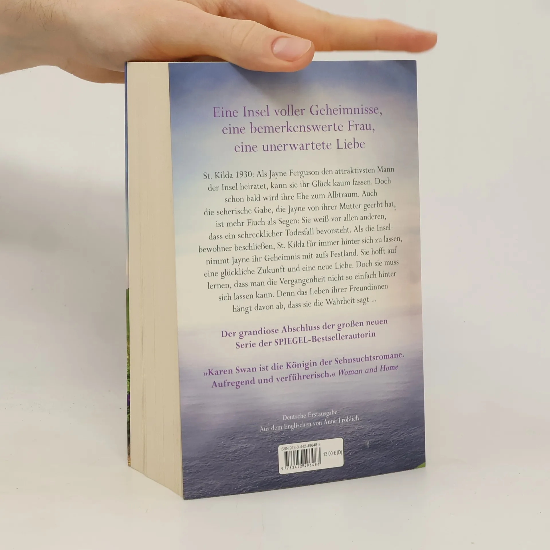 Eine Insel voller Geheimnisse, eine bemerkenswerte Frau, eine unerwartete Liebe St. Kilda 1930: Jayne Ferguson ist mit dem attraktivsten Mann der Insel verheiratet und hat die seherische Gabe ihrer Mutter geerbt. Doch beides ist mehr Fluch als Segen. In ihrer Ehe fühlt sie sich gefangen, und sie weiß vor allen anderen, wenn ein Unglück droht. Nachdem das Schicksal einmal mehr zugeschlagen hat, findet Jayne unerwarteten Trost bei einem Freund und schöpft Hoffnung auf eine glückliche Zukunft. Der Tag, an dem die ganze Insel evakuiert werden soll, rückt näher – und damit auch die Möglichkeit, ein neues Leben zu beginnen. Doch Jayne weiß genau, dass man der Vergangenheit nicht so einfach entkommt ... Das große Finale der »Inseltöchter«-Reihe von SPIEGEL-Bestsellerautorin Karen Swan, basiert auf historischen Ereignissen. Pressestimmen zu den »Inseltöchter«-Romanen: »Der beste historische Liebesroman des Jahres.« Independent »Lebendig erzählt und wunderbar atmosphärisch. Ein wahrer Genuss!« Heat Magazine »Diese großartige Geschichte und ihre unkonventionelle Heldin werden viele Herzen erobern.« Publishers Weekly »Die aufregendste, bezauberndste und bewegendste Geschichte über verbotene Liebe, die ich jemals gelesen habe.« Cathy Bramley »Eine hinreißende Liebesgeschichte im wilden Schottland der 1930er-Jahre. Perfekt für alle, die vom Sommer träumen.« Rachel Hore