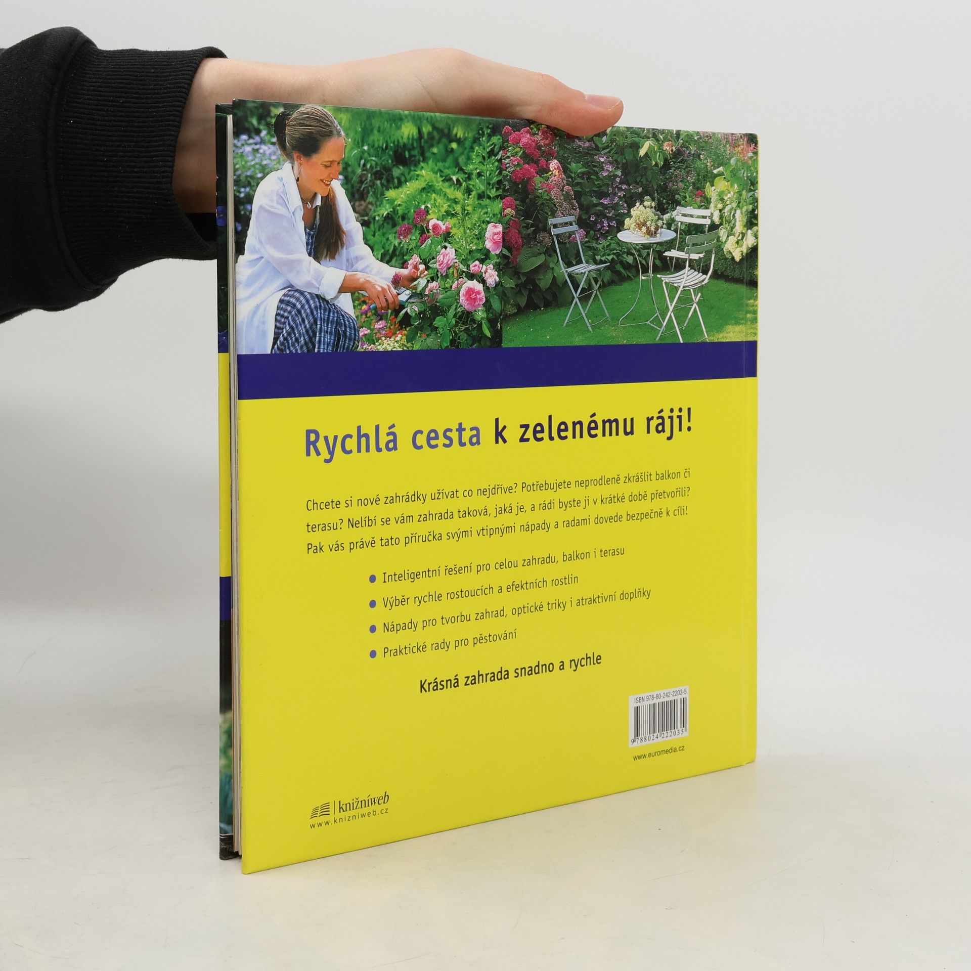 Praktické rady a efektní tipy pro netrpělivé zahrádkáře k rychlému zkrášlení zahrady, terasy či balkonu. Pro dokonalou a bohatě kvetoucí zahradu stačí vybrat rychle rostoucí rostliny, nakoupit statné sazenice stromků, rolovaný trávník (na zahradu se položí jako koberec), velké trsy trvalek, předpěstované cibulnaté květiny, kvetoucí růže v kontejnerech. Kniha navrhuje řešení jednotlivých částí zahrady i pomocí nápaditých dekorací či prvků zahradní architektury. Obsahuje i rady týkající se výsadby, péče a zimní ochrany rostlin.