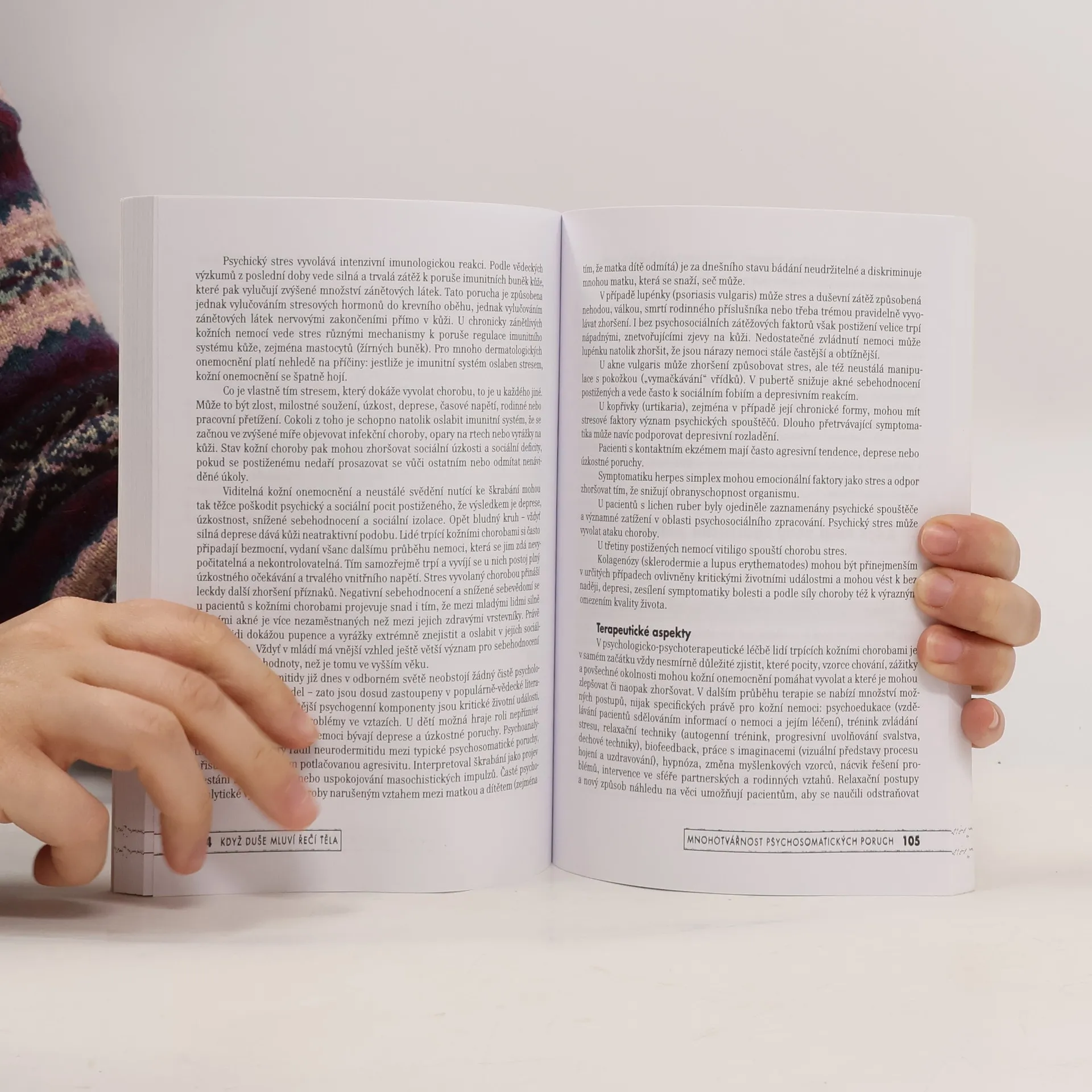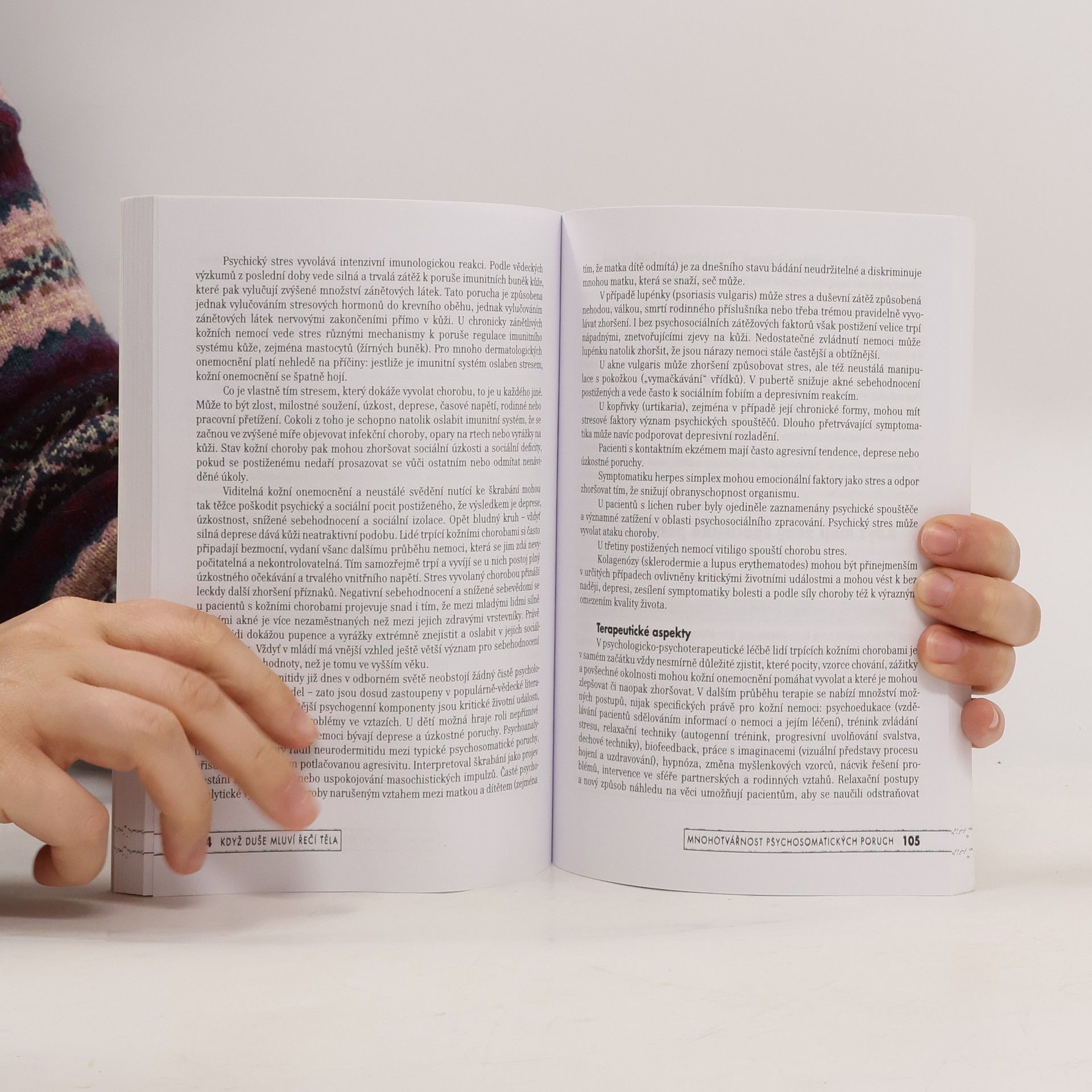 Populární a přitom seriózní přehled psychosomatiky zahrnuje všechny důležité orgány a jejich nejčastější psychosomatická onemocnění. Po krátkém úvodu, který se zabývá dějinami a vymezením psychosomatiky, se autoi soustřeďují na tělesné poruchy bez zjevných organických příčin (somatoformní a disociativní poruchy) a na tělesné poruchy s psychologickými faktory (psychosomatické poruchy v užším smyslu). Popisují řadu somatoformních a psychosomatických poruch podle různých orgánových oblastí – srdce, krevní tlak, dýchání, žaludek, střeva, kůže, ženské orgány, uši, krk, nos, hlas, oči, zuby, pohybové ústrojí. Součástí každé kapitoly jsou kromě kazuistické demonstrace také psychosomatické koncepty, dotýkající se jak psychologických faktorů dané oblasti, tak praktických terapeutických postupů.