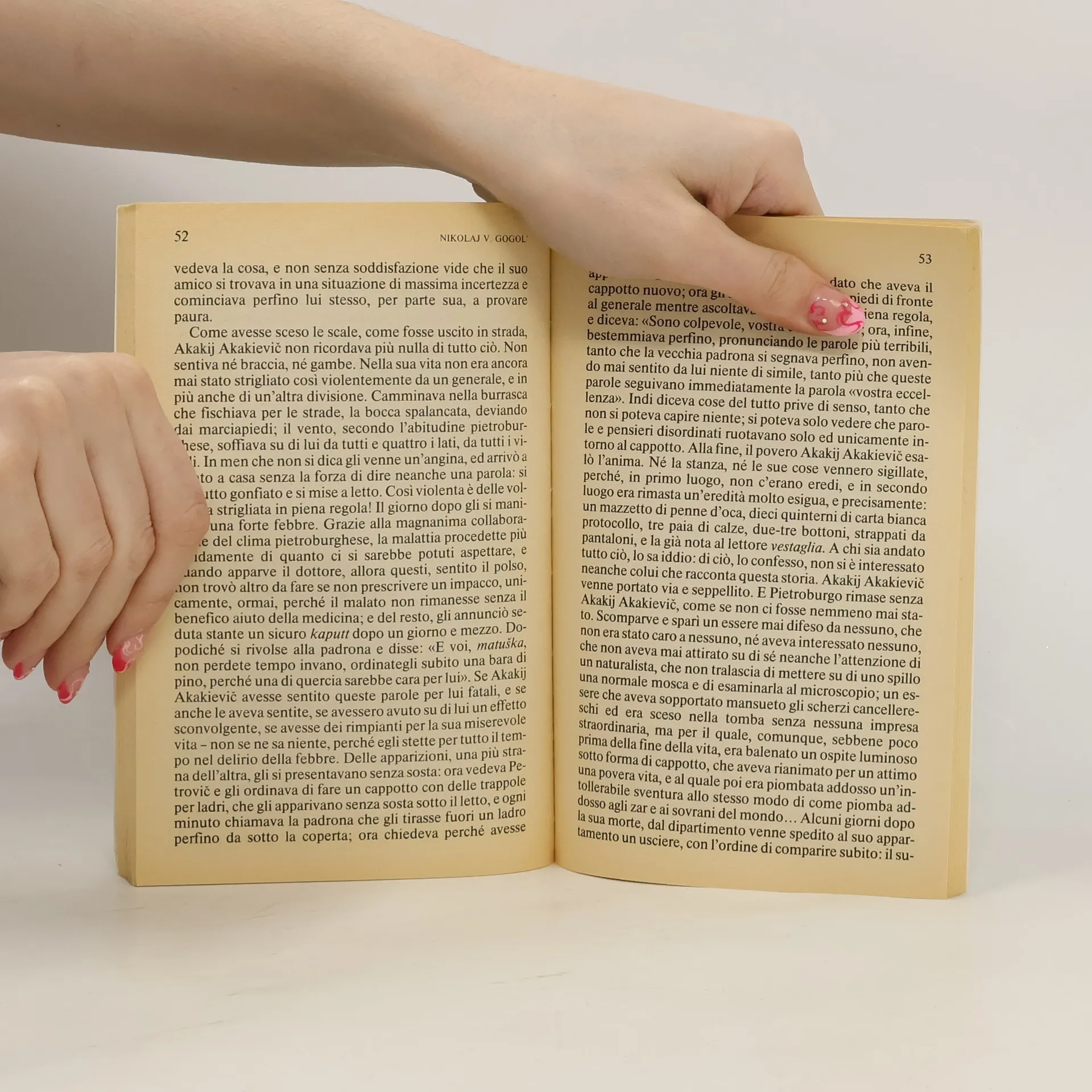 Gioielli del realismo grottesco di Gogol’, questi racconti sono tra i più significativi esiti della sua fantasia figurativa smisurata e della sua visione surrealista del mondo. Nel gelo di Pietroburgo, una città livida e ostile, è ambientato Il cappotto : è la triste vicenda di un impiegato mite e remissivo, deriso dai colleghi, eternamente sottomesso, che viene derubato del cappotto, comperato dopo spaventosi sacrifici. L’indifferenza e l’egoismo degli altri lo finiranno, ma imprevedibile sarà la vendetta studiata dall’autore. Ne Il naso , spesso ritenuto un puro divertissement, l’incredibile avventura dell’assessore collegiale Kovalëv, che si sveglia un bel mattino senza naso, offre all’autore l’opportunità di muoversi liberamente tra le infinite possibilità dell’immaginazione comica. Chiude il volume il racconto Il calesse , che prende l’avvio da una festa nella piccola cittadina di B.