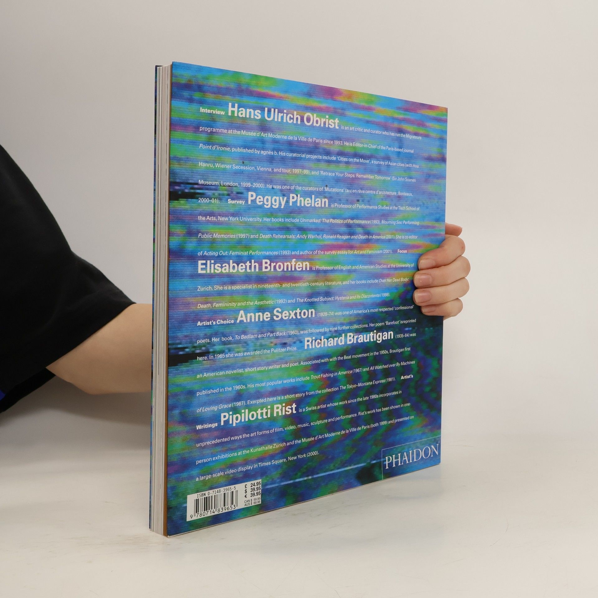 Pipilotti Rist is among the world's best-known artists working with video. Her multi-screen installations have a dream-like quality as, for example, a beautiful young woman (the artist herself) cavorts in fantastic seascapes or surreal jungles. This monograph explores the artist and her work. It features: a discussion of Rist's work in relation to notions of Utopia; an examination of Rist's innovation in video technology in the creation of a new female image; an exploration of the psychoanalytical implications of one video work, Absolutions (Pipilotti's Mistakes) (1988); Artist's Choice, for which the artist has selected two selections from the poet Anne Sexton and novelist Richard Brautigan; and Artist's Writings - Rist's descriptions of her dreams, highly influential in the realization of her imagery, are set alongside a homage to video pioneer Nam June Paik.