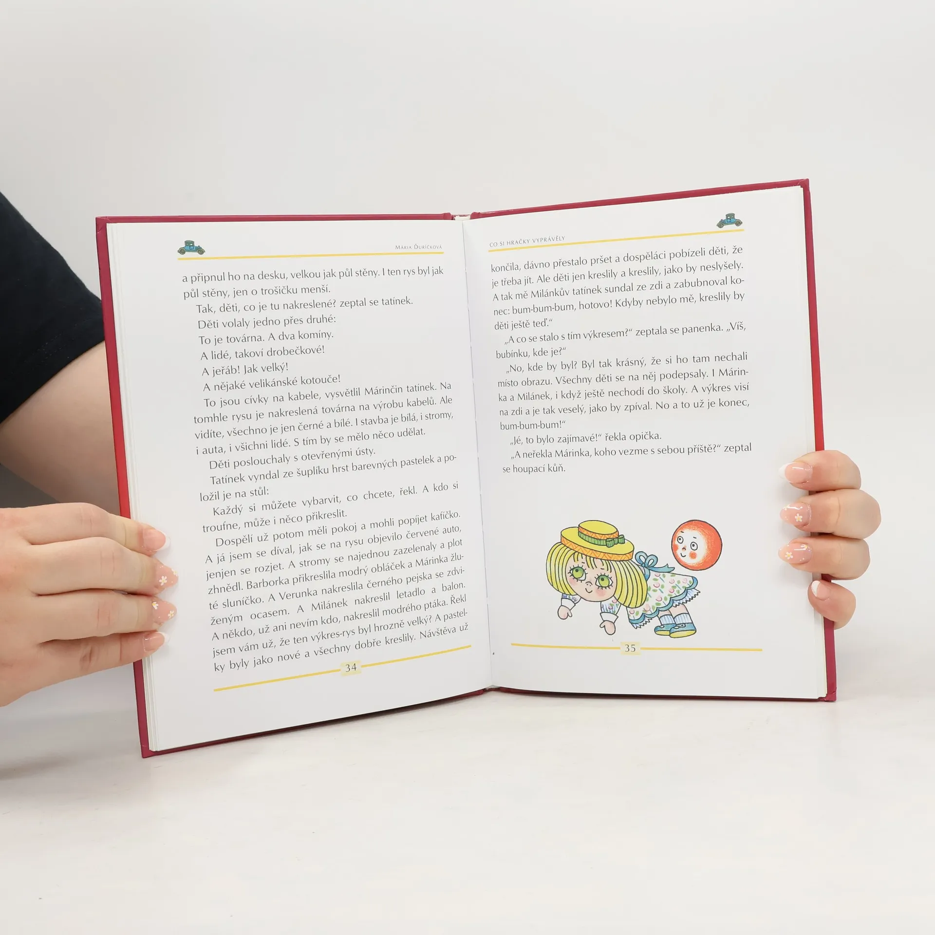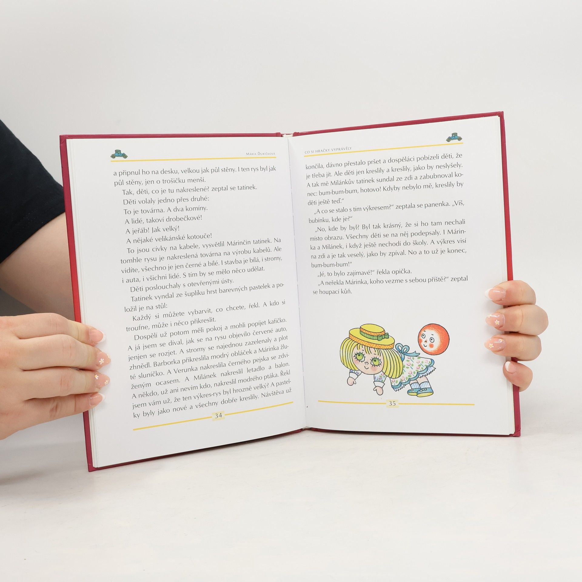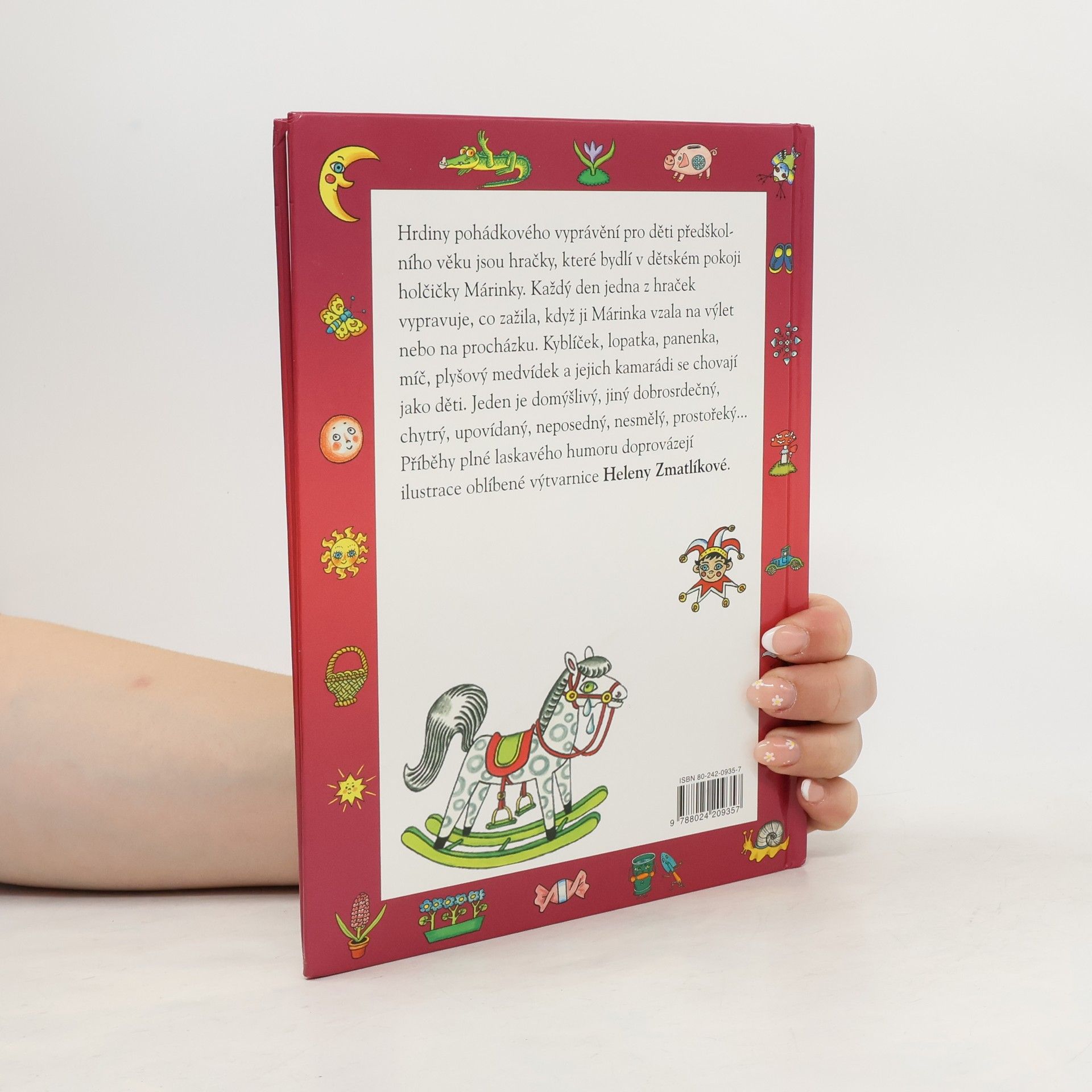 Ilustrovala Helena Zmatlíková Ze slovenštiny přeložila Alena Peisertová Hrdiny pohádkového vyprávění pro děti předškolního věku jsou hračky, které bydlí v dětském pokoji holčičky Márinky. Každý den jedna z hraček vypravuje, co zažila, když ji Márinka vzala na výlet nebo na procházku. Kyblíček, lopatka, panenka, míč, plyšový medvídek a jejich kamarádi se chovají jako děti. Jeden je domýšlivý, jiný dobrosrdečný, chytrý, upovídaný, neposedný, nesmělý, prostořeký… Příběhy plné laskavého humoru doprovázejí ilustrace oblíbené výtvarnice Heleny Zmatlíkové.
