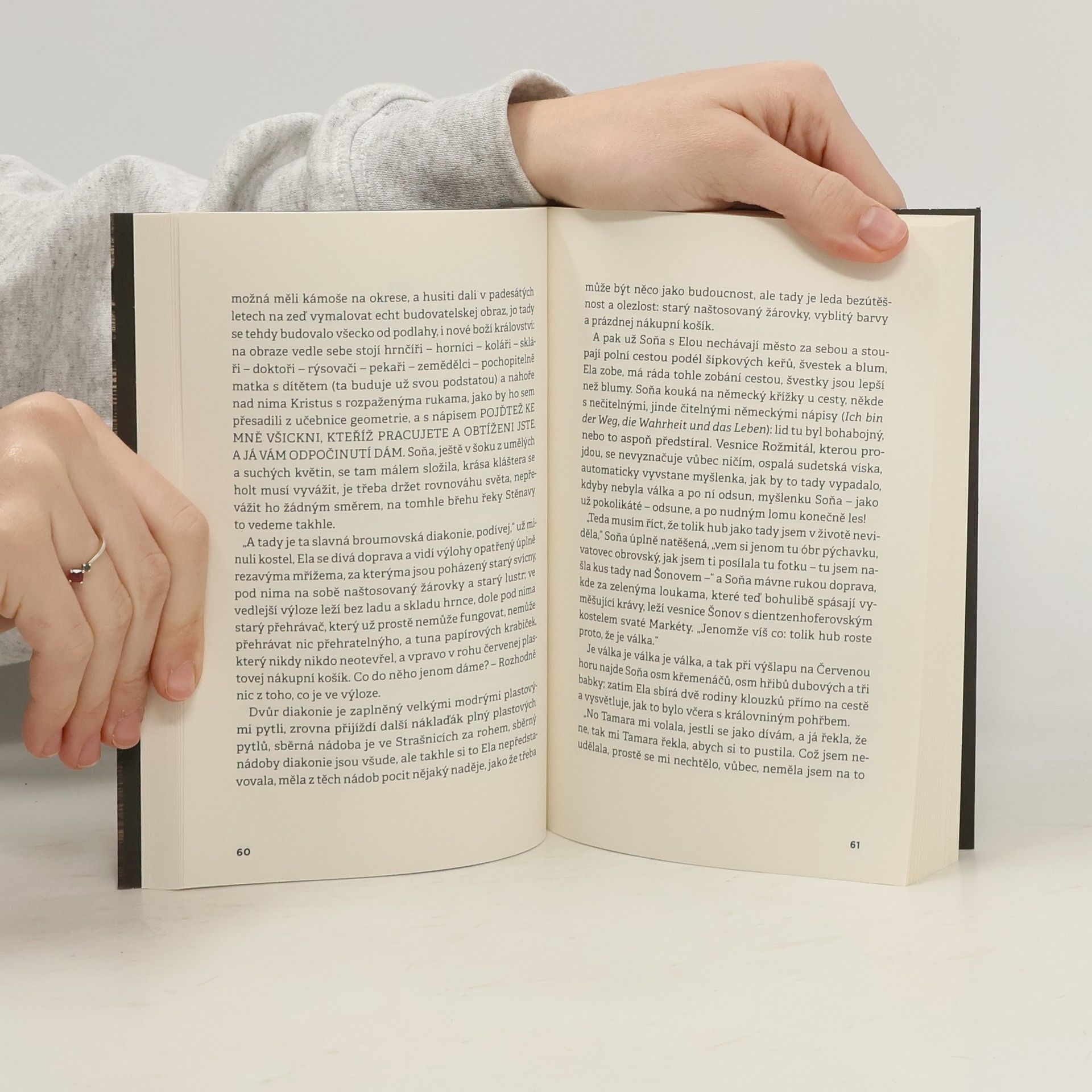 Do broumovského kláštera přijíždí na literární pobyt spisovatelka Soňa, dcera jednoho z řeholníků internovaných zde od dubna 1950 v rámci akce K, likvidace klášterních řeholníků ze strany komunistické moci. Za Soňou se vypravuje její dcera Ela a na povrch vyplouvají spletité rodinné historie – ale nejen ony. Součástí knihy je také deník, který si otec protagonistky Václav v broumovském klášteře na jaře a v létě 1950 psal (a po létech komentoval), deník jednoho z jeho spolubratrů z let sedmdesátých i výňatky z deníku akademika Charváta z padesátých let. Realita se mísí s fikcí, vstupuje sem válka na Ukrajině i pohřeb anglické královny stejně jako otázka, kolik vážila Gottwaldova játra. Příběh se odehrává v Broumově a na Broumovsku, zčásti přímo v klášterní zahradě a literárním domku, přitom sama literatura se ukazuje jako záležitost krajně pofidérní. Celou knihou pak prolíná tázání po Bohu a Boží přítomnosti, které je také navýsost prekérní, neboť, jak říká Václav, mluvit o Bohu ortodoxně není možné.