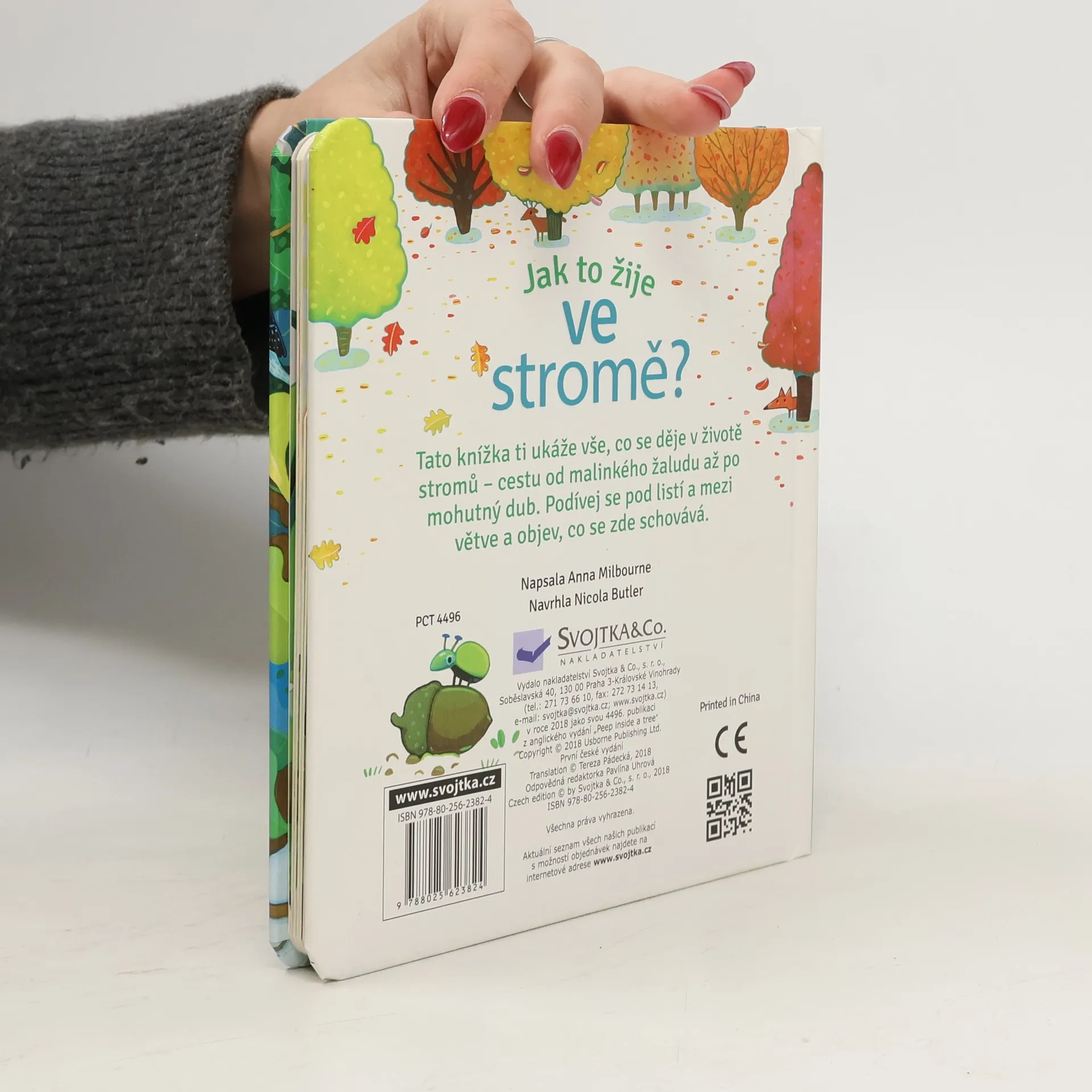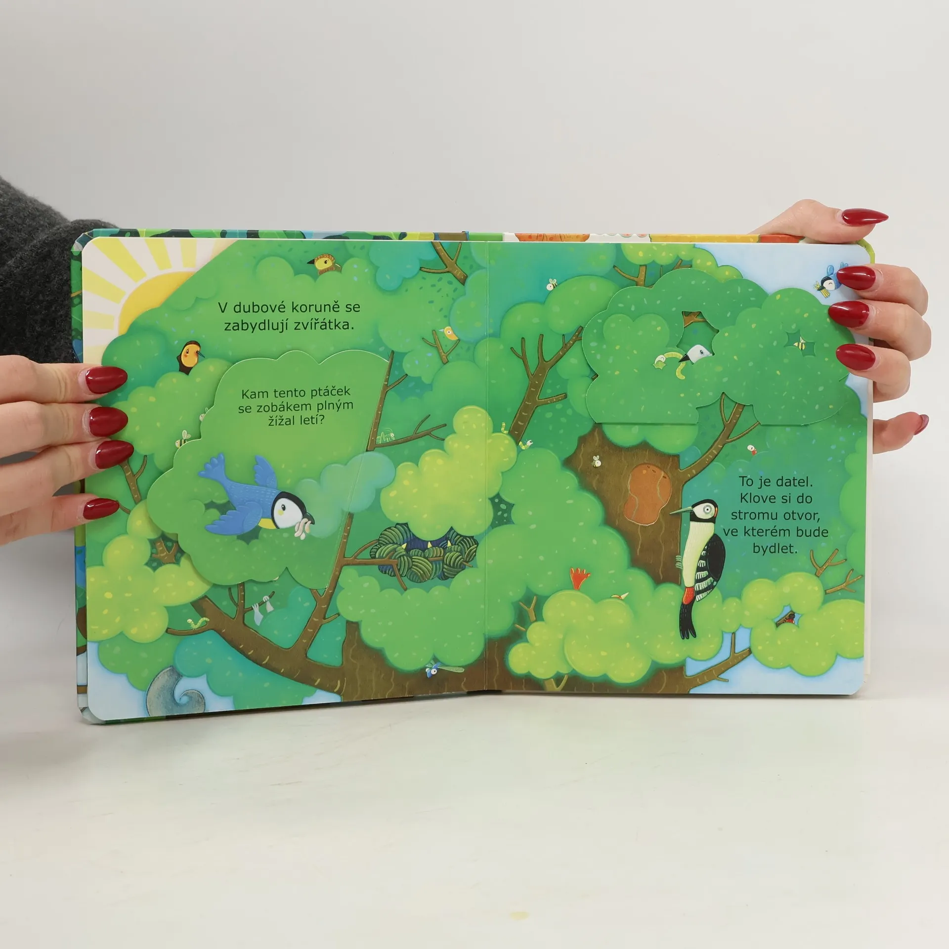 Veverka sbírá žaludy, aby měla během zimy co jíst. Na jeden žalud, který zahrabala do země, ale zapomněla. Sleduj, jak žalud puká a zapouští kořínky, které se rozrůstají hluboko do země. Malé větvičky sílí, raší na nich pupeny a za pár let je z malého doubku velký strom. V jeho větvích bydlí spousta zvířátek! Kdo se schovává mezi listy a pod kůrou stromu? Kdo tu ťuká do dřeva? A co naše veverka, sběratelka žaludů, kdepak ta bydlí? Odklápěj okénka a bav se při objevování nových věcí!