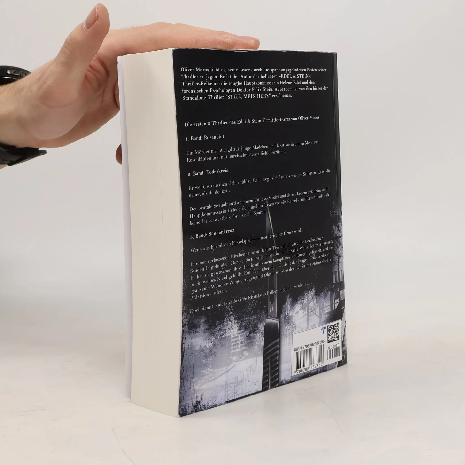 Drei komplette Thriller aus der Bestseller-Reihe von Oliver Moros. Hauptkommissarin Helene Edel und der forensische Psychologe Dr. Felix Stein jagen die erbarmungslosesten Serienkiller Berlins!Lesen Sie jetzt: Er schenkt dir Rosen ... und den Tod.In ihrem ersten Fall muss sich Hauptkommissarin Helene Edel den Dämonen ihrer Vergangenheit stellen, als die brutal verstümmelten Leichen zweier Studentinnen gefunden werden.Der einzige, der ihr bei der Lösung der bizarren Mordserie helfen könnte, ist der brillante Psychologe Felix Stein. Doch dieser sitzt selbst im Gefängnis - wegen Mordes an seiner Verlobten.Er ist der letzte, an den sich Helene wenden möchte, um den Täter zu finden, doch als weitere grausam zugerichtete Opfer des Psychopathen auftauchen, bleibt ihr keine andere Wahl mehr ... Er ist dir näher als du denkst ...Der brutale Mord an einem Fitness-Model und deren Lebensgefährtin stellt Hauptkommissarin Helene Edel und ihr Team vor ein Rätsel - am Tatort finden sich keinerlei verwertbare forensische Spuren.Als weitere grausame Morde geschehen, glaubt zunächst nur Helene Edel an einen Zusammenhang. Um ihren Verdacht zu beweisen, geht sie Risiken ein, die sie weit mehr als nur ihre Karriere kosten könnten.Viel zu spät begreift Helene, wer das wahre Ziel des Täters ist … Wenn aus harmlosen Fesselspielchen mörderischer Ernst wird ...In einer verlassenen Kirchenruine in Berlin-Tempelhof wird die Leiche einer jungen Frau gefunden. Der psychopathische Killer lässt sie auf bizarre Weise dekoriert zurück: Er hat sie gewaschen, ihre Hände mit einem komplizierten Knoten gefesselt, und sie in ein weißes Kleid gehüllt. Ein Tuch über dem Gesicht der jungen Frau verdeckt grausame Wunden: Zunge, Augen und Ohren wurden dem Opfer mit chirurgischer Präzision entfernt.Doch damit endet das bizarre Ritual des Killers noch lange nicht ...Atemlose Spannung, die Ihnen den Schlaf rauben wird - Lesen Sie jetzt!*****Alle Bände der Reihe sind unabhängig voneinander lesbar. Die süchtig machende Thriller-Reihe um das ungleiche Ermittlerteam Helene Edel und Doktor Felix Stein - für Fans rasanter Ermittlungen im Umfeld von Serientätern und Psychopathen vor dem realistischen Hintergrund der Großstadt Berlin, basierend auf wahren Begebenheiten . Die starke Ermittlerin, der erfahrene forensische Psychiater und ihr eingeschworenes Team ermitteln unter Zeitdruck - mit Hirn, Herz und einer Prise Humor.*****Begeisterte Leserstimmen zu den Thrillern von Oliver Moros:"Ich konnte richtig in die Story eintauchen, hatte so meine Ahnungen, aber was der Schluss brachte, hat mich voll geplättet. Da wäre ich nicht drauf gekommen." (Melli)"Auch dieser Fall Edel und Stein sowie Max und Sam war wieder spannend und nervenzerreißend. Grandios und empfehlenswert." (Kindle-Kunde)"Ein Thriller, der von mir eine ganz klare Leseempfehlung bekommt! Allein schon, weil das Ende so unvorhersehbar war, aber auch, weil der Schreibstil von Oliver Moros einfach super ist." (Christine Enge)***** Die Edel & Stein Thriller: Band 9 erscheint im Sommer 2023 Außerdem: