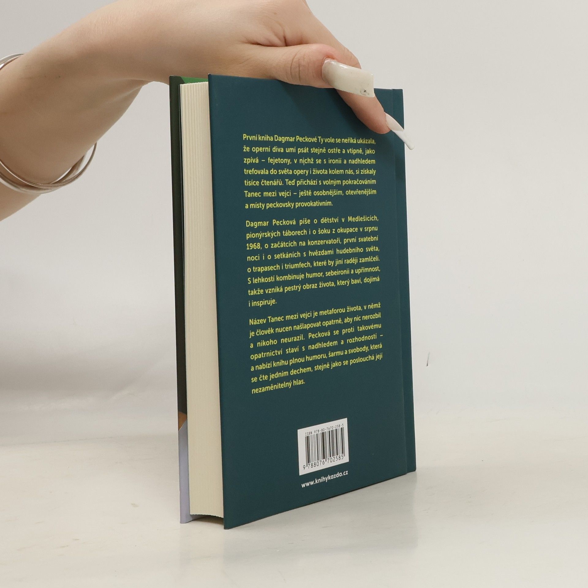 První kniha Dagmar Peckové Ty vole se neříká ukázala, že operní diva umí psát stejně ostře a vtipně, jako zpívá – fejetony, v nichž se s ironií a nadhledem trefovala do světa opery i života kolem nás, si získaly tisíce čtenářů. Teď přichází s volným pokračováním Tanec mezi vejci – ještě osobnějším, otevřenějším a místy peckovsky provokativním. Dagmar Pecková píše o dětství v Medlešicích, pionýrských táborech i o šoku z okupace v srpnu 1968, o začátcích na konzervatoři, první svatební noci i o setkáních s hvězdami hudebního světa, o trapasech i triumfech, které by jiní raději zamlčeli. S lehkostí kombinuje humor, sebereflexi a upřímnost, takže vzniká pestrý obraz života, který baví, dojímá a inspiruje. Název Tanec mezi vejci je metaforou života, v němž je člověk nucen našlapovat opatrně, aby nic nerozbil a nikoho neurazil. Pecková se proti takovému opatrnictví staví s nadhledem a rozhodností – a nabízí knihu plnou humoru, šarmu a svobody, která se čte jedním dechem, stejně jako se poslouchá její nezaměnitelný hlas.