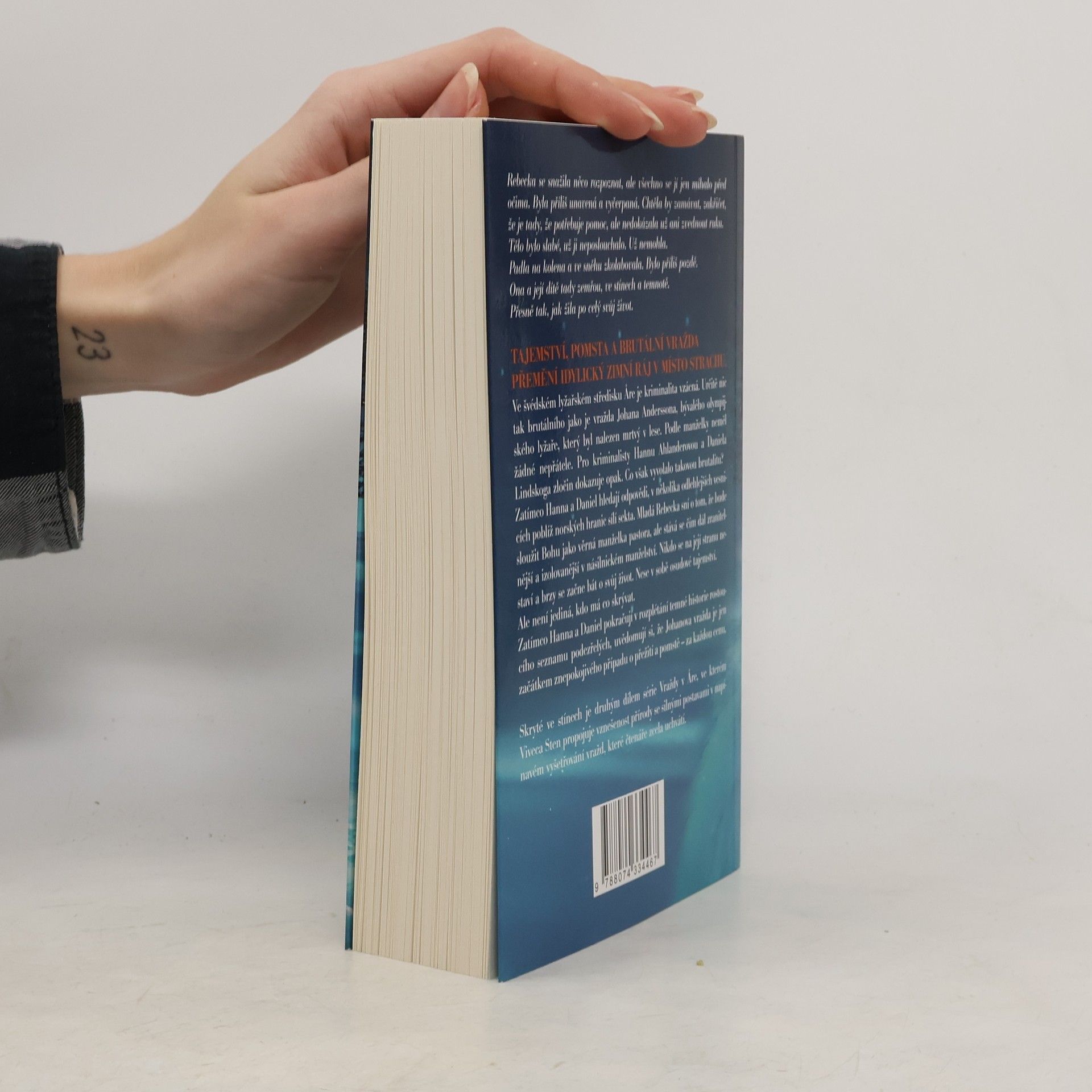 Ve švédském lyžařském středisku Are je kriminalita vzácná. Určitě nic tak brutálního jako je vražda Johana Anderssona, bývalého olympijského lyžaře, který byl nalezen mrtvý v lese. Podle manželky neměl žádné nepřátele. Pro kriminalisty Hannu Ahlanderovou a Daniela Lindskoga zločin dokazuje opak. Co však vyvolalo takovou brutalitu? Zatímco Hanna a Daniel hledají odpovědi, v několika odlehlejších vesnicích poblíž norských hranic sílí sekta. Mladá Rebecka sní o tom, že bude sloužit Bohu jako věrná manželka pastora, ale stává se čím dál zranitelnější a izolovanější v násilnickém manželství. Nikdo se na její stranu nestaví a brzy se začne bát o svůj život. Nese v sobě osudové tajemství. Ale není jediná, kdo má co skrývat. Zatímco Hanna a Daniel pokračují v rozplétání temné historie rostoucího seznamu podezřelých, uvědomují si, že Johanova vražda je jen začátkem znepokojivého případu o přežití a pomstě – za každou cenu. Skryté ve stínech je druhým dílem série Vraždy v Are, ve kterém Viveca Sten propojuje vznešenost přírody se silnými postavami v napínavém vyšetřování vražd, které čtenáře zcela uchvátí.