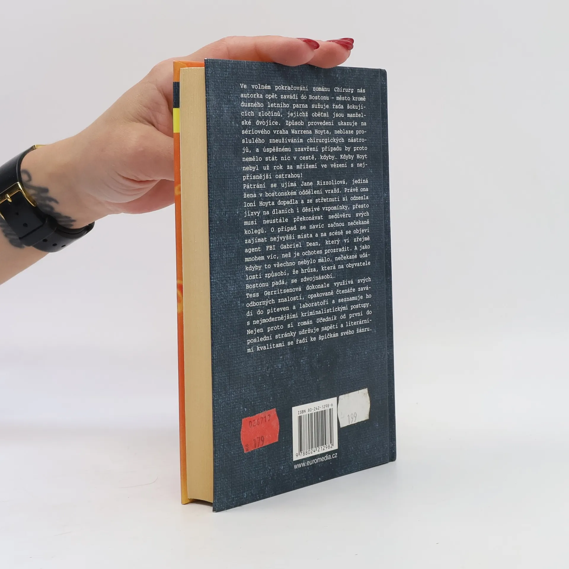 Ve volném pokračování románu Chirurg nás autorka opět zavádí do Bostonu - město kromě dusného letního parna sužuje řada šokujících zločinů, jejichž oběťmi jsou manželské dvojice. Způsob provedení ukazuje na sériového vraha Warrena Hoyta, neblaze proslulého zneužíváním chirurgických nástrojů, a úspěšnému uzavření případu by proto nemělo stát nic v cestě, kdyby… Kdyby Hoyt nebyl už rok za mřížemi ve vězení s nejpřísnější ostrahou! Pátrání se ujímá Jane Rizzoliová, jediná žena v bostonském oddělení vražd. Právě ona loni Hoyta dopadla a ze střetnutí si odnesla jizvy na dlaních i děsivé vzpomínky, přesto musí neustále překonávat nedůvěru svých kolegů. O případ se navíc začnou nečekaně zajímat nejvyšší místa a na scéně se objeví agent FBI Gabriel Dean, který ví zřejmě mnohem víc, než je ochoten prozradit. A jako kdyby to všechno nebylo málo, nečekané události způsobí, že hrůza, která na obyvatele Bostonu padá, se zdvojnásobí…... celý text