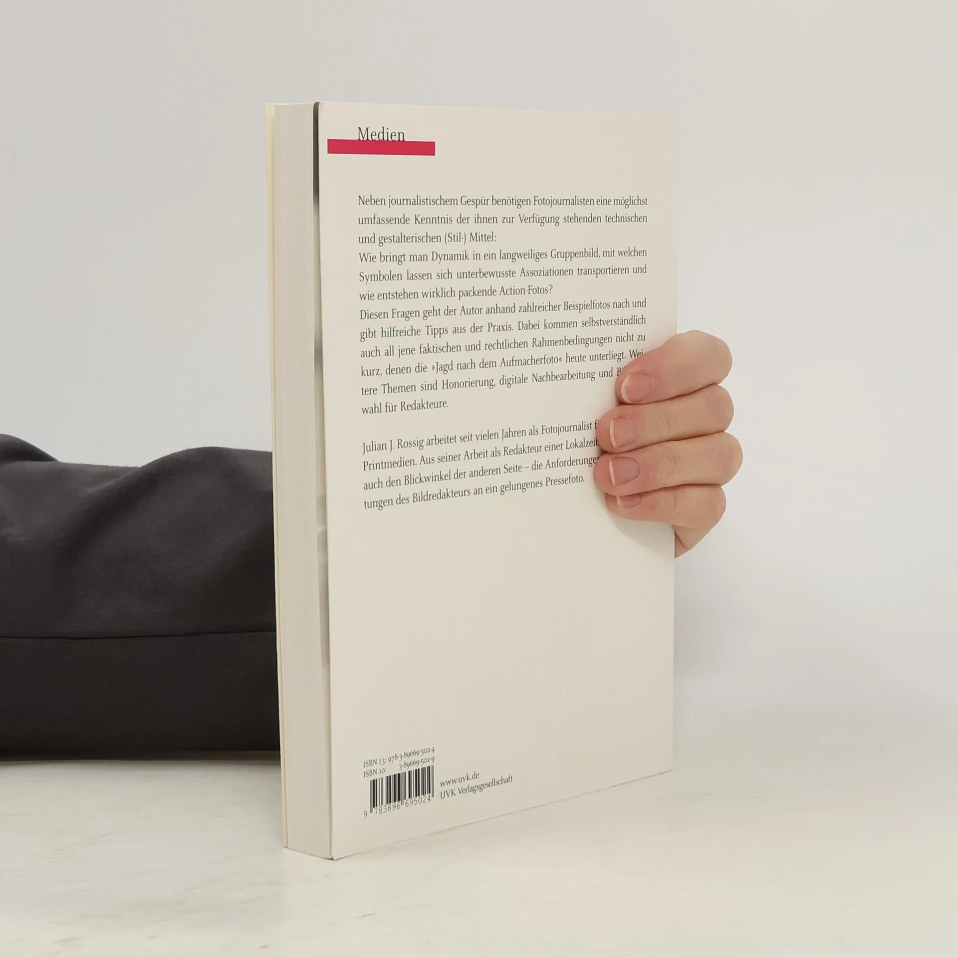 Ein aussagekräftiges Pressefoto, das die Aufmerksamkeit auf sich zieht und seine eigene ”Story“ erzählt, benötigt ebenso viel Fachwissen, Hingabe und Konzentration wie wie eine mühsam geschriebene Reportage. Anstelle von Stift und Notizblock sind dabei Kamera und Licht die Werkzeuge des Fotojournalisten. Um diese richtig einsetzen zu können, benötigt er neben journalistischem Gespür umfassende Kenntnis der ihm zur Verfügung stehenden technischen und gestalterischen (Stil-) Mittel. Wie bringt man Dynamik in ein langweiliges Gruppenbild, mit welchen Symbolen lassen sich bestimmte Assoziationen wecken, und wie entstehen wirklich packende Action-Fotos? Diesen Fragen geht der Autor anhand zahlreicher Beispielfotos nach und gibt hilfreiche Tipps aus der Praxis. Dabei kommen auch all jene faktischen und rechtlichen Rahmenbedingungen nicht zu kurz, denen die ”Jagd nach dem Aufmacherfoto“ heutzutage unterliegt.