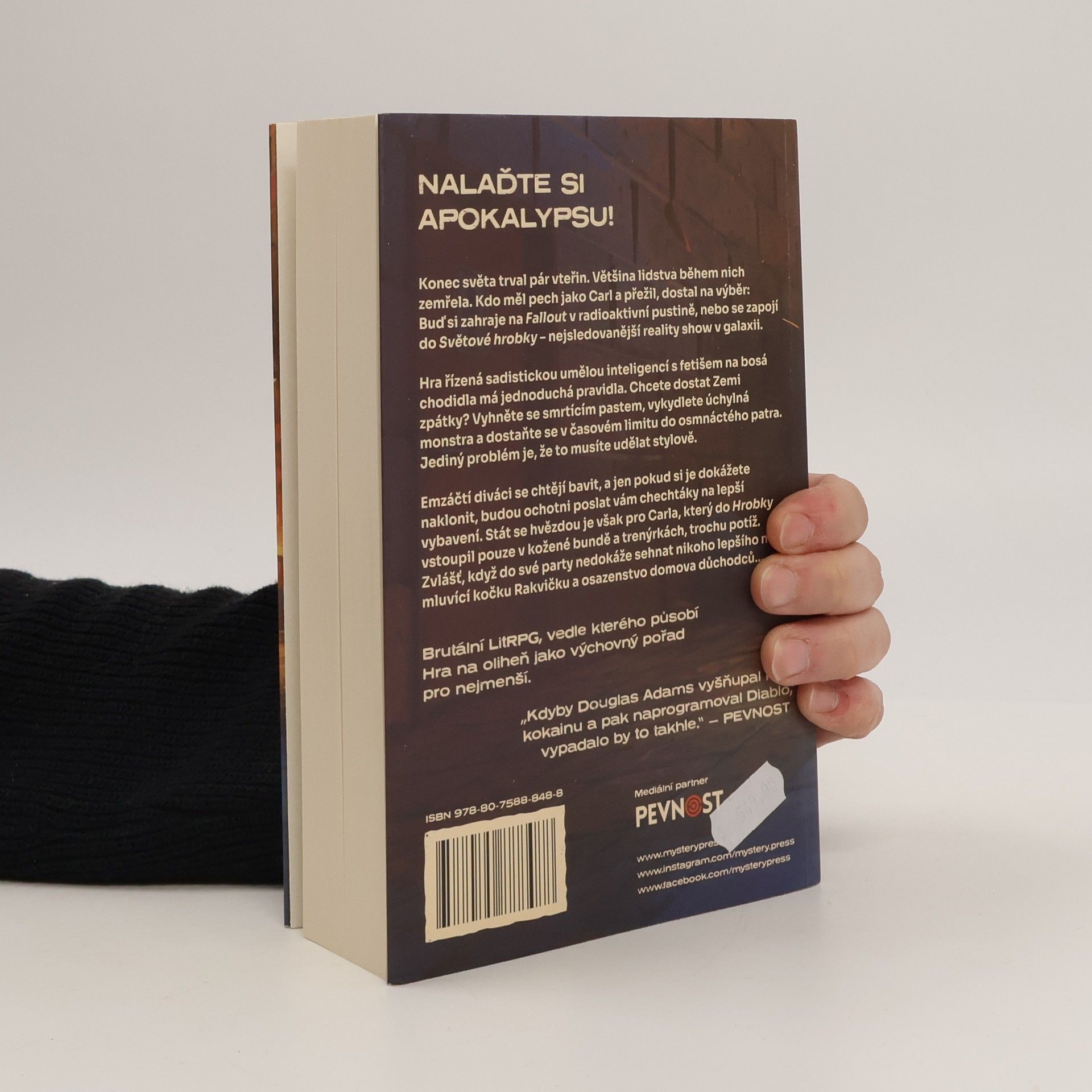 Konec světa trval pár sekund. Většina lidstva během nich zemřela. Kdo měl pech jako Carl a přežil, dostal na výběr: Buď si zahraje na Fallout v radioaktivní pustině, nebo se zapojí do Hrobky – nejsledovanější reality show v galaxii. Hra řízená Taťkou, sadistickou umělou inteligencí s fetišem na bosá chodidla, má jednoduchá pravidla. Chcete dostat Zemi zpátky? Vyhněte se brutálním pastem, vykydlete úchylná monstra a dostaňte se v časovém limitu do osmnáctého levelu. Jediný problém je, že to musíte udělat stylově. Emzáčtí diváci se chtějí bavit, a jen pokud si je dokážete naklonit, budou ochotni poslat vám chechtáky na lepší vybavení. Stát se hvězdou je však pro Carla, který do Hrobky vstoupil v kožené bundě a trenýrkách, trochu potíž. Zvlášť, když do své party nedokáže sehnat nikoho lepšího než mluvicí kočku Rakvičku a osazenstvo domova důchodců…