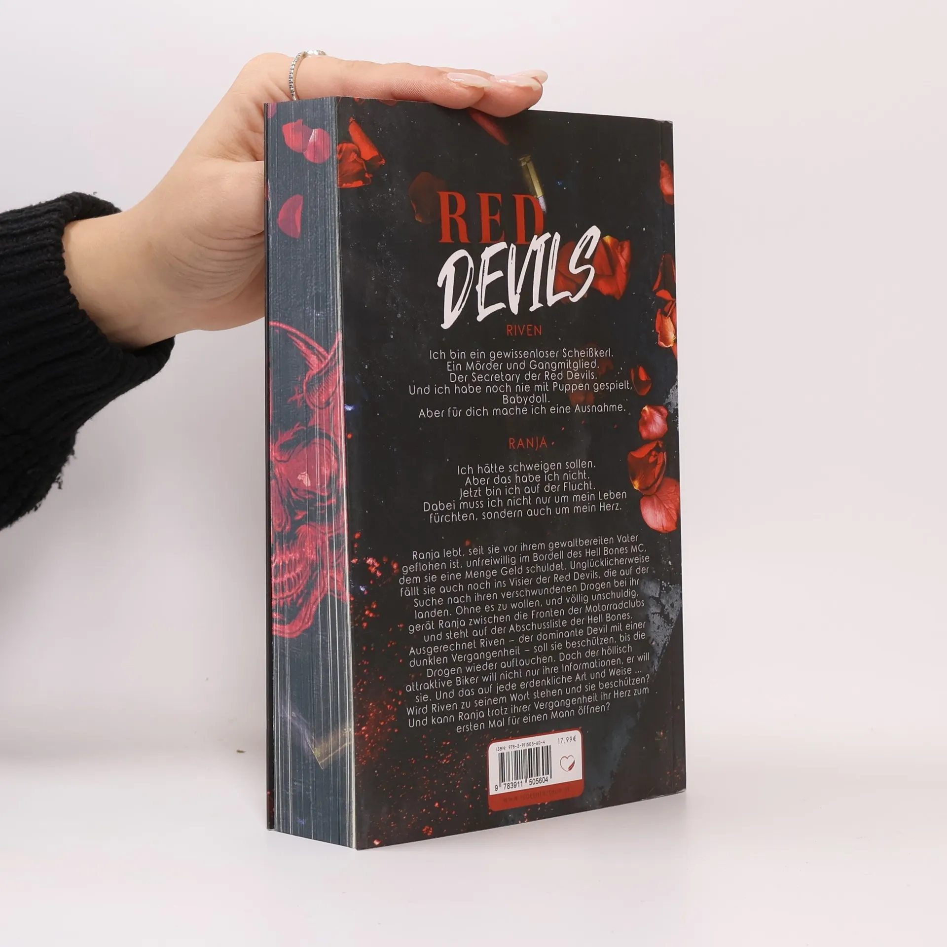 Riven Ich bin ein gewissenloser Scheißkerl. Ein Mörder und Gangmitglied. Der Secretary der Red Devils. Und ich habe noch nie mit Puppen gespielt, Babydoll. Aber für dich mache ich eine Ausnahme. Ranja Ich hätte schweigen sollen. Aber das habe ich nicht. Jetzt bin ich auf der Flucht. Dabei muss ich nicht nur um mein Leben fürchten, sondern auch um mein Herz. Ranja lebt, seit sie vor ihrem gewaltbereiten Vater geflohen ist, unfreiwillig im Bordell des Hell Bones MC, dem sie eine Menge Geld schuldet. Unglücklicherweise fällt sie auch noch ins Visier der Red Devils, die auf der Suche nach ihren verschwundenen Drogen bei ihr landen. Ohne es zu wollen, und völlig unschuldig, gerät Ranja zwischen die Fronten der Motorradclubs und steht auf der Abschussliste der Hell Bones. Ausgerechnet Riven – der dominante Devil mit einer dunklen Vergangenheit – soll sie beschützen, bis die Drogen wieder auftauchen. Doch der höllisch attraktive Biker will nicht nur ihre Informationen, er will sie. Und das auf jede erdenkliche Art und Weise … Wird Riven zu seinem Wort stehen und sie beschützen? Und kann Ranja trotz ihrer Vergangenheit ihr Herz zum ersten Mal für einen Mann öffnen?