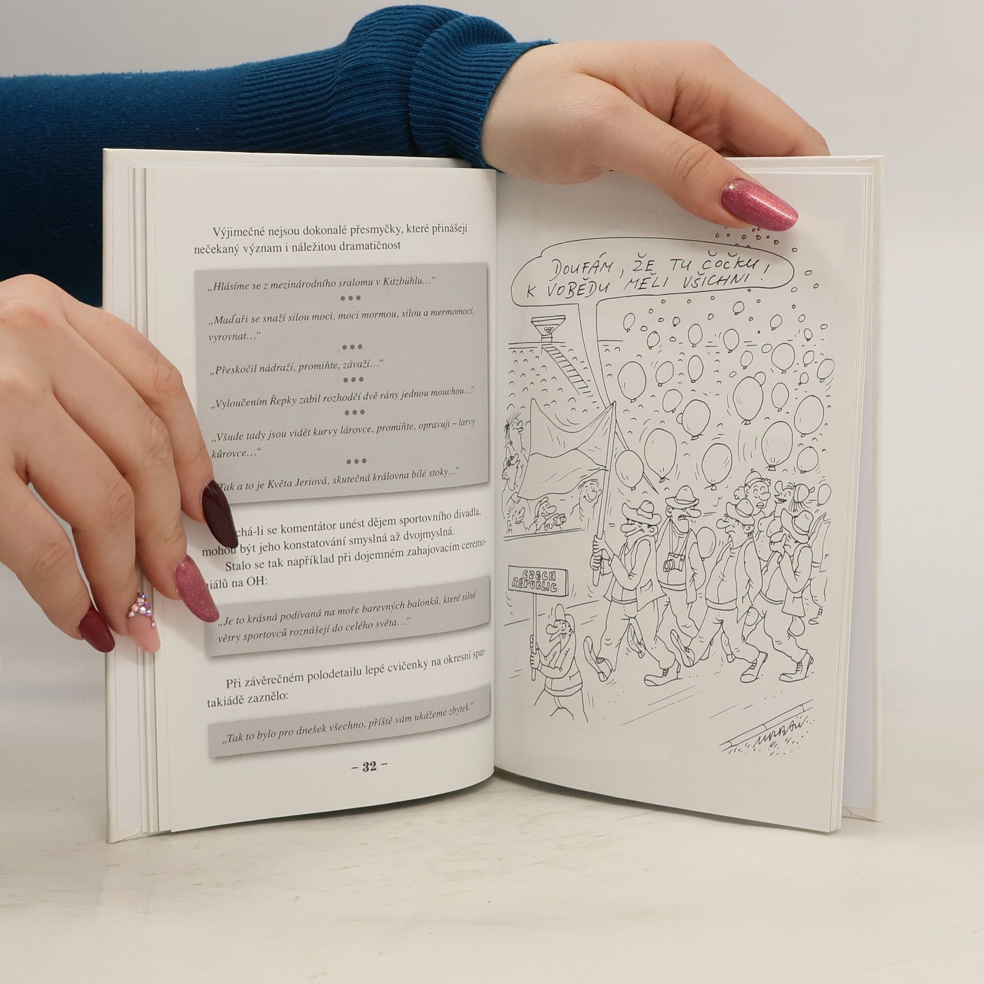 Neúmyslně vytvořené dvojsmysly a vtipy vyslovené reportéry a komentátory během televizních a rozhlasových přenosů doplněné kreslenými anekdotami Petra Urbana.