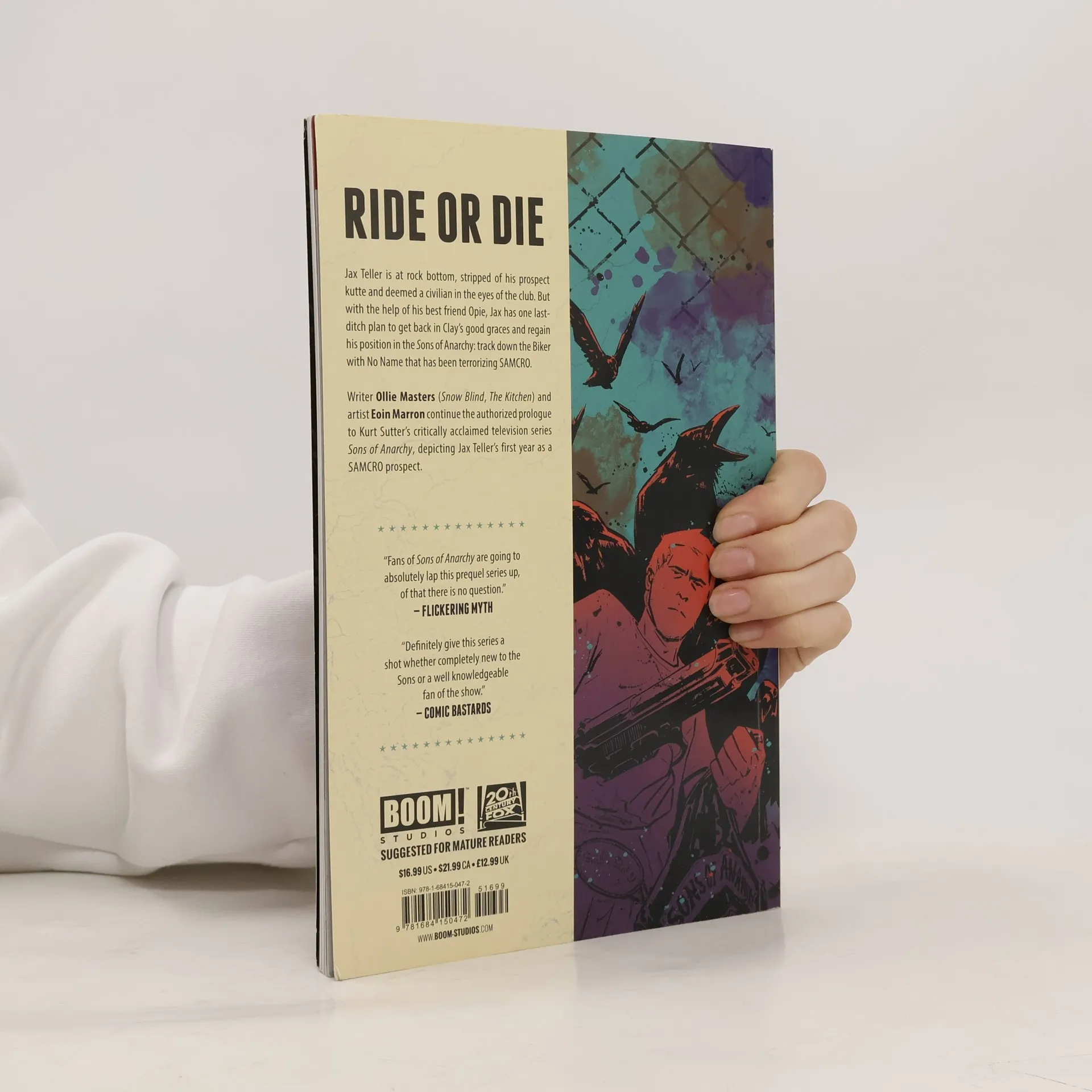Before Jax Teller was Clay’s right-hand man, he was a prospect — the lowest rung on the club’s ladder, tasked with challenges that would test his mettle and shake his resolve to join the SAMCRO way of life. This is that story. Ride or Die. Jax Teller is at rock bottom, stripped of his prospect kutte and deemed a civilian in the eyes of the club. But with the help of his best friend Opie, Jax has one last-ditch plan to get back in Clay’s good graces and regain his position in the Sons of Anarchy: track down the Biker with No Name that has been terrorizing SAMCRO. Writer Ollie Masters ( Snow Blind, The Kitchen ) and artist Eoin Marron continue the authorized prologue to Kurt Sutter’s critically acclaimed television series Sons of Anarchy , depicting Jax Teller’s first year as a SAMCRO prospect.
