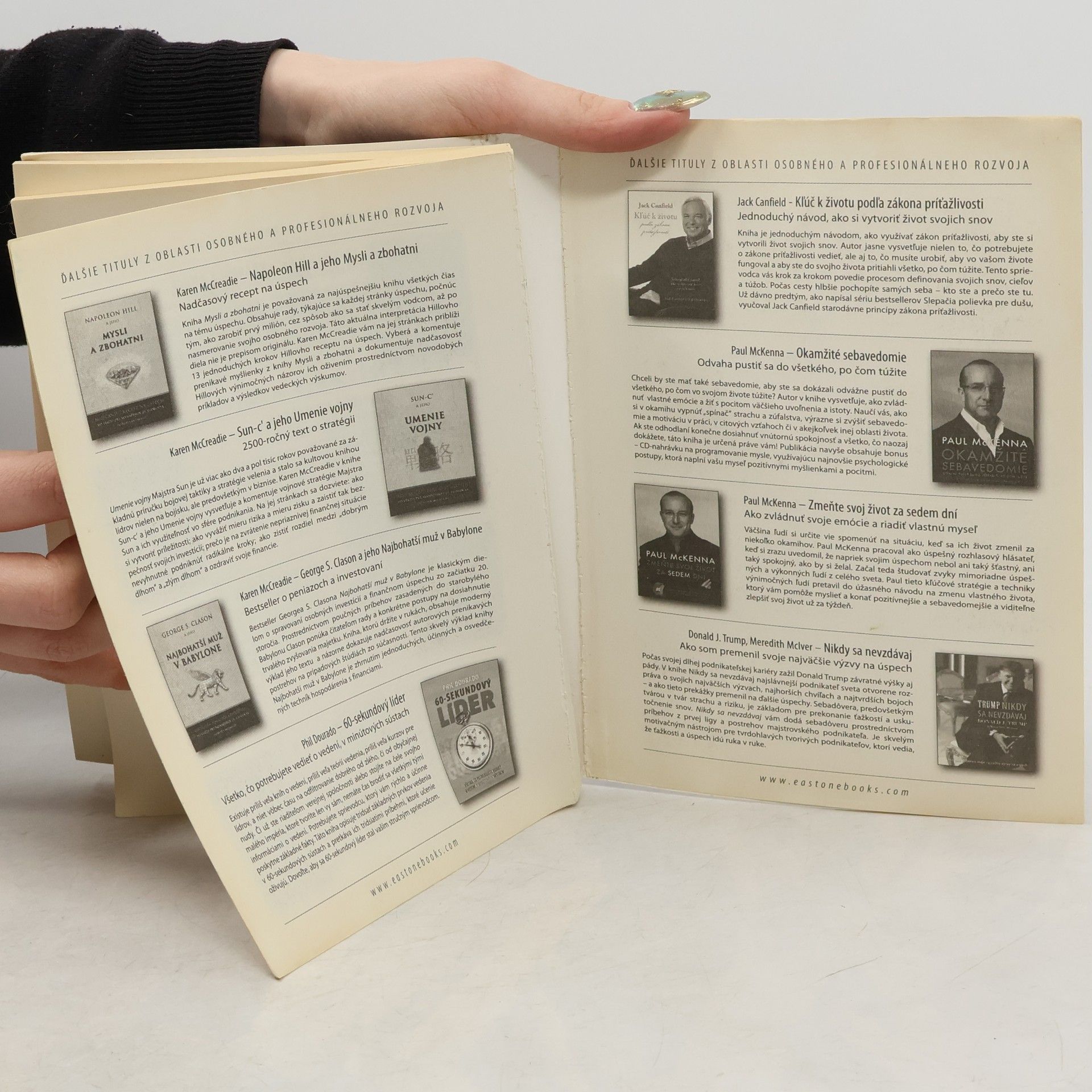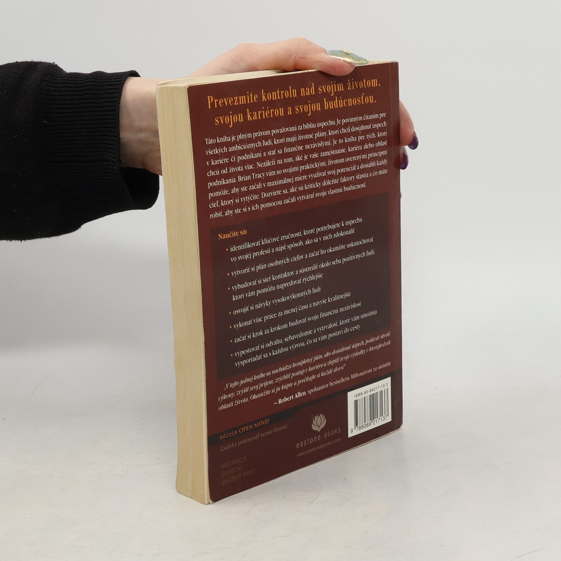 Táto kniha je plným právom považovaná za bibliu úspechu. Je povinným čítaním pre všetkých ambicióznych ľudí, ktorí majú životné plány, ktorí chcú dosiahnuť úspech v kariére či podnikaní a stať sa finančne nezávislými. Je to kniha pre tých, ktorí chcú od života viac. Nezáleží na tom, aké je vaše zamestnanie, kariéra alebo oblasť podnikania. Brian Tracy vám so svojimi praktickými, životom overenými princípmi pomôže, aby ste začali v maximálnej miere využívať svoj potenciál a dosiahli každý cieľ, ktorý si vytýčite. Dozviete sa, aké sú kriticky dôležité faktory šťastia a čo máte robiť, aby ste si s ich pomocou začali vytvárať svoju vlastnú budúcnosť. Naučíte sa: * identifikovať kľúčové zručnosti, ktoré potrebujete k úspechu vo svojej profesii a nájsť spôsob, ako sa v nich zdokonaliť * vytvoriť si plán osobných cieľov a začať ho okamžite uskutočňovať * vybudovať si sieť kontaktov a sústrediť okolo seba pozitívnych ľudí, ktorí vám pomôžu napredovať rýchlejšie * osvojiť si návyky vysokovýkonných ľudí * vykonať viac práce za menej času a navyše kvalitnejšie * začať si krok za krokom budovať svoju finančnú nezávislosť * vypestovať si odvahu, sebavedomie a vytrvalosť, ktoré vám umožnia vysporiadať sa s každou výzvou, čo sa vám postaví do cesty Podrobnosti