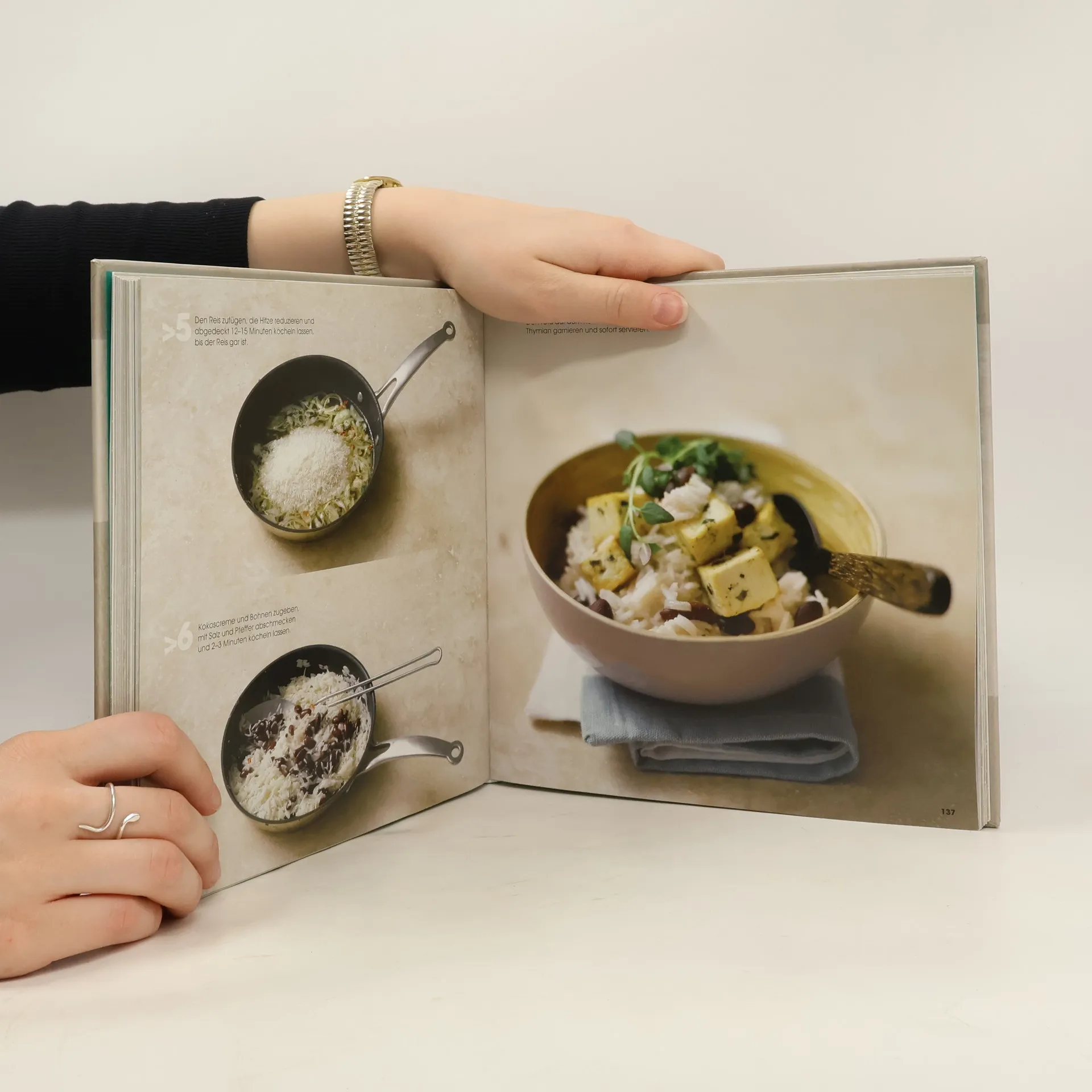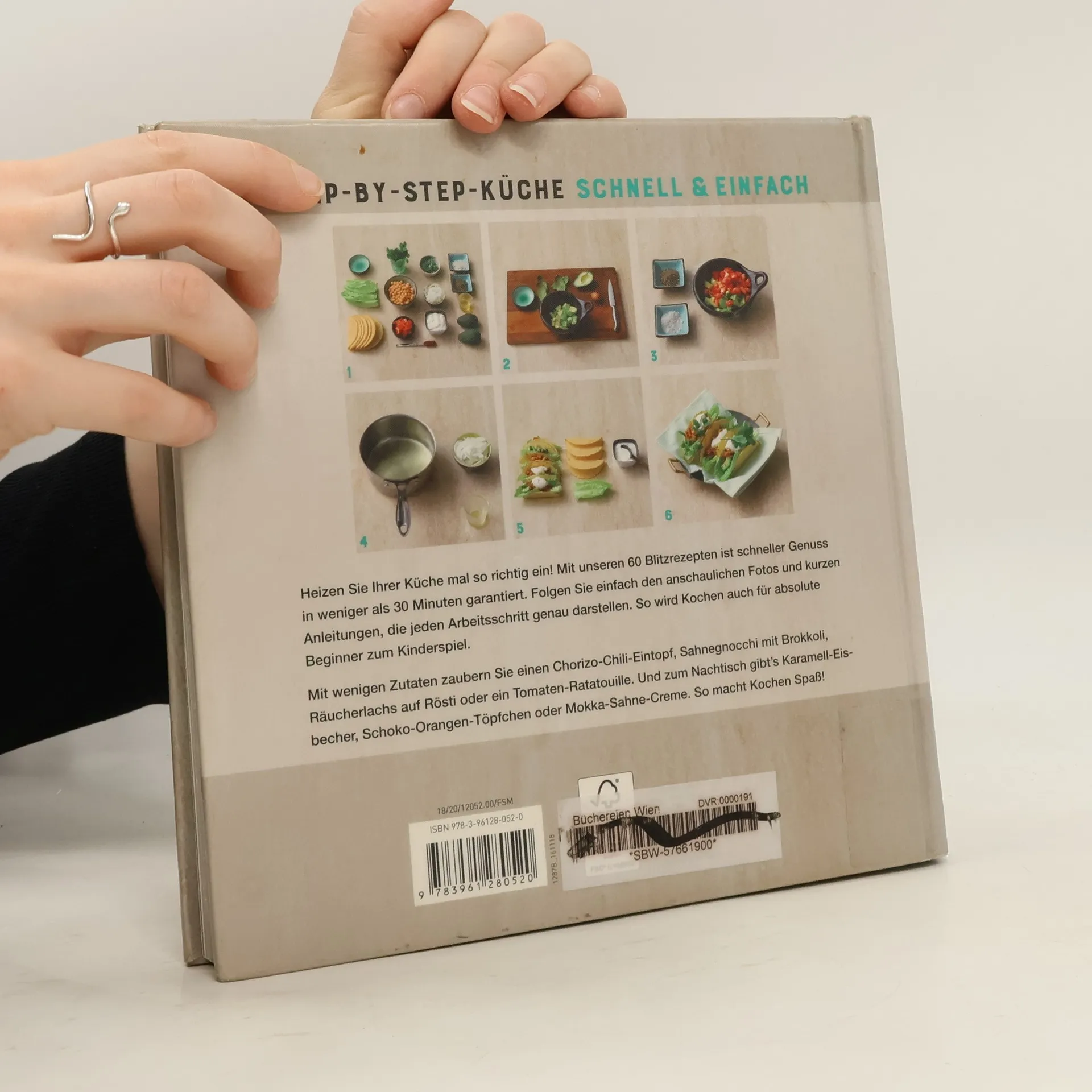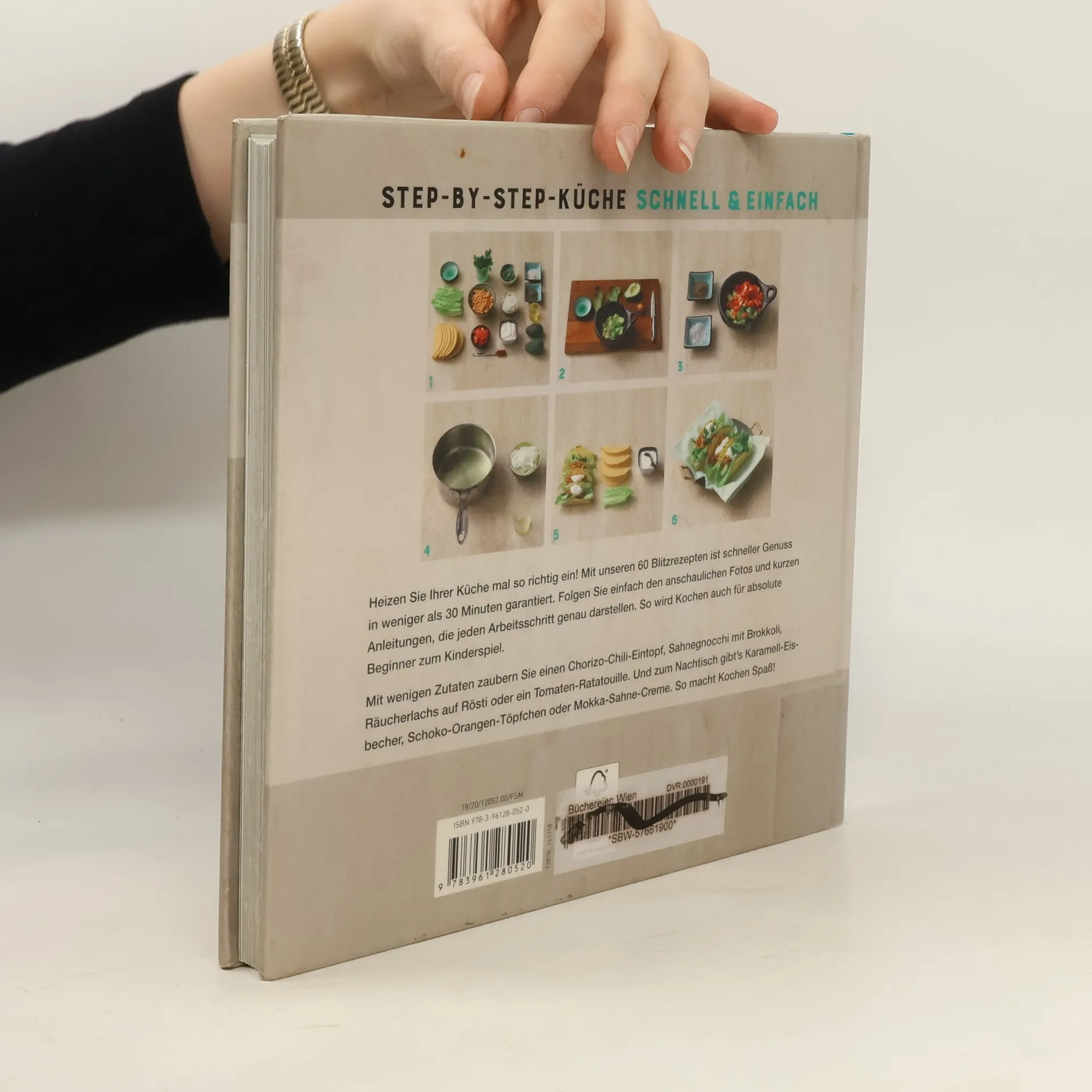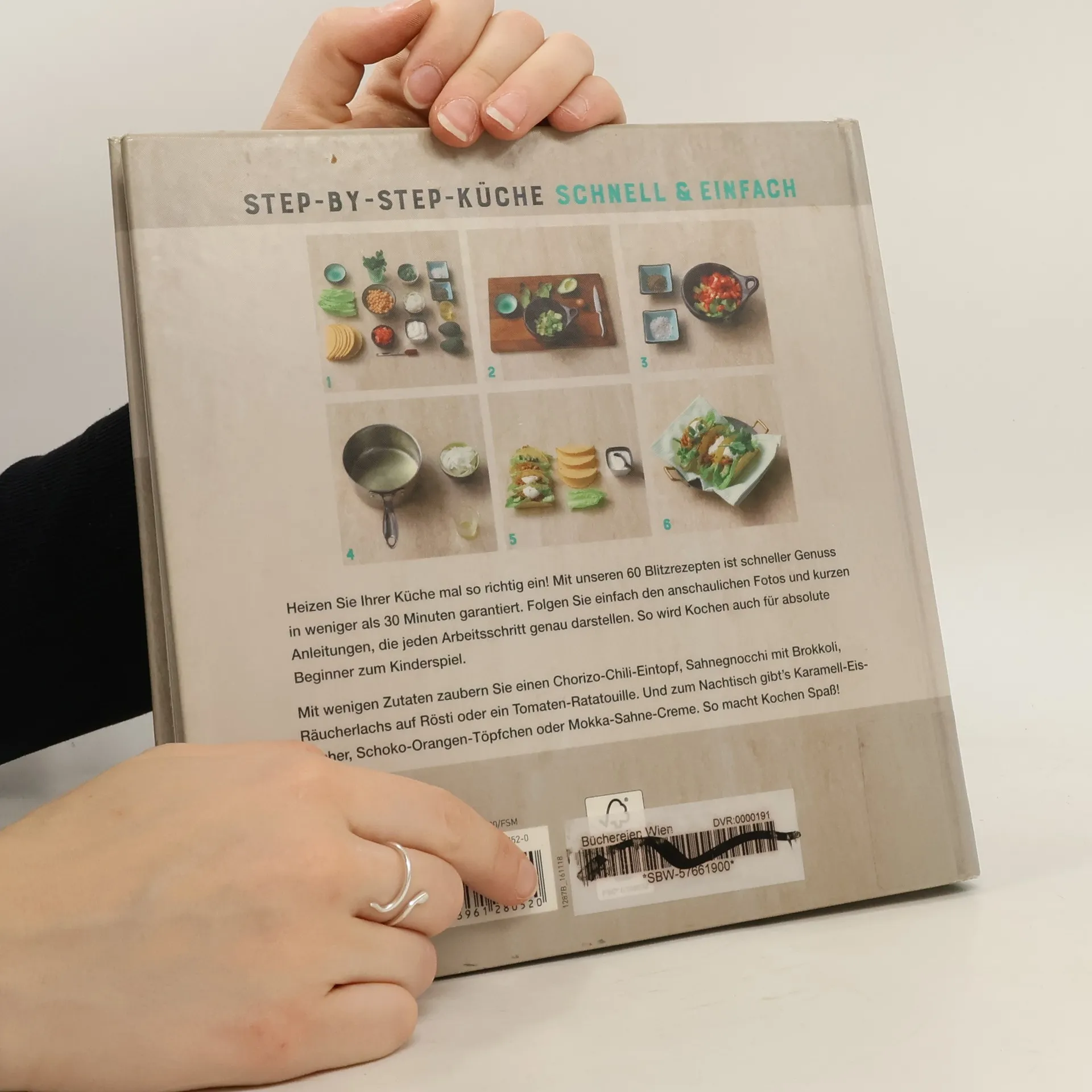 Alle Gerichte gelingen in weniger als 30 Minuten ungeübten Köchen genauso wie erfahrenen Hobbyköchen. Gezeigt wird im Foto alles von der Zusammenstellung der Zutaten über die Zubereitung bis zum fertig angerichteten Teller. Fleisch-, Fisch- und vegetarische Gerichte sowie Desserts sind zu finden