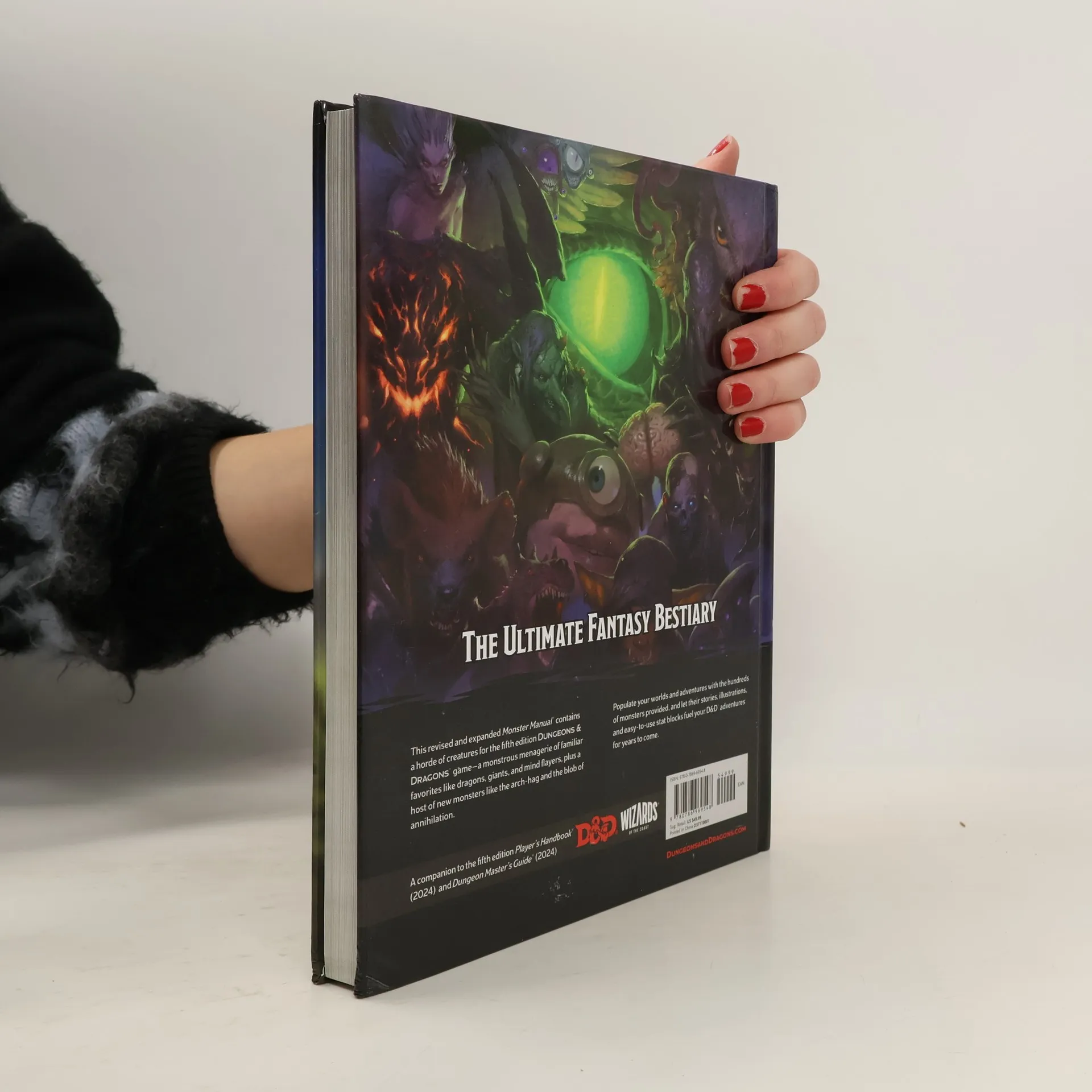This revised and expanded Monster Manual contains a horde of creatures for fifth edition Dungeons & Dragons. Encounter a monstrous menagerie of familiar favorites like dragons, giants, and mind flayers, plus a host of new monsters like the arch-hag, the blob of annihilation, and the vampire nightbringer. Populate your worlds and adventures with the hundreds of monsters provided, and let their stories, illustrations, and easy-to-use stat blocks fuel your D&D adventures for years to come. - The biggest D&D monster manual ever, with over 500 total and over 75 brand-new monsters to choose from - 9 terrifying new predators for higher-level play, like the arch-hag and blob of annihilation - New variations on beloved creatures like the primeval owlbear and vampire familiar - 40+ versatile humanoid stat blocks that give Dungeon Masters greater flexibility when populating their worlds with NPCs - All creature stat blocks have been redesigned and rebalanced for ease of use and maximum fun - Breathtaking new artwork for almost every monster, including stunning redesigns of the chromatic and metallic dragons - Intuitive organization makes finding your favorite monster easier than ever before