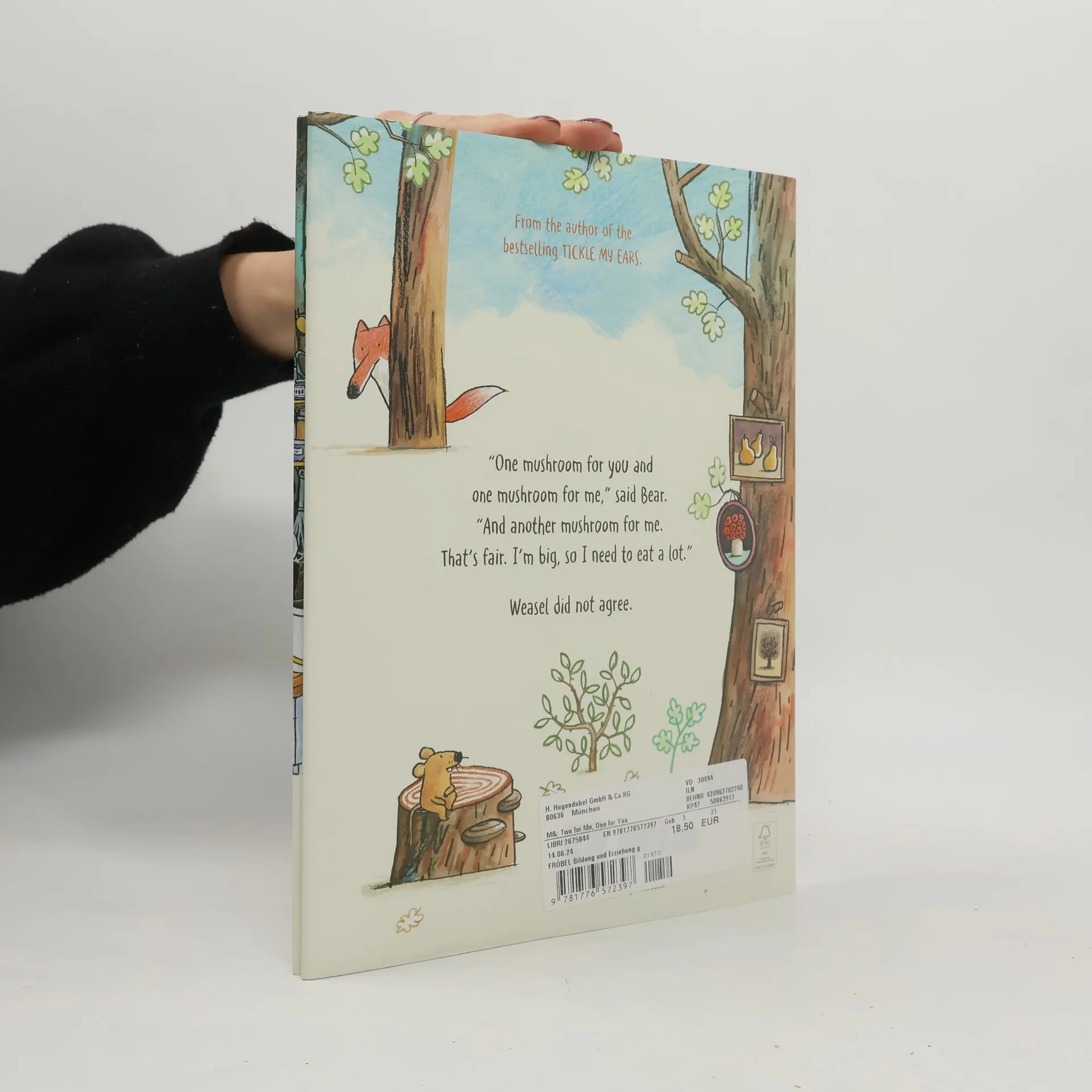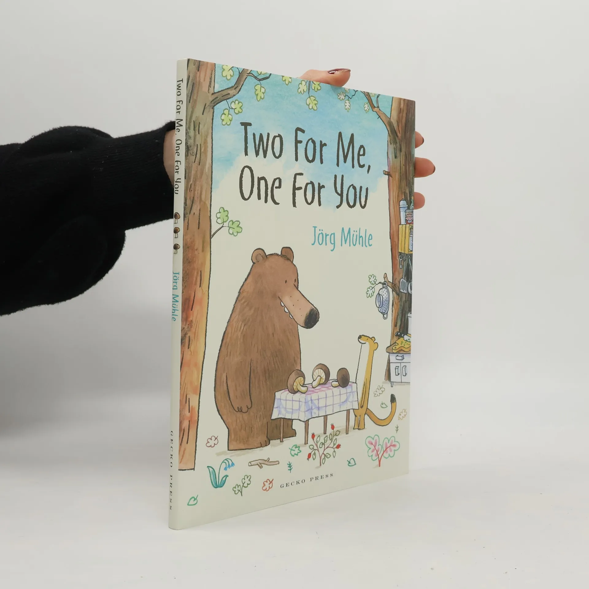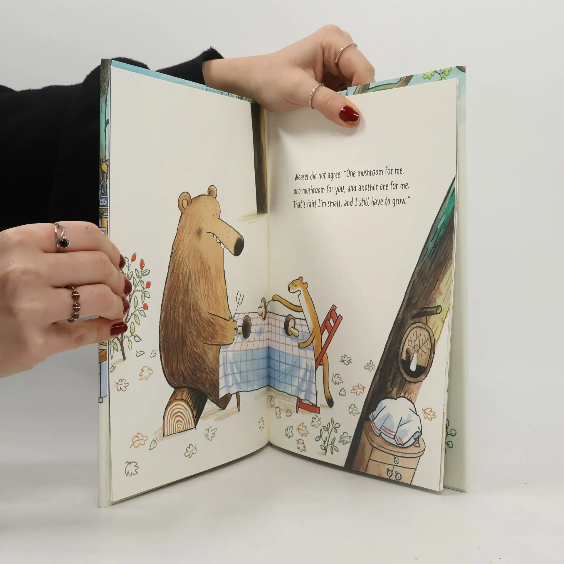 "'One mushroom for you and one mushroom for me," said bear. "And another mushroom for me. That's fair. I'm big, so I need to eat a lot." Weasel did not agree.--