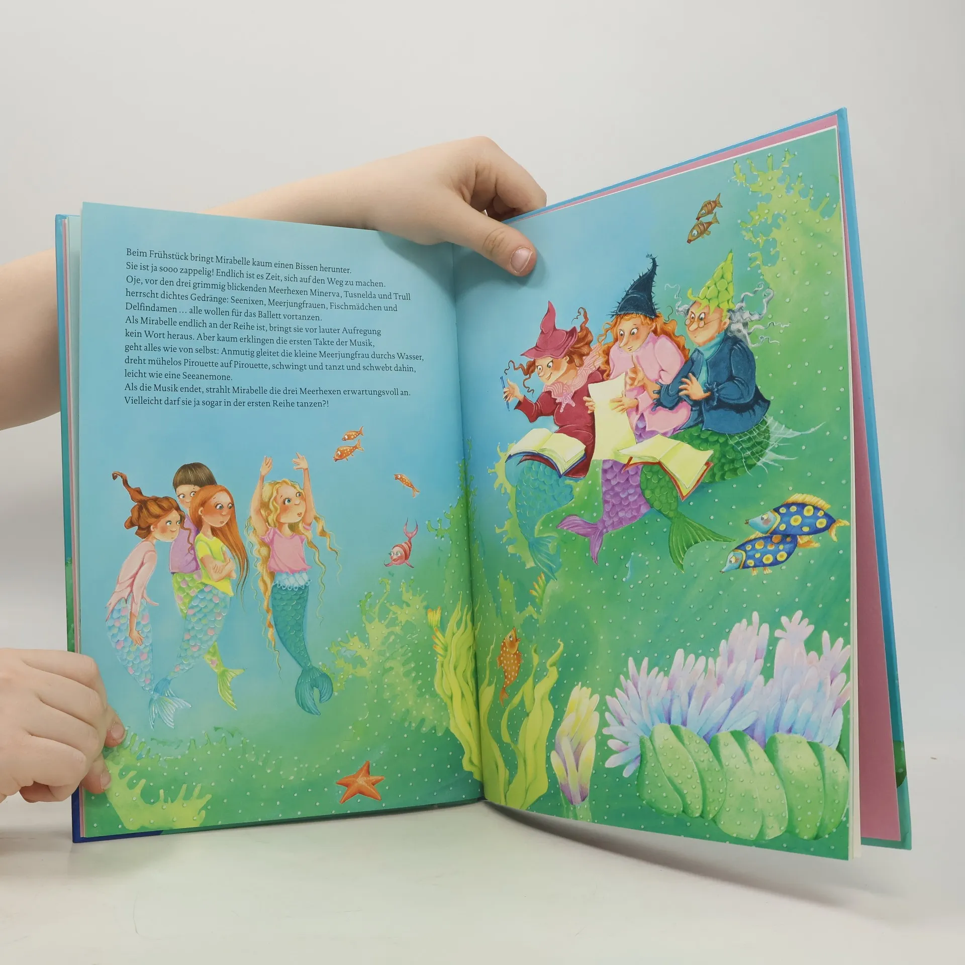 Die kleine Meerjungfrau Mirabelle hat eine Einladung zum Meeresball erhalten. Das Ozeanorchester wird spielen und der Höhepunkt ist ein grosses Ballett, für das noch Tänzerinnen gesucht werden. Mirabelle fängt sofort an, zu üben. Doch irgendwie kommt dauernd was dazwischen. Erst sucht sie die Lieblingsperle der Seepferdchen, die im Korallengarten verloren ging, sie hilft der Krake, die sich im Schlaf völlig verknotet hat, sich wieder zu entknoten und dann beschützt sie noch den kleinen Schwertfisch vor dem Hai. Beim Vortanzen ist Mirabelle gar nicht schlecht, aber ihr Schuppenkleid ist nicht funkelnd und leuchtend genug für das Ballett. Mirabelle ist furchtbar traurig, dass sie nicht mittanzen darf. Beim Meeresball sind ihre Freunde dann für sie da und sorgen dafür, dass sie einen leuchtenden Auftritt hat. Eine hellblau- und rosafarbene Unterwasser-Freundschaftsgeschichte, mit vielen Illustrationen in kräftigen Farben. Schon das Cover mit Glitzer-Effekt wird für viele Ausleihen sorgen. Ab 3