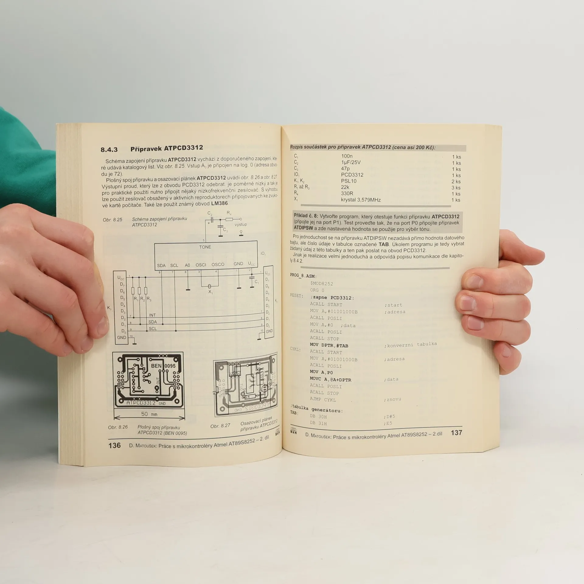 Kniha se zaměřuje na mikrořadič AT89S8252 a nabízí více než třicet aplikací, které jsou užitečné i pro jiné typy mikrořadičů. Úvodní část stručně vysvětluje základní pojmy mikroprocesorové techniky. Následuje kapitola o vlastnostech AT89S8252 včetně sériového downloadu, což je programování přímo v systému. Třetí kapitola se věnuje konstrukci programátoru a vývojovému kitu, přičemž obsahuje i "oživovací" program, který usnadňuje práci i začátečníkům. Další kapitoly se zaměřují na vnitřní a vnější paměť, instrukční soubor a assembler. Popis programu AT8252.EXE usnadňuje vývoj aplikací. Sedmá kapitola se věnuje portům P0 až P3 a základním aplikacím jako připojení LED a spínačů. Osmá kapitola se zaměřuje na I2C obvody, jako jsou SAA1064 a PCD3312, a uvádí příklady jejich použití. Devátá kapitola popisuje přerušovací systém s příklady připojení klávesnice. Desátá kapitola se věnuje čítačům a časovačům s aplikacemi jako elektronické stopky a PWM regulátor. Jedenáctá kapitola se zaměřuje na sériový port a jednoduché připojení k počítači, včetně konstrukce stabilizovaného zdroje a impulzního generátoru. Dvanáctá kapitola popisuje pokročilé schopnosti mikrořadiče, jako je řízení spotřeby a SPI sběrnice.