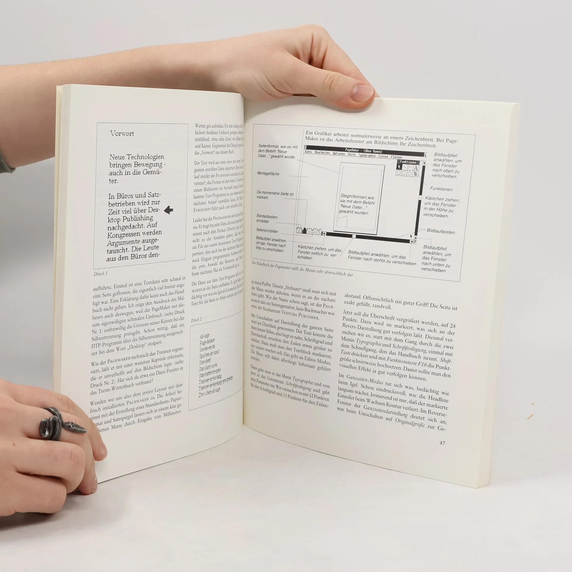 Neue Technologien bringen I Neue Tecttnologien bri en Bewegung -auch in di! In BUros und Satzbetrieben '" In BUres und SalZbetrieben wird zur Zeit 'r'iel tiber I hing nachged. acht. Auf Kongl ausgetauscht Die Leute aus den Btiros denKen. sie tauscht. Die Leute aus den Bi tfie. ben fl. irchten die neue Konkurrenz. Hoffn unc Satz billiger produzieren. Die auch in (lie Irre -Emotionen taugen nicht viel ft. ir dil die neue Konkurrenz. Hoffnu Druck 3a Druck3b Shijt/F9 gedriickt. die Seite ist nur noch weisen -den ansehnlichen Handbuchern beilag und zu zwei Dritteln voll. Geschrumpft wie das Schnitzel dem Benutzer einige Kunstfertigkeit beim Installie- von einem EG-Kalb in der Pfanne! Das Kontroll- ren von Zeichensatzen fur Matrixdrucker abverlangt Fenster im Menu Typographie bestatigt, daiS die (siehe "Die Zettelwirtschaft der DTP-Pake- Parameter richtig notiert Reduktion von te"). 12/13 Punkte auf 11/13 Punkte, sonst wurde nichts Schnell also zurUck zurn Status quo ante malheur. geandert. Das Menu zeigt auch an, daiS der Font Einmal im Menu Typographie, urn wieder auf 12/13 Times Roman normal weiter gilt. Punkte zu gelangen, andere ich auch gleich noch Hingegen macht ein Kontroll-Ausdruck deutlich, den Schnftschnitt von normal auf kursiv. Schon der was auch schon der Bildschirm der PAGE- erste Blick die Laufweiten der beiden Schrift- MAKER hat mitgestaltet. Er hat ohne Weisung einen schnitte sind gleich. Also steht auch unten wieder anderen Font nachgeladen.