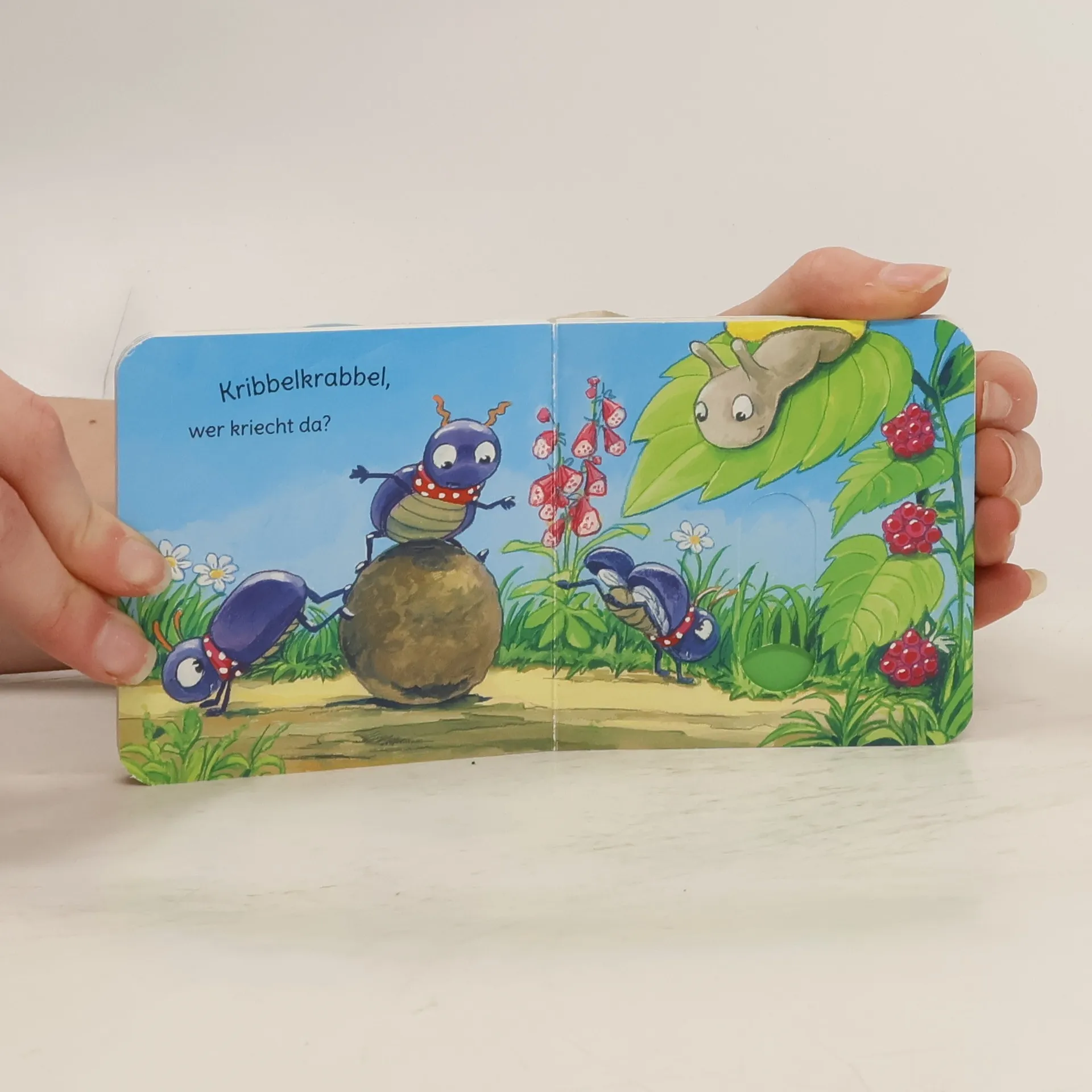 Überall krabbelt, hüpft und wuselt es, aber wer rollt dort die Kugel über die Wiese und wer schüttelt die Regentropfen vom Grashalm? Lustige Schieber verraten es und machen dieses Buch zu einem großen Spaß für kleine Entdecker!