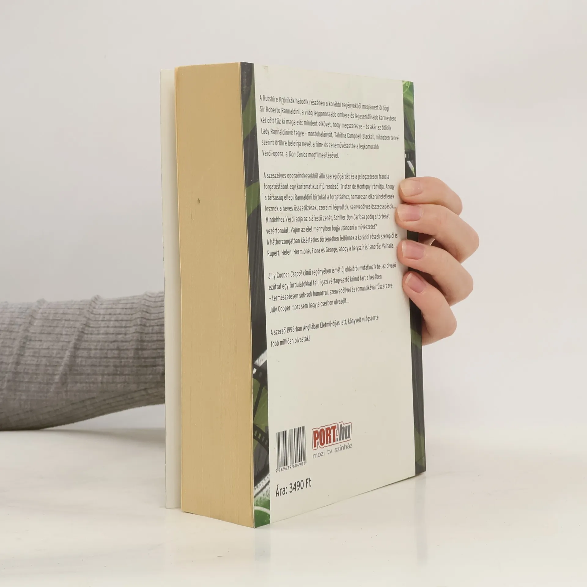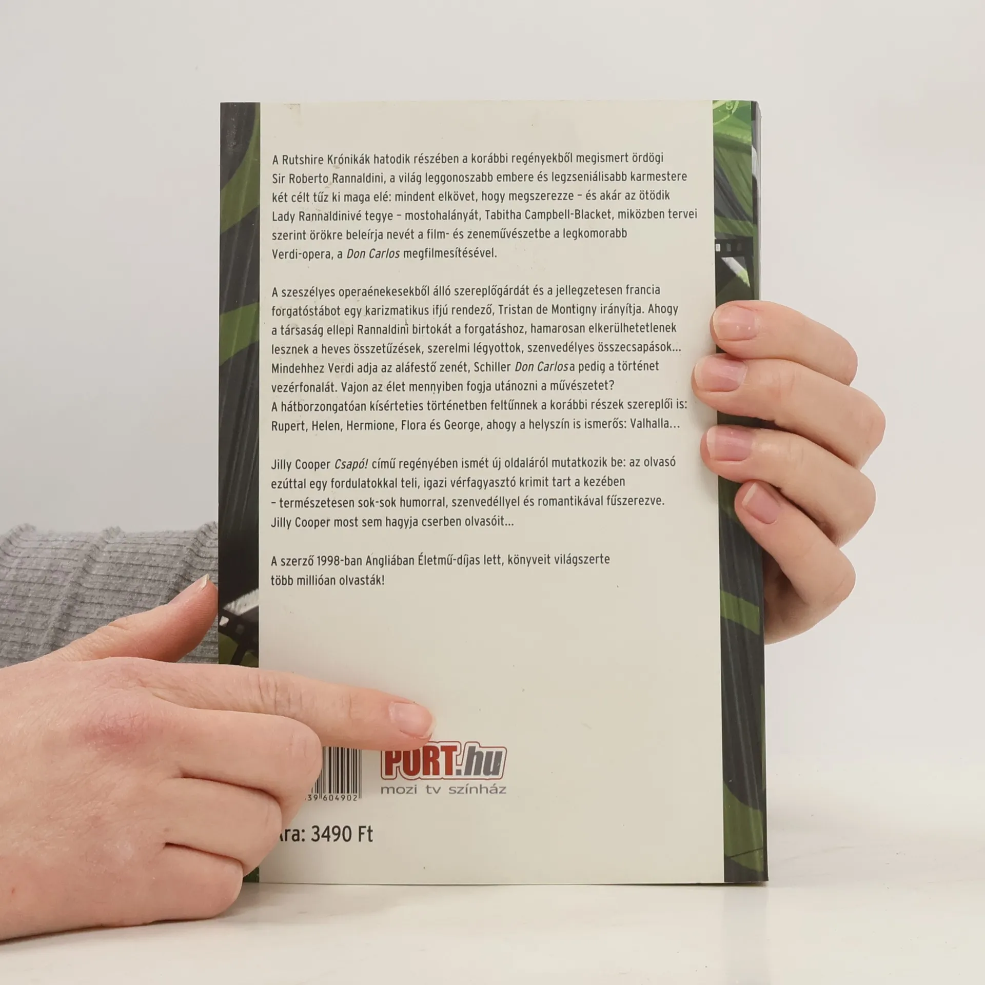A Rutshire Krónikák hatodik részében a korábbi regényekből megismert ördögi Sir Roberto Rannaldini, a világ leggonoszabb embere és legzseniálisabb karmestere két célt tűz ki maga elé: mindent elkövet, hogy megszerezze – és akár az ötödik Lady Rannaldinivé tegye – mostohalányát, Tabitha Campbell-Blacket, miközben tervei szerint örökre beleírja nevét a film- és zeneművészetbe a legkomorabb Verdi-opera, a Don Carlos megfilmesítésével. A szeszélyes operaénekesekből álló szereplőgárdát és a jellegzetesen francia forgatóstábot egy karizmatikus ifjú rendező, Tristan de Montigny irányítja. Ahogy a társaság ellepi Rannaldini birtokát a forgatáshoz, hamarosan elkerülhetetlennek lesznek a heves összetűzések, szerelmi légyottok, szenvedélyes összecsapások… Mindehhez Verdi adja az aláfestő zenét, Schiller Don Carlosa pedig a történet vezérfonalát. Vajon az élet mennyiben fogja utánozni a művészetet? A hátborzongatóan kísérteties történetben feltűnnek a korábbi részek szereplői is: Rupert, Helen, Hermione, Flora és George, ahogy a helyszín is ismerős: Valhalla… Jilly Cooper Csapó! című regényében ismét új oldaláról mutatkozik be: az olvasó ezúttal egy fordulatokkal teli, igazi vérfagyasztó krimit tart a kezében – természetesen sok-sok humorral, szenvedéllyel és romantikával fűszerezve. Jilly Cooper most sem hagyja cserben olvasóit… A szerző 1998-ban Angliában Életmű-díjas lett, könyveit világszerte több millióan olvasták!