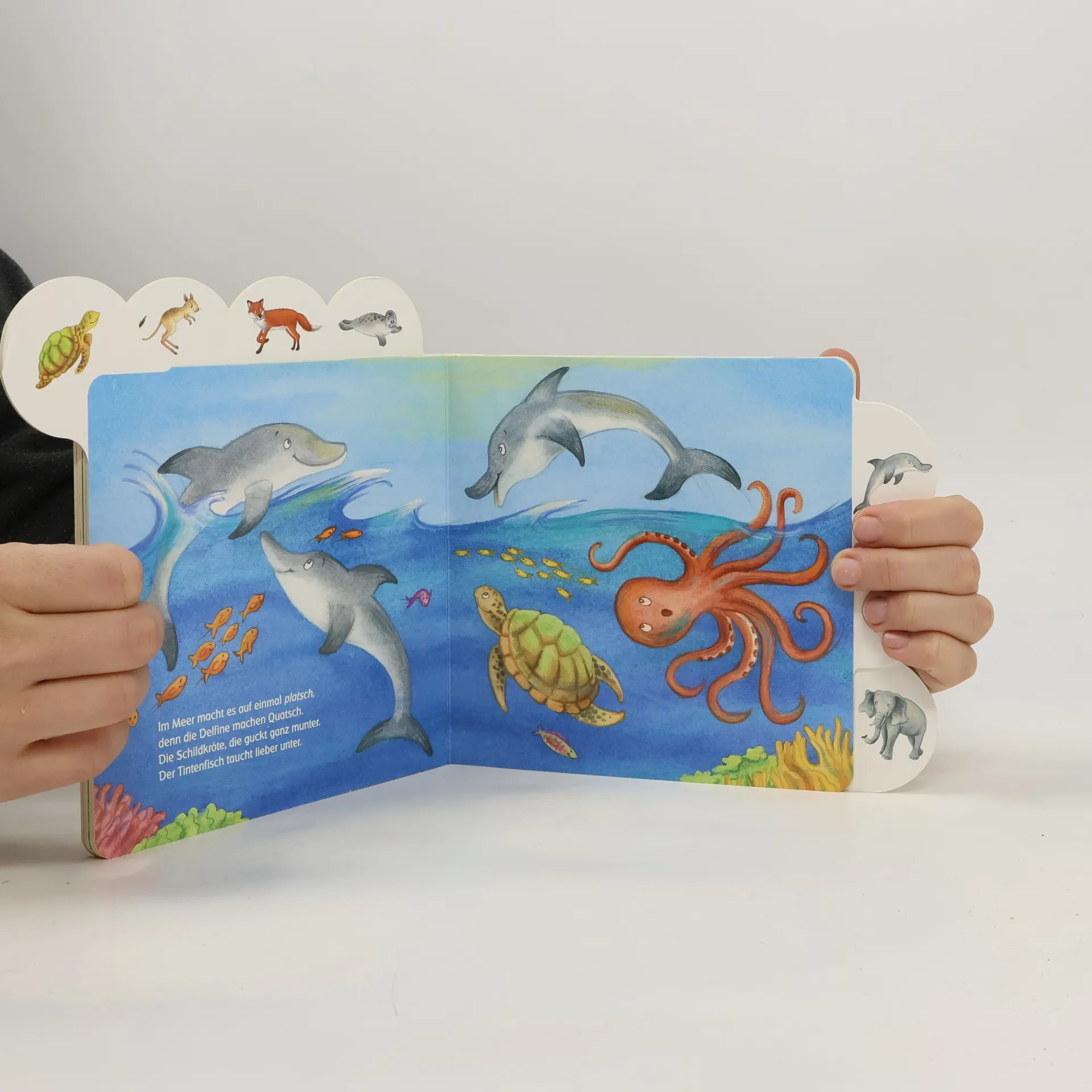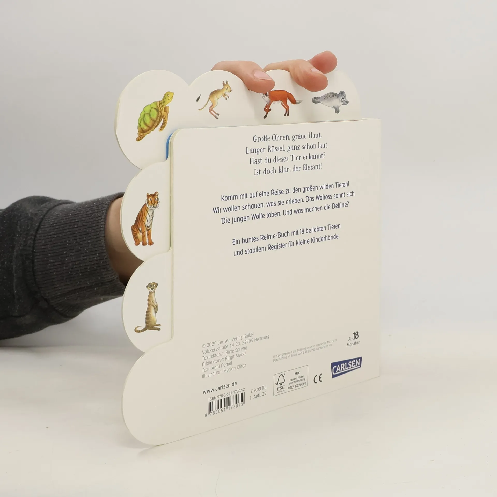Erste Bilder und Reime zu Tieren aus nah und fern! Das große Walross sonnt sich. Die wilden Wölfe toben. Und was machen die Delfine? Das und noch viel mehr erfahren kleine Tierfans ab 18 Monaten in diesem farbenfrohen Buch. Insgesamt 18 beliebte Tiere werden vorgestellt. Die stabilen Register und eingängigen Reime laden zum Blättern und Mitsprechen ein.