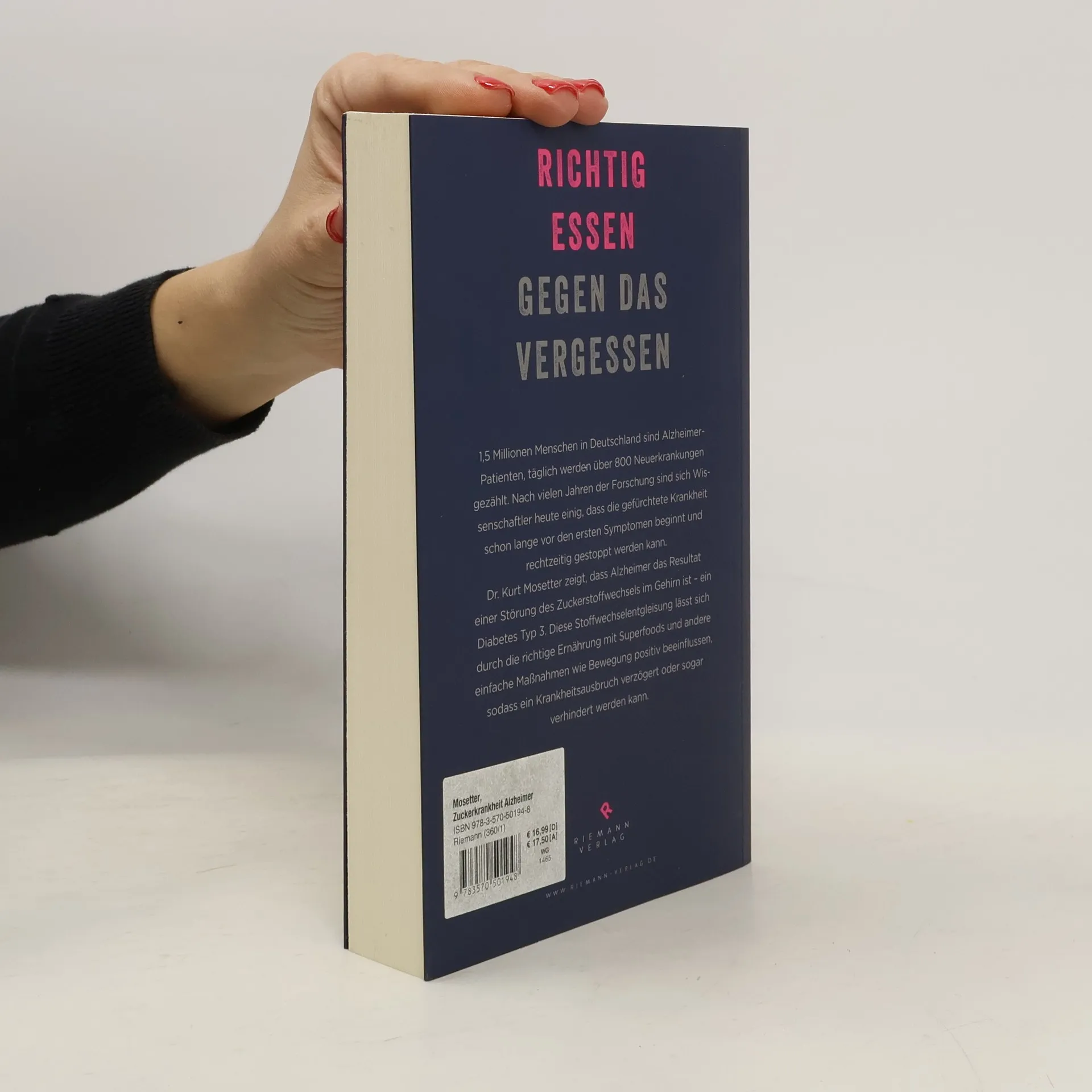 Richtig essen gegen das Vergessen In 100 Jahren hat sich die Alzheimer-Krankheit von einem Randphänomen zu einem weltweiten Gesellschaftsproblem entwickelt. Seit Mediziner versuchen, die Erkrankung zu behandeln, erleben sie eine Enttäuschung nach der anderen. Heute sind sich Wissenschaftler einig, dass die Krankheit schon lange vor den ersten Symptomen beginnt. Dr. Kurt Mosetter zeigt, dass Alzheimer als Resultat einer Störung des Insulinsystems zu sehen ist – ein Diabetes mellitus Typ 3. Diese Stoffwechselentgleisung lässt sich durch die richtige Ernährung und andere einfache Maßnahmen positiv beeinflussen, sodass ein Krankheitsausbruch verzögert oder sogar verhindert werden kann.