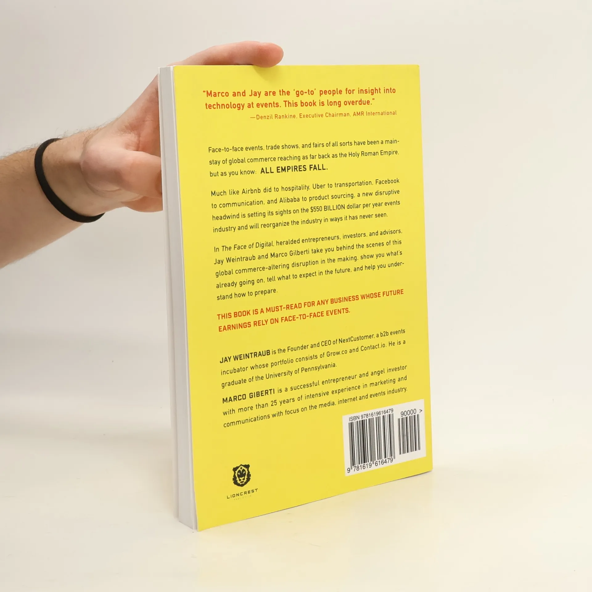 Face-to-face events, trade shows, and fairs of all sorts have been a main- stay of global commerce reaching as far back as the Holy Roman Empire, but as you all empires fall. Much like Airbnb did to hospitality, Uber to transportation, Facebook to communication, and Alibaba to product sourcing, a new disruptive headwind is setting its sights on the $550 billion dollar per year events industry and will reorganize the industry in ways it has never seen. In The Face of Digital , heralded entrepreneurs, investors, and advisors, Jay Weintraub and Marco Gilberti take you behind the scenes of this global commerce-altering disruption in the making, show you what’s already going on, tell what to expect in the future, and help you under- stand how to prepare. This book is a must-read for any business whose future earnings rely on face-to-face events.