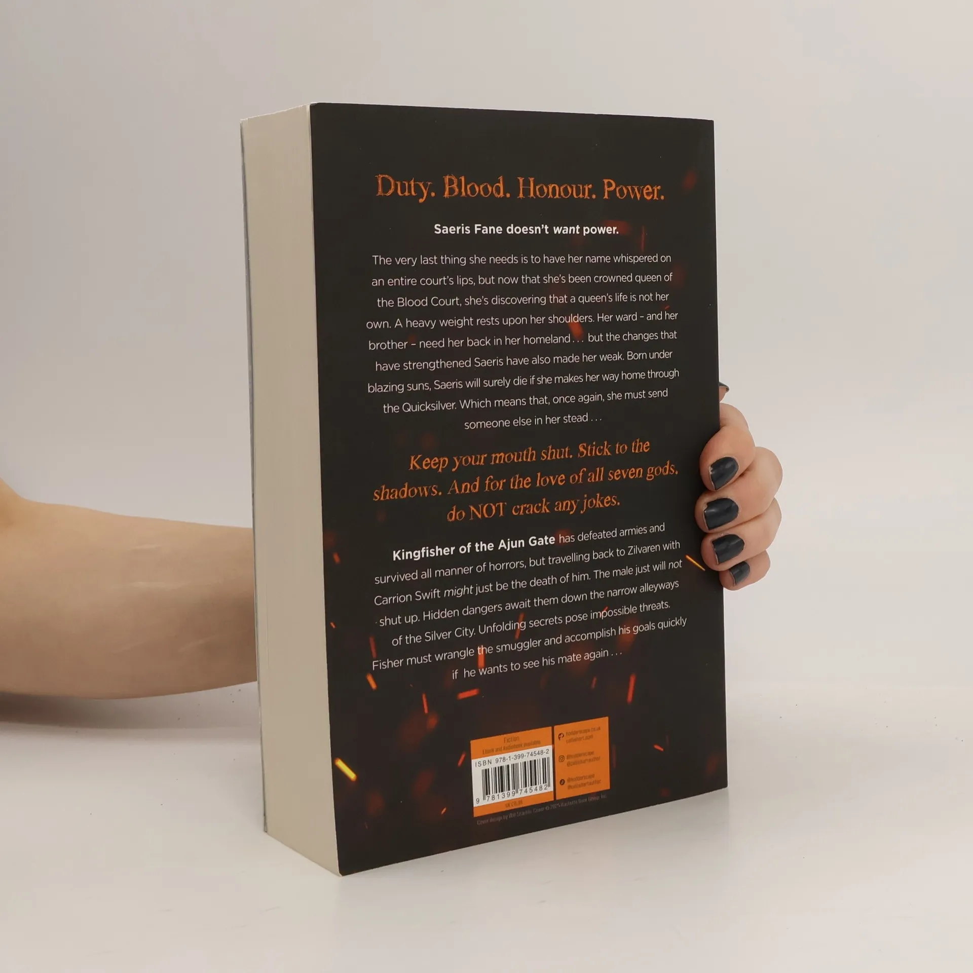 Duty. Blood. Honour. Power.Saeris Fane doesn't want power. The very last thing she needs is her name whispered on an entire court's lips, but now that she's been crowned queen of the Blood Court, she's discovering that a queen's life is not her own. A heavy weight rests upon her shoulders.Her ward - and her brother - need her back in her homeland . . . but the changes that have strengthened Saeris have also made her weak. Born under blazing suns, Saeris will surely die if she makes her way home through the Quicksilver. Which means that, once again, she must send someone else in her stead . . .'Keep your mouth shut. Stick to the shadows. And for the love of all seven Gods, do NOT crack any jokes.'Kingfisher of the Ajun Gate has defeated armies and survived all manner of horrors, but traveling back to Zilvaren with Carrion Swift might just be the death of him. The male just will not shut up. Hidden dangers await them down the narrow alleyways of the Silver City. Unfolding secrets pose impossible threats. Fisher must wrangle the smuggler and accomplish his goals quickly if he wants to see his mate again.A darkness falls across Yvelia. The realm and their friends are in danger. Together, Saeris and Fisher will pass through fire and brimstone to save them.