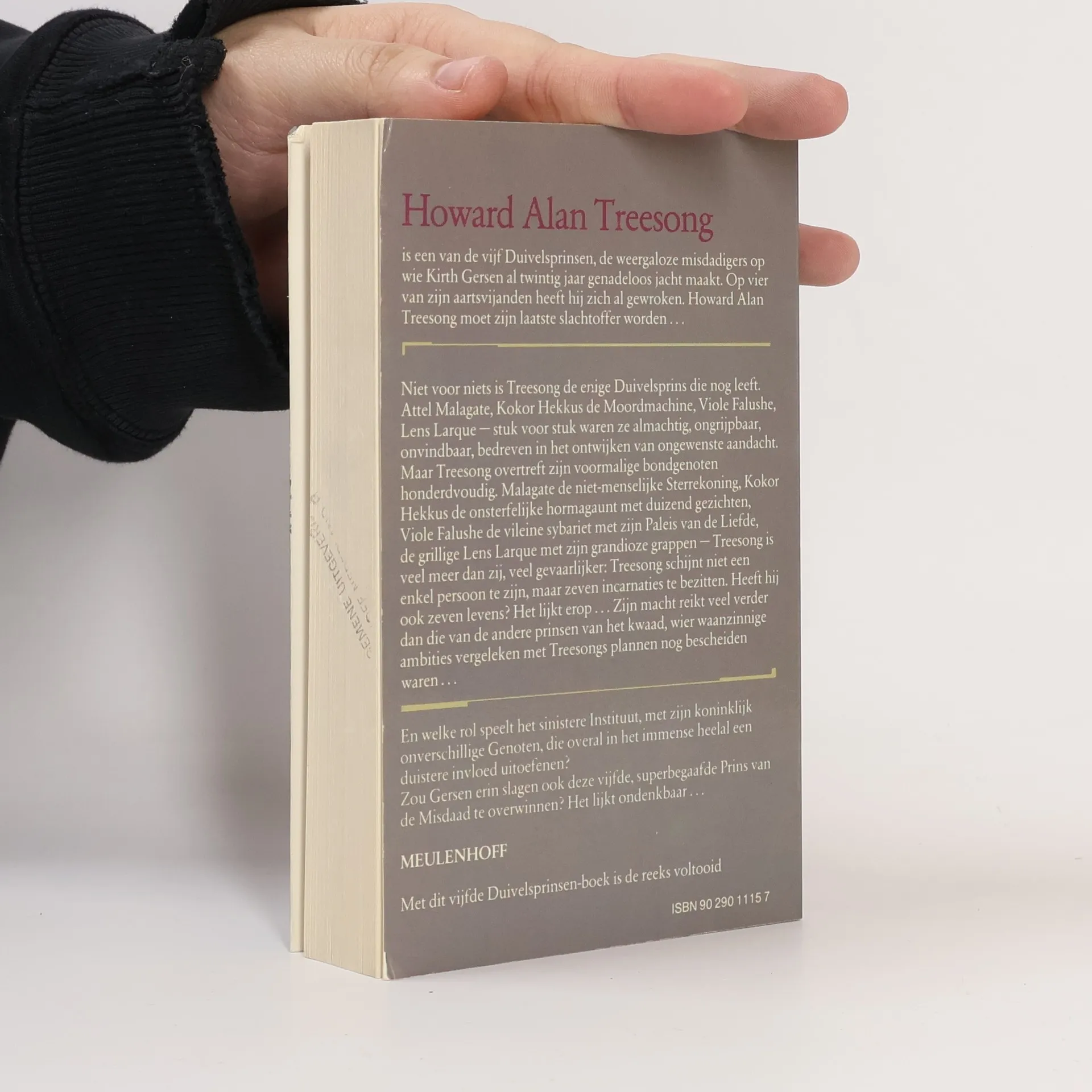 Howard Alan Treesong is een van de vijf Duivelsprinsen, de weergaloze misdadigers op wie Kirth Gersen al twintig jaar genadeloos jacht maakt. Op vier van zijn aartsvijanden heeft hij zich al gewroken. Howard Alan Treesong moet zijn laatste slachtoffer worden... Niet voor niets is Treesong de enige Duivelsprins die nog leeft. Attel Malagate, Kokor Hekkus de Moordmachine, Viole Falushe, Lens Larque - stuk voor stuk waren ze almachtig, ongrijpbaar, onvindbaar, bedreven in het ontwijken van ongewenste aandacht. Maar Treesong overtreft zijn voormalige bondgenoten honderdvoudig. Malagate de niet-menselijke Sterrekoning, Kokor Hekkus de onsterfelijke hormagaunt met duizend gezichten, Viole Falushe de vileine sybariet met zijn Paleis van de Liefde, de grillige Lens Larque met zijn grandioze grappen - Treesong is veel meer dan zij, veel gevaarlijker: Treesong schijnt niet een enkel persoon te zijn, maar zeven incarnaties te bezitten. Heeft hij ook zeven levens? Het lijkt erop... Zijn macht reikt veel verder dan die van de andere prinsen van het kwaad, wier waanzinnige ambities vergeleken met Treesongs plannen nog bescheiden waren... En welke rol speelt het sinistere Instituut, met zijn koninklijk onverschillige Genoten, die overal in het immense heelal een duistere invloed uitoefenen? Zou Gersen erin slagen ook deze vijfde, superbegaafde Prins van de Misdaad te overwinnen? Het lijkt ondenkbaar...