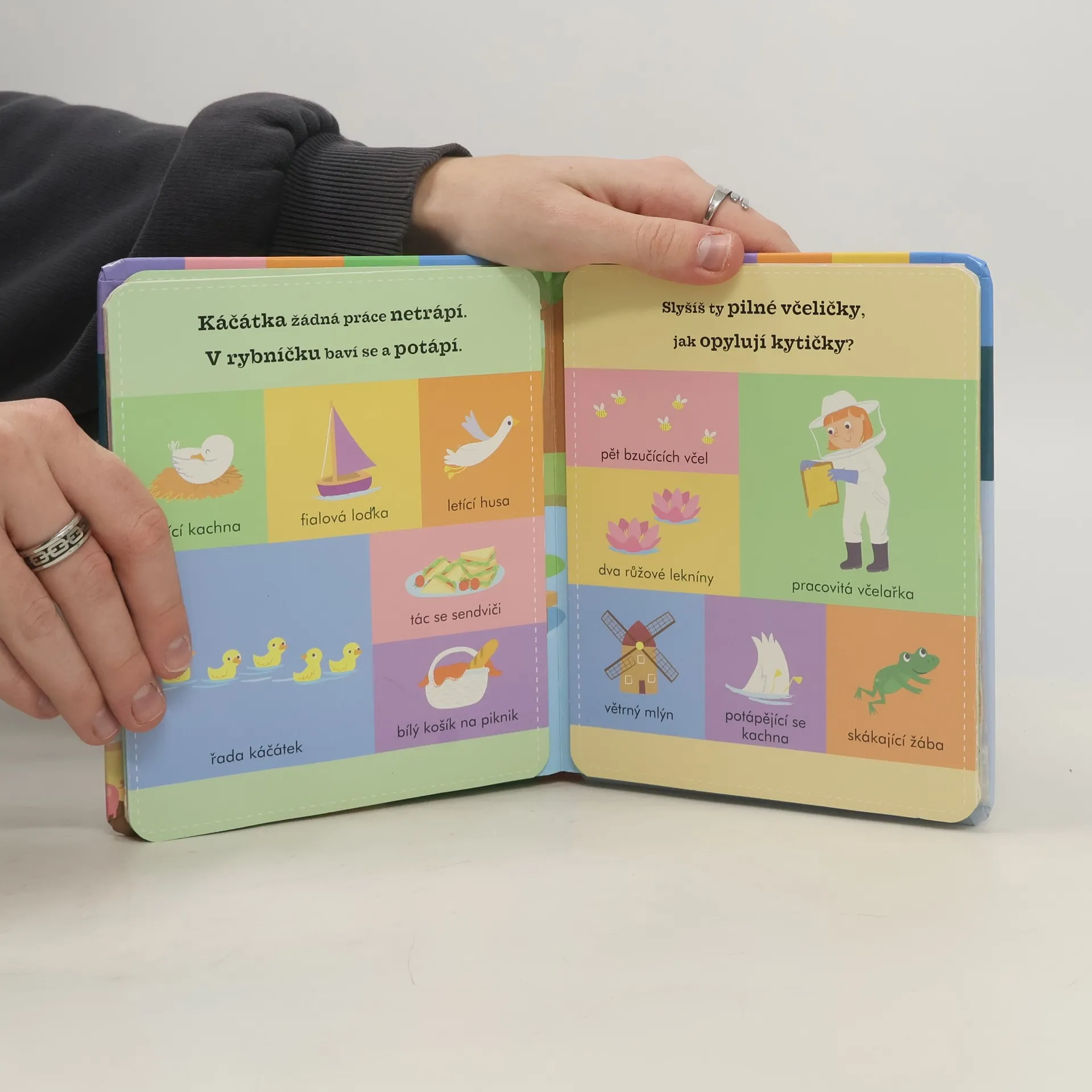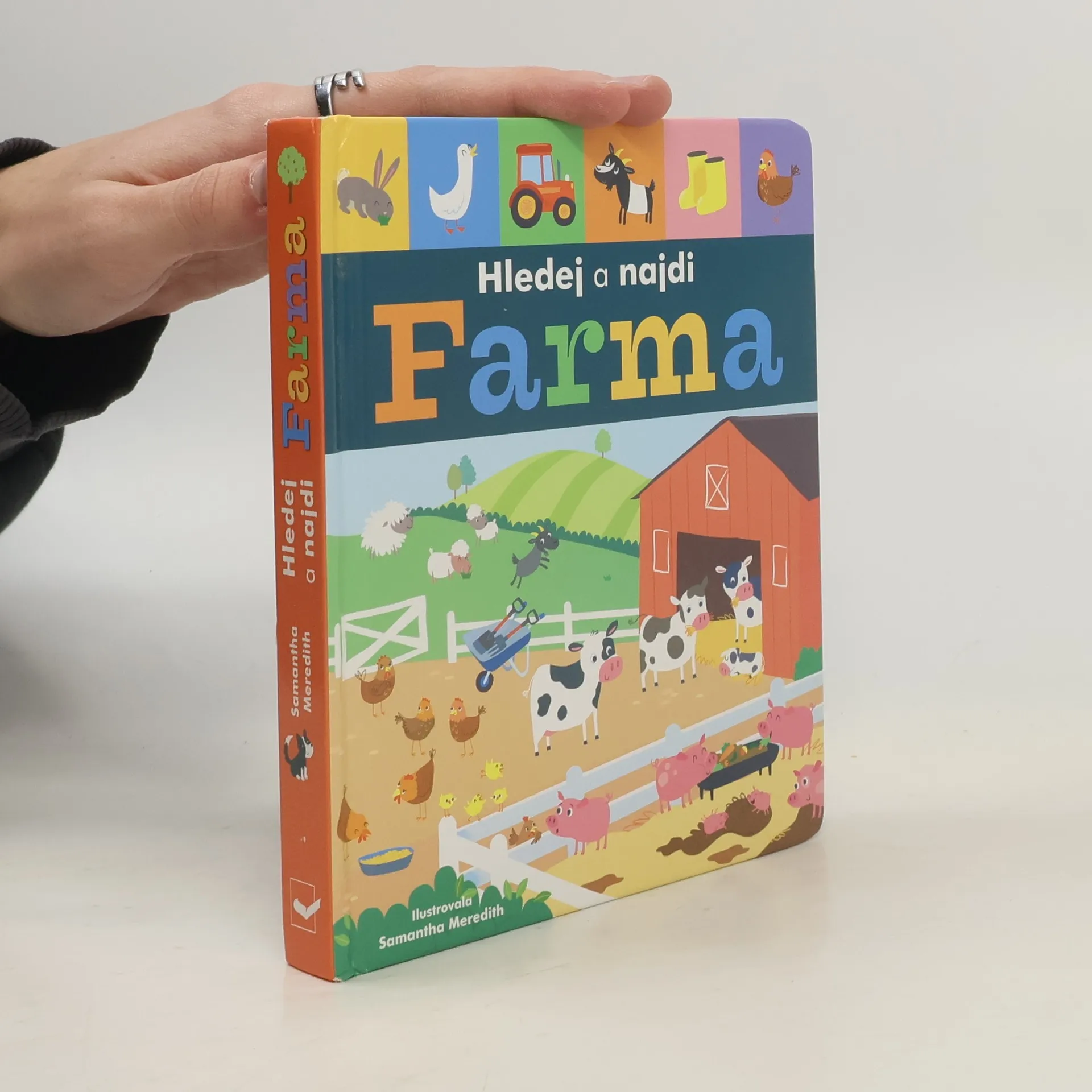 Obrázková knížka doplněná krátkými veršíky představuje hravou formou dění na statku. Pod každým obrázkem je popis zvířat nebo věcí, které mají děti po otevření dvojlistu nalézt. Jaký pěkný pohled na zahrádku zelenina roste v každém řádku! Na farmě je toho mnoho k nalezení. Dokážeš najít spící tele, koně skákajícího přes překážky a kokrhajícího kohouta? Všichni se ukrývají v barevných obrázcích z farmy. Hledej a najdi různé věci a tvory v knížce s pevnými rozkládacími stránkami a milými verši! Kartonové listy v pevné vazbě.