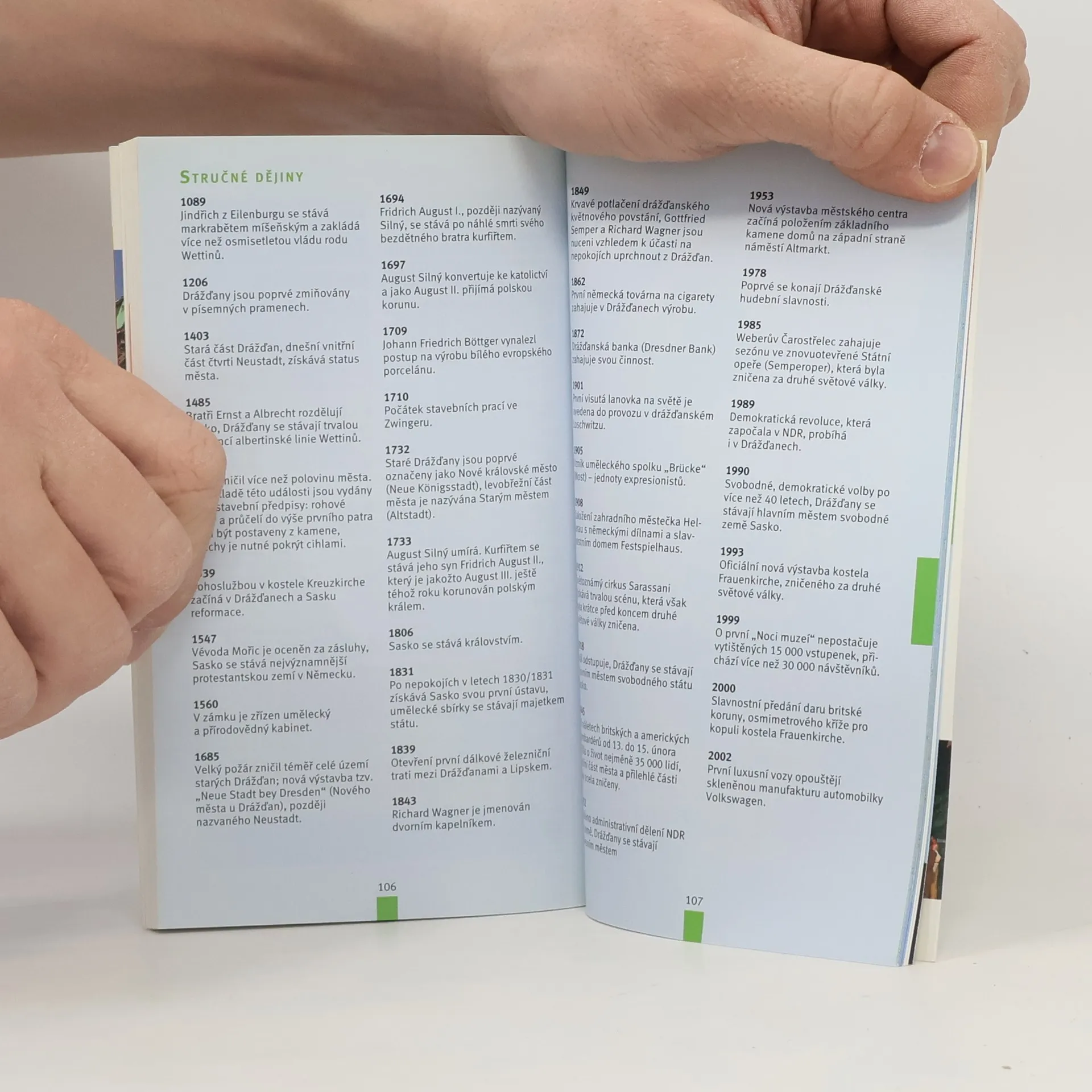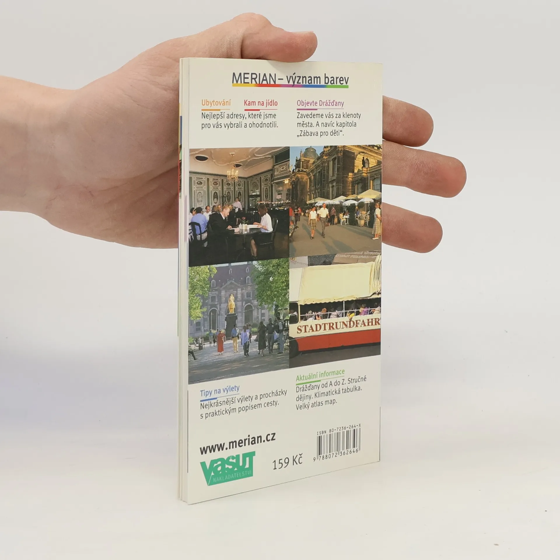 Cestovní příručka ediční řady "Merian" přináší popis architektonických a kulturně-uměleckých pozoruhodností "Florencie na Labi", hlavního a největšího města německého Saska. Popsána jsou všechna turisty navštěvovaná místa, a to jak v centru města, tak v okrajových čtvrtích (Zwinger, Semperoper, Rezidenzschloss, Brühl-Terassen, zámek Pillnitz, vilová čtvrť Weisser Hirsch...). Nechybí popis atraktivních cílů v okolí města - namátkou lze uvést např. pískovcová skalní města Saského Švýcarska, historická Míšeň, lovecký zámek Morizburg, muzeum Karla Maye v Radebeulu. Svazek doplňují praktické informace o možnostech ubytování, stravování, nákupů nebo kulturního vyžití. Text doplňují barevné fotografie a plán města ve formě atlasu. Průvodce seznamuje s nejvýznamnějšími kulturně-uměleckými památkami a jinými zajímavostmi saské metropole a atraktivními cíli v okolí.