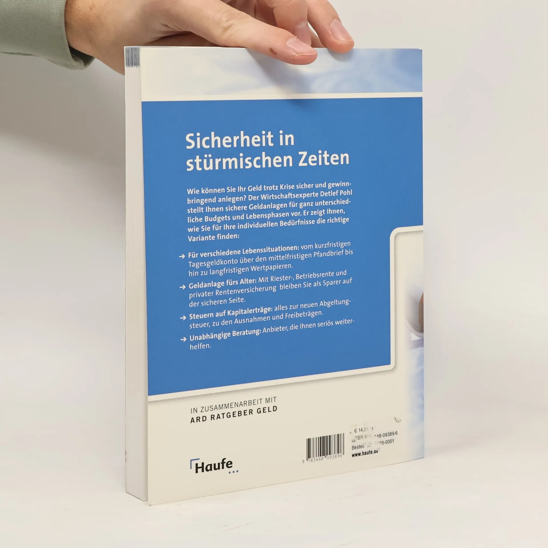 Wie können Sie Ihr Geld trotz Krise sicher und gewinnbringend anlegen? Detlef Pohl stellt Ihnen für ganz unterschiedliche Budgets und Lebensphasen sichere Geldanlagen vor. So finden Sie die für Ihre individuellen Bedürfnisse richtige Variante. INHALTE: - Für verschiedene Lebenssituationen: vom kurzfristigen Tagesgeldkonto über den mittelfristigen Pfandbrief bis hin zu langfristigen Wertpapieren. - Geldanlage fürs Alter: Mit Riester-, Betriebsrente und privater Rentenversicherung bleiben Sie als Sparer auf der sicheren Seite. - Steuern auf Kapitalerträge: alles zur neuen Abgeltungsteuer, zu den Ausnahmen und Freibeträgen. - Unabhängige Beratung: Anbieter, die Ihnen seriös weiterhelfen.