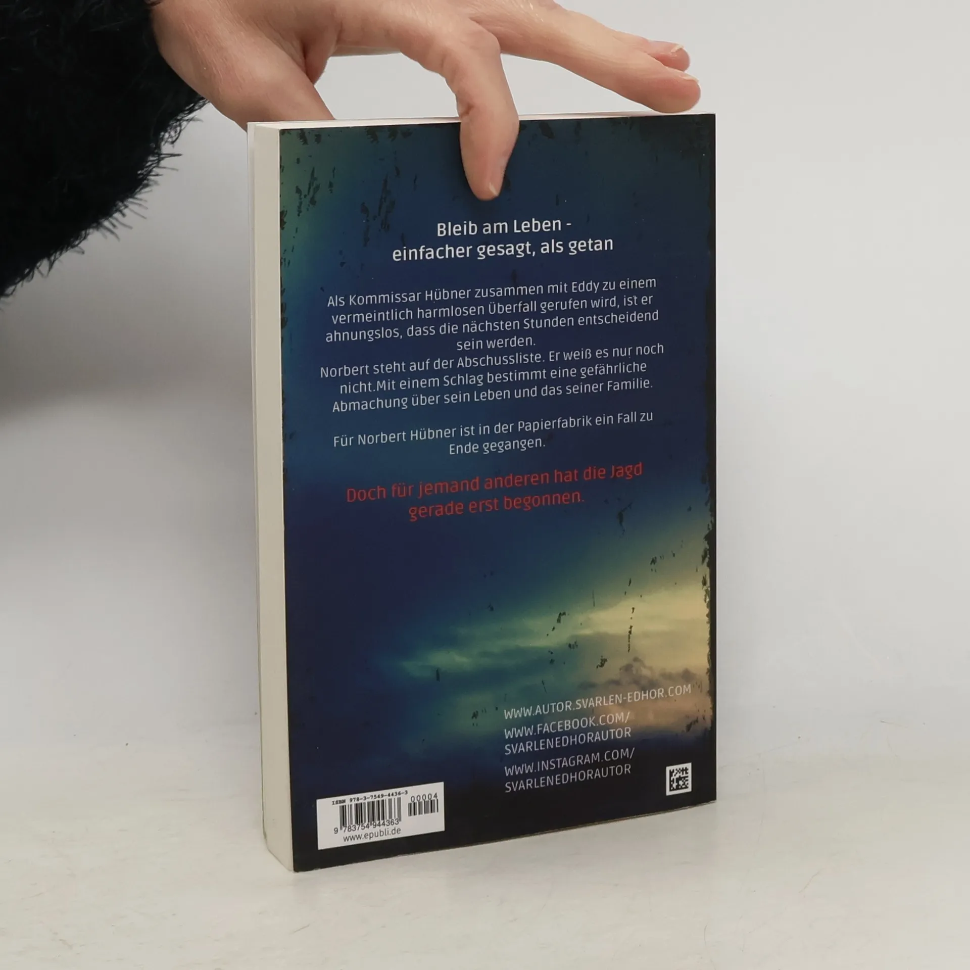 Ausgabe für den Covergestaltung = matt, Format = 12 x 19 cmDer vierte Fall für Kommissar Norbert Hübner und sein wohl bislang gefährlichster!Bleib am Leben - einfacher gesagt, als getanAls Kommissar Hübner zusammen mit Eddy zu einem vermeintlich harmlosen Überfall gerufen wird, ist er ahnungslos, dass die nächsten Stunden entscheidend sein werden.Norbert steht auf der Abschussliste. Er weiß es nur noch nicht. Mit einem Schlag bestimmt eine gefährliche Abmachung über sein Leben und das seiner Familie.Für Norbert Hübner ist in der Papierfabrik ein Fall zu Ende gegangen.Doch für jemand anderen hat die Jagd gerade erst begonnen.