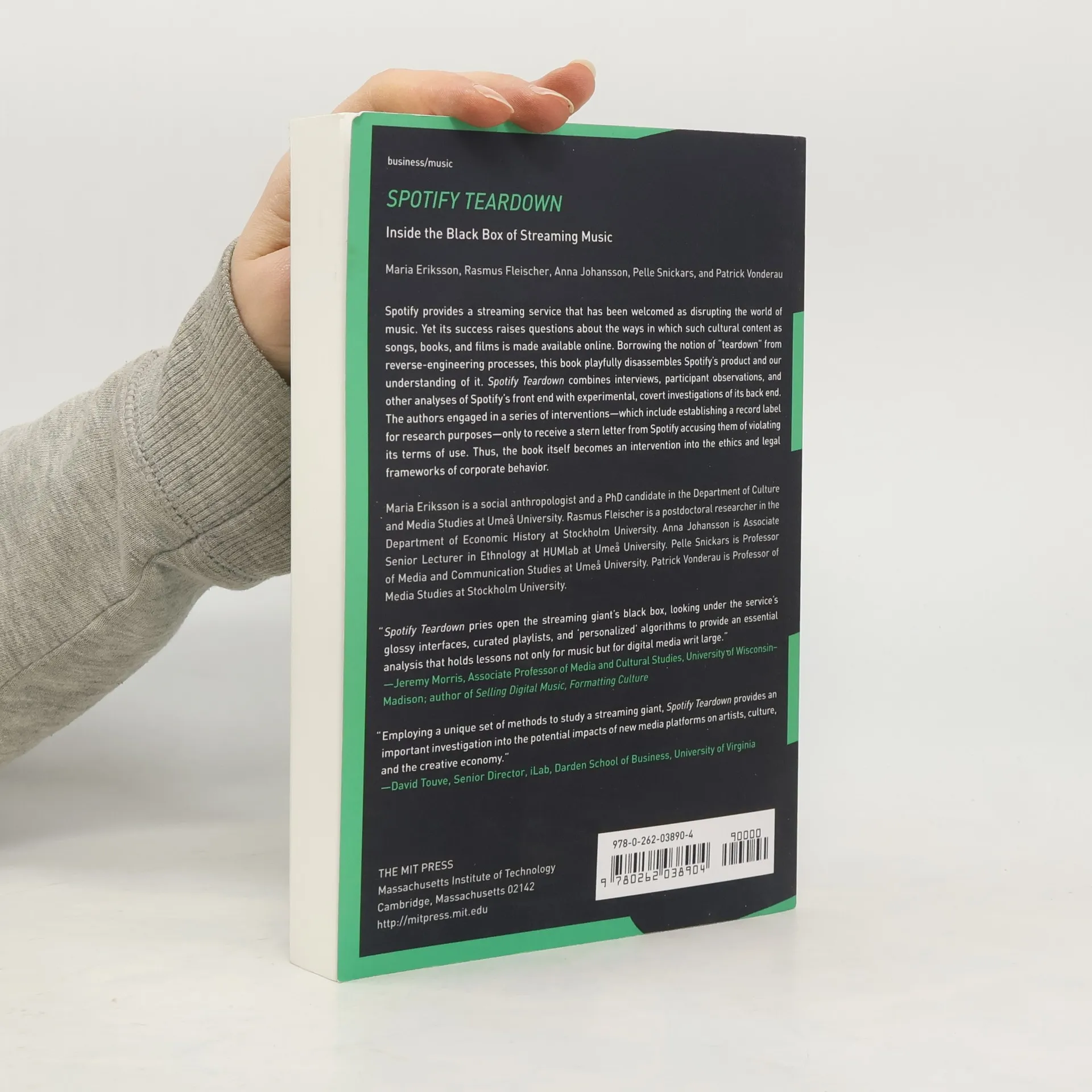 An innovative investigation of the inner workings of Spotify that traces the transformation of audio files into streamed experience. Spotify provides a streaming service that has been welcomed as disrupting the world of music. Yet such disruption always comes at a price. Spotify Teardown contests the tired claim that digital culture thrives on disruption. Borrowing the notion of “teardown” from reverse-engineering processes, in this book a team of five researchers have playfully disassembled Spotify's product and the way it is commonly understood. Spotify has been hailed as the solution to illicit downloading, but it began as a partly illicit enterprise that grew out of the Swedish file-sharing community. Spotify was originally praised as an innovative digital platform but increasingly resembles a media company in need of regulation, raising questions about the ways in which such cultural content as songs, books, and films are now typically made available online. Spotify Teardown combines interviews, participant observations, and other analyses of Spotify's “front end” with experimental, covert investigations of its “back end.” The authors engaged in a series of interventions, which include establishing a record label for research purposes, intercepting network traffic with packet sniffers, and web-scraping corporate materials. The authors' innovative digital methods earned them a stern letter from Spotify accusing them of violating its terms of use; the company later threatened their research funding. Thus, the book itself became an intervention into the ethics and legal frameworks of corporate behavior.