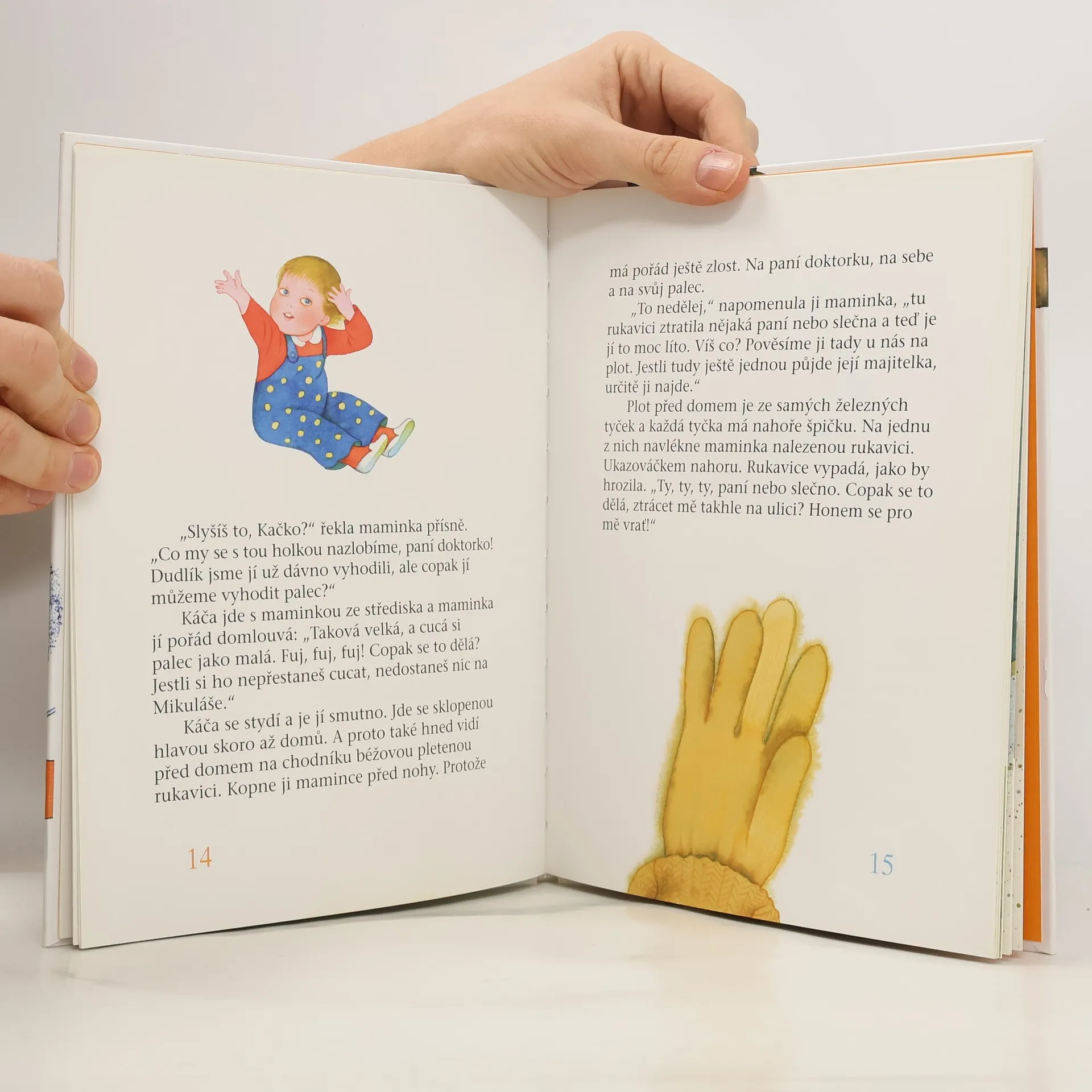 Knížka pro začínající čtenáře vypráví o malé Kačence, která našla na ulici ztracenou špinavou rukavici. Maminka ji vyprala a vykouzlila z ní báječné překvapení... které si děti s pomocí dospělého mohou doma snadno také vyrobit.