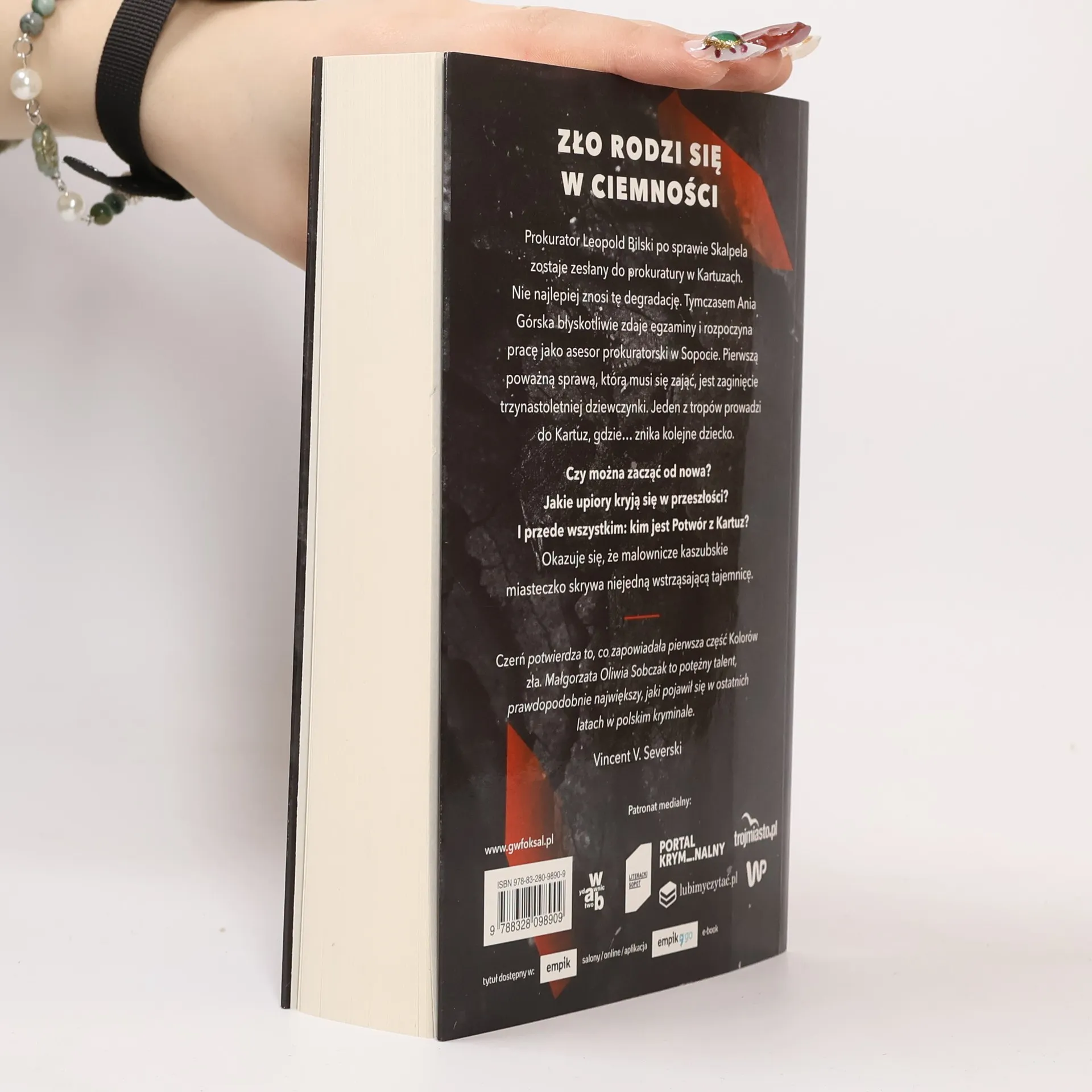 "Prokurator Leopold Bilski po sprawie Skalpela zostaje zesłany do prokuratury w Kartuzach. Nie najlepiej znosi tę degradację. Tymczasem Ania Górska błyskotliwie zdaje egzaminy i rozpoczyna pracę jako asesor prokuratorski w Sopocie. Pierwszą poważną sprawą, którą musi się zająć, jest zaginięcie trzynastoletniej dziewczyny. Jeden z tropów prowadzi do Kartuz, gdzie... znika kolejne dziecko." -- Page four of cover.