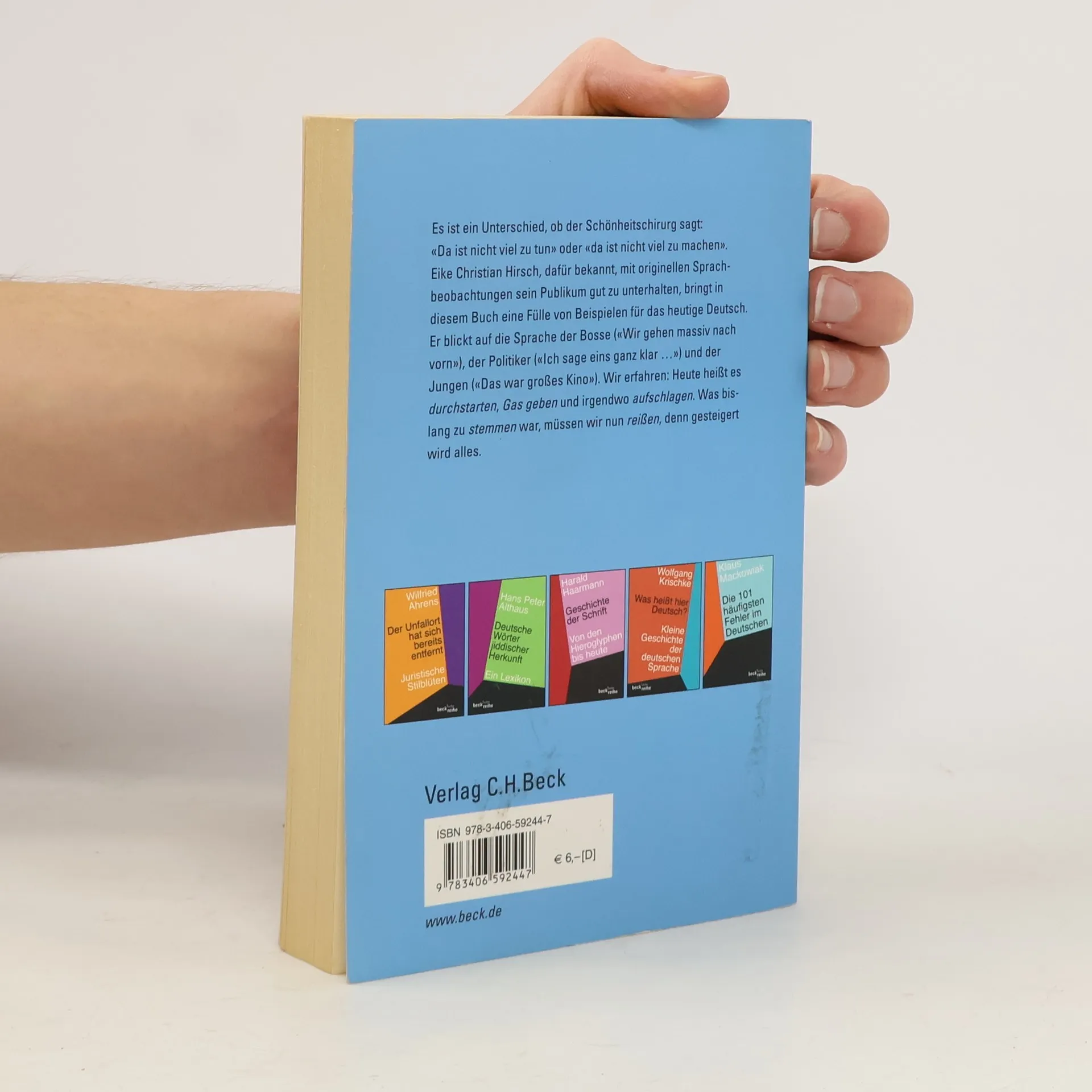 Es ist ein Unterschied, ob der Schönheitschirurg sagt: «Da ist nicht viel zu tun» oder «Da ist nicht viel zu machen». Eike Christian Hirsch, dafür bekannt, mit originellen Sprachbeobachtungen sein Publikum gut zu unterhalten, bringt in diesem Buch eine Fülle von Beispielen für das heutige Deutsch. Er blickt auf die Sprache der Bosse («Wir gehen massiv nach vorn»), der Politiker («Ich sage eins ganz klar ...) und der Jungen («Das war großes Kino»). Wir erfahren: Heute heißt es durchstarten, Gas geben und irgendwo aufschlagen. Was bislang zu stemmen war, müssen wir nun reißen, denn gesteigert wird alles.